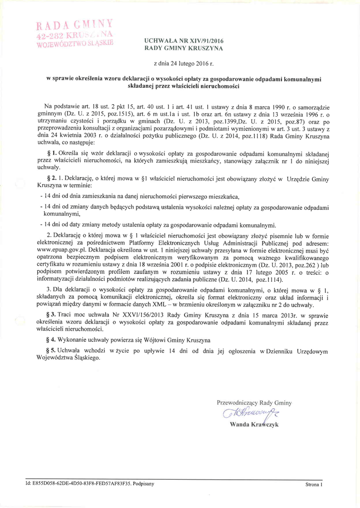 Załącznik nr 1 do Uchwały Nr XIV/91/2016 Rady Gminy Kruszyna z dnia 24 lutego 2016r. DEKLARACJA O WYSOKOŚCI OPŁATY ZA GOSPODAROWANIE ODPADAMI KOMUNALNYMI Z NIERUCHOMOŚCI W GMINIE KRUSZYNA, NA KTÓRYCH ZAMIESZKUJĄ MIESZKAŃCY Podstawa prawna: ustawa z 13 września 1996r. o utrzymaniu czystości i porządku w gminach (Dz. U. z 2013, poz. 1399, poz. 1593, z 2015r. poz.87) Składający: właściciel nieruchomości art. 2 ust. 1 pkt. 4 ustawy Miejsce składania: Urząd Gminy Kruszyna, ul. Kmicica 5, 42-282 Kruszyna, pok. 6A lub drogą elektroniczną Pierwszy termin składania: 14 dni od dnia zamieszkania na danej nieruchomości pierwszego mieszkańca, 14 dni od dnia, w którym nastąpiła zmiana danych określonych w poprzednio złożonej deklaracji, 14 dni od daty zmiany metody ustalenia opłaty za gospodarowanie odpadami komunalnymi. A. ORGAN WŁAŚCIWY DO ZŁOŻENIA DEKLARACJI Nazwa i adres siedziby organu, do którego należy złożyć deklarację: WÓJT GMINY KRUSZYNA UL. KMICICA 5 42-282 KRUSZYNA B. OBOWIĄZEK ZŁOŻENIA DEKLARACJI 1. Cel złożenia deklaracji (zaznaczyć właściwy kwadrat poprzez postawienie znaku ,, x”) □ pierwsza deklaracja obowiązująca od …………………………………………( dzień – miesiąc – rok ) □ zmiana danych w deklaracji od dnia ……………………….( dzień – miesiąc – rok ) □ korekta poprzedniej deklaracji od ……………………………………….( dzień – miesiąc – rok ) Uzasadnienie konieczności złożenia zmiany/korekty deklaracji: ………………………………………………………………………………………………………………… ………………………………………………………………………………………………………………… ………………………………………………………………………………………………………………… C. SKŁADAJĄCY DEKLARACJĘ 2. Rodzaj podmiotu ( zaznaczyć właściwy kwadrat poprzez postawienie znaku ,,x‘’ ) □ Właściciel □ Współwłaściciel □ Zarządca □ Najemca □ Dzierżawca □ Lokator □ Jednostka organizacyjna lub osoba posiadająca nieruchomość w zarządzie □ Jednostka organizacyjna lub osoba posiadająca nieruchomość w użytkowaniu D. DANE IDENTYFIKACYJNE D.1. Osoba fizyczna 3. Nazwisko 4. Imię 5. Data urodzenia 6. Telefon* 7. Imię ojca 8. Imię matki 9. Pesel 10. Adres e-mail* D.2. Pozostałe podmioty Id: 7BEB86F0-230F-4D38-AD41-B24D58524AB3. Podpisany Strona 1 11. Imię i nazwisko/ Pełna nazwa 12. NIP 13. REGON 14. Telefon D.3. Adres zamieszkania/ Adres siedziby 15. Kraj 16. Województwo 17. Powiat 18. Gmina 19. Ulica 20. Nr domu 22. Miejscowość 23. Kod pocztowy 24. Poczta 21. Nr lokalu E. ADRES NIERUCHOMOŚCI, NA KTÓREJ POWSTAJĄ ODPADY KOMUNALNE 25. Miejscowość 26. Ulica 27. Nr domu 29. Nr ewidencyjny nieruchomości 28. Nr lokalu F. INFORMACJA O SPOSOBIE ZBIERANIA ODPADÓW 30.Oświadczam na terenie nieruchomości wskazanej w części E odpady z nieruchomości będą i odbierane w sposób selektywny: (zaznaczyć właściwy kwadrat poprzez postawienie znaku, ,x”) □ tak □ nie 31. Na terenie nieruchomości wskazanej w części E odpady ulegające biodegradacji będą składowane w przydomowym kompostowniku a uzyskany kompost będę wykorzystywać we własnym zakresie (zaznaczyć właściwy kwadrat poprzez postawienie znaku ,, x”) □ tak □ nie G. OPŁATA ZA GOSPODAROWANIE ODPADAMI KOMUNALNYMI 31. LICZBA GOSPODARSTW DOMOWYCH ( należy podać liczbę gospodarstw domowych na danej nieruchomości – wg poniższego podziału ) gospodarstwo domowe 1 – 3 osoby …………………………… gospodarstwo domowe 4 – 6 osób …………………………… gospodarstwo domowe powyżej 6 osób ………………………. 33. WYSOKOŚĆ MIESIĘCZNEJ OPŁATY WYNOSI: poz.1……………………………… (liczba gospodarstw domowych na danej nieruchomości ) X ……………………………ZŁ = ……….............ZŁ stawka opłaty od gospodarstwa ( zgodnie z uchwałą Rady Gminy) (liczba gospodarstw domowych na danej nieruchomości ) stawka opłaty od gospodarstwa ( zgodnie z uchwałą Rady Gminy ……………………………..ZŁ = ……………….ZŁ poz.3………………………………… X .……………………………..ZŁ = ……………….ZŁ poz.2………………………………… X (liczba gospodarstw domowych na danej nieruchomości ) stawka opłaty od gospodarstwa ( zgodnie z uchwałą Rady Gminy RAZEM = ……………………...ZŁ słownie złotych:……………………………………………………… (dodać: poz.1+poz.2+poz.3) OPŁATA KWARTALNA : (kwotę z poz. 33 należy pomnożyć przez 3 miesiące) .....................................ZŁ słownie złotych :…………………………………………………………………. H. PODPIS OSOBY SKŁADAJĄCEJ DEKLARACJĘ Data Id: 7BEB86F0-230F-4D38-AD41-B24D58524AB3. Podpisany Czytelny podpis (z podaniem imienia i nazwiska) Strona 2 POUCZENIE Niniejsza deklaracja stanowi podstawę do wystawienia tytułu wykonawczego, zgodnie z przepisami ustawy z dnia 17 czerwca 1966 r. o postępowaniu egzekucyjnym w administracji (Dz. U. z 2014 r. poz. 1619 z późn. zm.). Zgodnie z art. 6m ustawy z 13 września 1996 r. o utrzymaniu czystości i porządku w gminach właściciel nieruchomości jest obowiązany złożyć do wójta, burmistrza lub prezydenta miasta deklarację o wysokości opłaty za gospodarowanie odpadami komunalnymi w terminie 14 dni od dnia zamieszkania na danej nieruchomości pierwszego mieszkańca lub powstania na danej nieruchomości odpadów komunalnych. W przypadku zmiany danych będących podstawą ustalenia wysokości należnej opłaty za gospodarowanie odpadami komunalnymi właściciel nieruchomości jest obowiązany złożyć nową deklarację w terminie 14 dni od dnia nastąpienia zmiany. Opłatę za