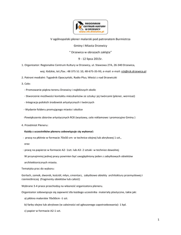 V ogólnopolski plener malarski pod patronatem Burmistrza Gminy i Miasta Drzewicy “ Drzewica w obrazach zaklęta” 9 - 12 lipca 2015r. 1. Organizator: Regionalne Centrum Kultury w Drzewicy, ul. Stawowa 27A, 26-340 Drzewica, woj. łódzkie, tel./fax.: 48 375 51 10, 48-675-35-93, e-mail: e-mail: [email protected] 2. Patroni medialni: Tygodnik Opoczyński, Radio Plus; Wieści z nad Drzewiczki 3. Cele: - Promowanie piękna terenu Drzewicy i najbliższych okolic - Stworzenie możliwości kontaktu mieszkańców ze sztuką i jej twórcami (plener, wernisaż) - Integracja polskich środowisk artystycznych i twórczych - Wydanie folderu promującego miasto i okolice -Powiększenie zbiorów artystycznych RCK (wystawy, cele reklamowe i promocyjne Gminy ) 4. Przedmiot Pleneru: Każdy z uczestników pleneru zobowiązuje się wykonać: - pracę na płótnie w formacie 70x50 cm- w technice olejnej lub akrylowej 1 szt., oraz - pracę na papierze w formacie A2- 1szt. lub A3- 2 sztuki- w technice dowolnej W przynajmniej jednej pracy powinien być uwzględniony jeden z zabytkowych obiektów architektonicznych miasta. Tematyka prac do wyboru: Gerlach, zamek, dworek, kościół, młyn, cmentarz, zabytkowe obiekty architektury przemysłowej i rzemieślniczej (fragmenty obiektów lub całość) Wybrane 3-4 prace przechodzą na własność organizatora pleneru. Organizator zobowiązuje się zapewnić dla każdego uczestnika materiały plastyczne, takie jak: a) płótno malarskie 70x50cm -1 szt. b) farby olejne lub akrylowe (w zależności od zgłoszonego zapotrzebowania)- 1 kpl. c) papier w formacie A2-1 szt. 1 Organizator nie zapewnia pozostałych mediów malarskich tj.: terpentyna, palety, pędzle, sztalugiuczestnicy pleneru zaopatrują się w nie we własnym zakresie. 5. Miejsce i termin - Regionalne Centrum Kultury, ul. Stawowa 27A, 26-340 Drzewica ; oraz baza noclegowa: Domki LKK Drzewica, ul. Sosnowa- pokoje 3 i 4 osobowe - 9- 12 lipca 2014r. 6. Warunki uczestnictwa Konkurs ma charakter otwarty, ogólnopolski. Mogą brać w nim udział artyści profesjonalni i nieprofesjonalni od 16 roku życia wzwyż. 7. Zgłoszenia do dnia 25 czerwca (czwartek)2015r. - e -mail: [email protected] - pocztą: : Regionalne Centrum Kultury, ul. Stawowa 27A, 26-340 Drzewica, woj. Łódzkie/ z dopiskiem „PLENER MALARSKI” (pod uwagę brana jest data wpływu zgłoszenia) 8. Inne: 1) Załącznik- regulamin, karta zgłoszenia, oświadczenie, pismo do dyrektora placówki. Załączniki można pobrać ze strony internetowej www.drzewica.pl 2) Osoby odpowiedzialne za organizację i wybór prac plastycznych do zbiorów organizatora pleneru: Alina Szymańska, Anna Woźniak, tel.: kom.: 724098860; , tel./fax.: 48 375 51 10 wew.225, 48-675-35-93; 9. Organizacja pleneru: Organizatorzy zabezpieczają: -noclegi, -wyżywienie (śniadanie i obiadokolacja)- dla osób z poza terenu gminy Drzewica -materiały plastyczne (wymienione w regulaminie)-wszystkim uczestnikom -organizator zobowiązuje się do zorganizowania wernisażu i wystawy poplenerowej 10. Postanowienia końcowe: 1) Uczestnicy przyjeżdżają na koszt własny Spotkanie organizacyjne odbędzie się dn. 09.07.15r. (czwartek), o godz. 9:00 w Regionalnym Centrum Kultury w Drzewicy -w sali konferencyjnej (adres placówki na górze strony) 2) Uczestnicy pleneru zobowiązani są do przestrzegania ogólnie przyjętych zasad koleżeńskiej współpracy 3) Uczestnicy winni posiadać aktualne ubezpieczenie 4) Organizatorzy zastrzegają sobie prawo wyboru uczestników pleneru (ograniczona ilość miejsc) 2 Uczestnicy pleneru zostaną powiadomieni o wyborze drogą e-mailową lub telefonicznie do dn. 30.07.15r. 5) Można wziąć udział w plenerze w charakterze niestacjonarnym. Artysta zgłasza się do pleneru jako artysta niestacjonarny- przesyła kartę zgłoszeniową i oświadczenie do organizatora (do 25 czerwca). Uczestnik maluje na własnych materiałach ( wymiary podane w regulaminie, tematyka- wg regulaminu, termin dostarczenia prac dla organizatora –RCK do 12 lipca –drogą pocztową na koszt własny artysty lub osobiście Artysta niestacjonarny bierze udział w wernisażu i wystawie poplenerowej. Zdjęcia prac i informacje o artyście dołączamy do folderu. Organizator zwraca uczestnikowi niestacjonarnemu materiały plastyczne (wymienione w regulaminie). 3
