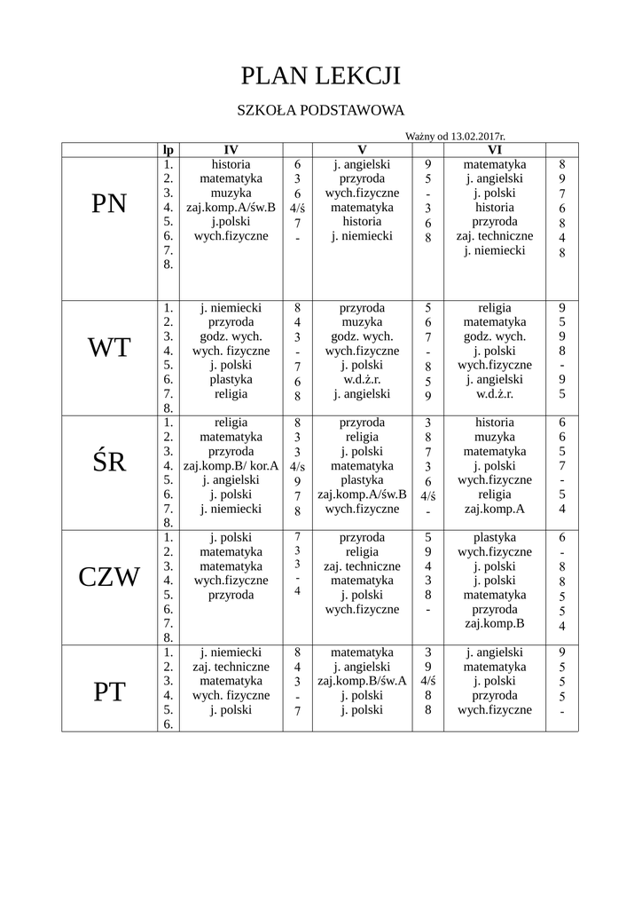 PLAN LEKCJI SZKOŁA PODSTAWOWA Ważny od 13.02.2017r. PN WT ŚR CZW PT lp IV 1. historia 2. matematyka 3. muzyka 4. zaj.komp.A/św.B 5. j.polski 6. wych.fizyczne 7. 8. 6 3 6 4/ś 7 - V j. angielski przyroda wych.fizyczne matematyka historia j. niemiecki 1. j. niemiecki przyroda 8 2. przyroda muzyka 4 3. godz. wych. godz. wych. 3 4. wych. fizyczne wych.fizyczne 5. j. polski j. polski 7 6. plastyka w.d.ż.r. 6 7. religia j. angielski 8 8. 1. religia przyroda 8 2. matematyka religia 3 3. przyroda j. polski 3 4. zaj.komp.B/ kor.A 4/s matematyka 5. j. angielski plastyka 9 6. j. polski zaj.komp.A/św.B 7 7. j. niemiecki wych.fizyczne 8 8. 7 1. j. polski przyroda 3 2. matematyka religia 3 3. matematyka zaj. techniczne 4. wych.fizyczne matematyka 4 5. przyroda j. polski 6. wych.fizyczne 7. 8. 1. j. niemiecki matematyka 8 2. zaj. techniczne j. angielski 4 3. matematyka 3 zaj.komp.B/św.A 4. wych. fizyczne j. polski 5. j. polski j. polski 7 6. 9 5 3 6 8 VI matematyka j. angielski j. polski historia przyroda zaj. techniczne j. niemiecki 8 9 7 6 8 4 8 5 6 7 8 5 9 religia matematyka godz. wych. j. polski wych.fizyczne j. angielski w.d.ż.r. 9 5 9 8 9 5 3 8 7 3 6 4/ś - historia muzyka matematyka j. polski wych.fizyczne religia zaj.komp.A 6 6 5 7 5 4 5 9 4 3 8 - plastyka wych.fizyczne j. polski j. polski matematyka przyroda zaj.komp.B 6 8 8 5 5 4 3 9 4/ś 8 8 j. angielski matematyka j. polski przyroda wych.fizyczne 9 5 5 5 -
