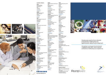 U C Z E S T N I C Y PROJ E K T U AUSTRIA Austriacki Urząd Patentowy (Österreichisches Patentamt) Dresdnerstrasse 87 POB 95 A-1200 Vienna +43 (1) 534 24 0 www.patentamt.at HISZPANIA Hiszpański Urząd Patentów i Znaków Towarowych (OEPM) Paseo de las Castellana, 75 28046 Madrid +34 902 157 530 www.oepm.es [email protected] SZWECJA Szwedzki Urząd Patentów i Rejestracji (PRV) PO Box 5055 SE-102 42 Stockholm +46 8 782 25 00 www.prv.se [email protected] Centrum Technologiczne CETEMMSA TURCJA Turecki Instytut Patentowy (TPI) Hipodrom Cad No:115 06330 Yenimahalle – Ankara +90 312 303 10 00 www.turkpatent.gov.tr [email protected] Jaume Balmes 37-39 Mataro E08301 +34 937 419 100 [email protected] [email protected] BUŁGARIA Bułgarski Urząd Patentowy (BPO) 52b Dr G M Dimitrov Blvd 1040 Sofia +359 2 9701 302 www.bpo.bg LUKSEMBURG Ministerstwo Gospodarki i Handlu Zagranicznego Urząd Własności Intelektualnej 19-21, Boulevard Royal L-2914 Luxembourg +352 247 841 13 www.eco.public.lu [email protected] [email protected] CZECHY Czeski Urząd Własności Przemysłowej (UPV) Antonina Cermaka 2a 160 68 Prague 6 +420 220 383 111 www.upv.cz CRP Henri Tudor (CVT) Centrum Monitoringu Technologii i Innowacji [email protected] DANIA Duński Urząd Patentów i Znaków Towarowych (DKPTO) Helgeshoej Allé 81 2630 Taastrup +45 43 50 80 00 www.dkpto.org [email protected] ESTONIA Estońska Biblioteka Patentowa Olevimaegi 8/10 10123 Tallinn +372 6411 250 www.patentlib.ee 29, avenue John F. Kennedy L-1855 Luxembourg – Kirchberg +352 42 59 91-1 www.veille.lu www.brevet.lu [email protected] Luxinnovation (GIE) Krajowa Agencja ds. Innowacji i Badań 7, rue Alcide de Gasperi L-1615 Luxembourg – Kirchberg +352 43 62 63 1 www.luxinnovation.lu [email protected] MALTA Dyrekcja ds. Rejestrów Własności Przemysłowej Ministerstwo Finansów, Gospodarki i Inwestycji Wydział Handlu – Lascaris Bastions Valetta – VLT 2000 +356 21 22 66 88 www.commerce.gov.mt ipoffi[email protected] [email protected] EURATEX Europejska Organizacja ds. Odzieży i Wyrobów Tekstylnych 24, rue Montoyer – Box 10 B-1000 Brussels +32 2 285 48 80 www.euratex.org [email protected] FINLANDIA Fiński Krajowy Urząd ds. Patentów i Rejestracji (PRH) Arkadiankatu 6A 00100 Helsinki +358 9 6939 500 www.prh.fi registry@prh.fi NIEMCY Niemiecki Urząd Patentów i Znaków Towarowych (DPMA) Zweibruckenstrasse 12 D-80331 Munich +49 89 2195-0 www.dpma.de [email protected] POLSKA Urząd Patentowy Rzeczypospolitej Polskiej Aleja Niepodleglosci 188/192 00-950 Warszawa FRANCJA +48 22 579 02 20 lub +48 22 579 01 53 Krajowy Instytut ds. Własności Przemysłowej(INPI) www.uprp.pl 26 bis rue de Saint Petersbourg [email protected] 75800 Paris Cedex 08 PORTUGALIA 0820 210 211 Portugalski Instytut Własności Przemysłowej www.inpi.fr (INPI PT) [email protected] Campo das Cebolas Europejski Instytut ds. Przedsiębiorczości 1149-035 Lisboa i Własności Intelektualnej (IEEPI) +351 21 881 81 00 Park Innowacyjny www.inpi.pt Rue Jean-Dominique Cassini [email protected] 67400 IIIkirch – Graffenstaden +33 3 88 65 50 29 www.ieepi.org [email protected] RUMUNIA Krajowy Urząd ds. Wynalazków i Znaków Towarowych (OSIM) 5, Ion Ghica Street GRECJA Grecka Organizacja Własności Przemysłowej (OBI) Sector 3 Bucharest 5 Pandanassis Street 030044 151 25 Paradissos Amaroussiou +40 21 306 08 00 +30 210 6183500 www.osim.ro www.obi.gr offi[email protected] [email protected] © ™ ® www.ipeuropaware.eu + WĘGRY Węgierski Urząd Patentowy (HPO) Centrum Informacyjno-Edukacyjne ds. Własności Przemysłowej 1054 Garibaldi u.2 Budapest P.O.Box 552 H-1370 +36 1474 5561 www.hpo.hu [email protected] WIELKA BRYTANIA Urząd Własności Intelektualnej Concept House Cardiff Road Newport South Wales NP10 8QQ +44 (0) 1633 814 000 www.ipo.gov.uk [email protected] WŁOCHY Politechnika w Turynie Departament Systemów Produkcyjnych i Ekonomiki Przedsiębiorstw (DISPEA) Corso Duca degli Abruzzi 24 10129 Torino +39 011 564 3344 www.polito.it [email protected] [email protected] [email protected] Dyrekcja Generalna ds. walki z podrabianiem towarów Włoski Urząd Patentów i Znaków Towarowych (UIBM) Via Molise 19 00187 Roma +39 06 470 55 665 www.uibm.gov.it [email protected] Wenecka Izba Handlowa (CCV) Wydział ds. Własności Przemysłowej i Innowacji Technologicznych Via Banchina Molini n. 8 30175 Marghera – Venezia +39 041 786 224 www.ve.camcom.it [email protected] Uniwersytet w Alicante (Koordynator) Biuro Zarządzania Projektami IPR-Helpdesk Campus de San Vicente Postal Code 03690 - PO Box 99 Alicante +34 965 90 97 18 www.ua.es [email protected] zapytania ogólne: [email protected] PA RT N ER Z Y PROJ EK T U CITEVE – Centrum ds. Technologii Produkcji Tekstyliów i Odzieży Cotance – Europejska Konfederacja Producentów Skór i Odzieży Skórzanej UEA – Europejska Federacja Producentów Mebli Dr Roya Ghafele niezależny ekspert Vilma Misiukoniene niezależny ekspert Popularyzacja zasad ochrony własności przemysłowej i intelektualnej oraz egzekwowania nabytych praw wyłącznych IPeuropAware: promowanie korzyści płynących z pogłębienia wiedzy MŚP z zakresu własności przemysłowej i intelektualnej oraz zarządzania nią © ® Wstęp Cele Działania Rezultaty Projekt IPeuropAware łączy dwie ogólnoeuropejskie inicjatywy: portal internetowy zawierający informacje o usługach świadczonych przez krajowe urzędy patentowe IPR-Helpdesk – infolinię i szkolenia dla obecnych i przyszłych uczestników projektów realizowanych w ramach finansowanego przez Komisję Europejską Programu Ramowego w zakresie badań i rozwoju technologicznego. Upowszechnienie wiedzy z zakresu ochrony własności przemysłowej i intelektualnej wśród MŚP w celu: Działania konsorcjum IPeuropAware obejmują: IPeuropAware stworzy możliwość rozwoju współpracy strategicznej, w tym wymianę doświadczeń pomiędzy podmiotami oferującymi usługi w zakresie ochrony własności przemysłowej i int