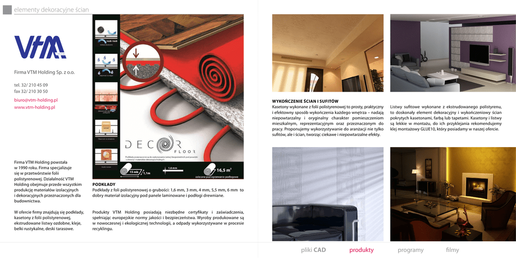 elementy dekoracyjne ścian Firma VTM Holding Sp. z o.o. tel. 32/ 210 45 09 fax 32/ 210 30 50 [email protected] www.vtm-holding.pl Firma VTM Holding powstała w 1990 roku. Firma specjalizuje się w przetwórstwie folii polistyrenowej. Działalność VTM Holding obejmuje przede wszystkim produkcję materiałów izolacyjnych i dekoracyjnych przeznaczonych dla budownictwa. W ofercie firmy znajdują się podkłady, kasetony z folii polistyrenowej, ekstrudowane listwy ozdobne, kleje, belki rustykalne, deski tarasowe. Wykończenie ścian i sufitów Kasetony wykonane z folii polistyrenowej to prosty, praktyczny i efektowny sposób wykończenia każdego wnętrza – nadają niepowtarzalny i oryginalny charakter pomieszczeniom mieszkalnym, reprezentacyjnym oraz przeznaczonym do pracy. Proponujemy wykorzystywanie do aranżacji nie tylko sufitów, ale i ścian, tworząc ciekawe i niepowtarzalne efekty. Listwy sufitowe wykonane z ekstrudowanego polistyrenu, to doskonały element dekoracyjny i wykończeniowy ścian pokrytych kasetonami, farbą lub tapetami. Kasetony i listwy są lekkie w montażu, do ich przyklejania rekomendujemy klej montażowy GLUE10, który posiadamy w naszej ofercie. Podkłady Podkłady z foli polistyrenowej o grubości: 1,6 mm, 3 mm, 4 mm, 5,5 mm, 6 mm to dobry materiał izolacyjny pod panele laminowane i podłogi drewniane. Produkty VTM Holding posiadają niezbędne certyfikaty i zaświadczenia, spełniając europejskie normy jakości i bezpieczeństwa. Wyroby produkowane są w nowoczesnej i ekologicznej technologii, a odpady wykorzystywane w procesie recyklingu. pliki CAD produkty programy filmy