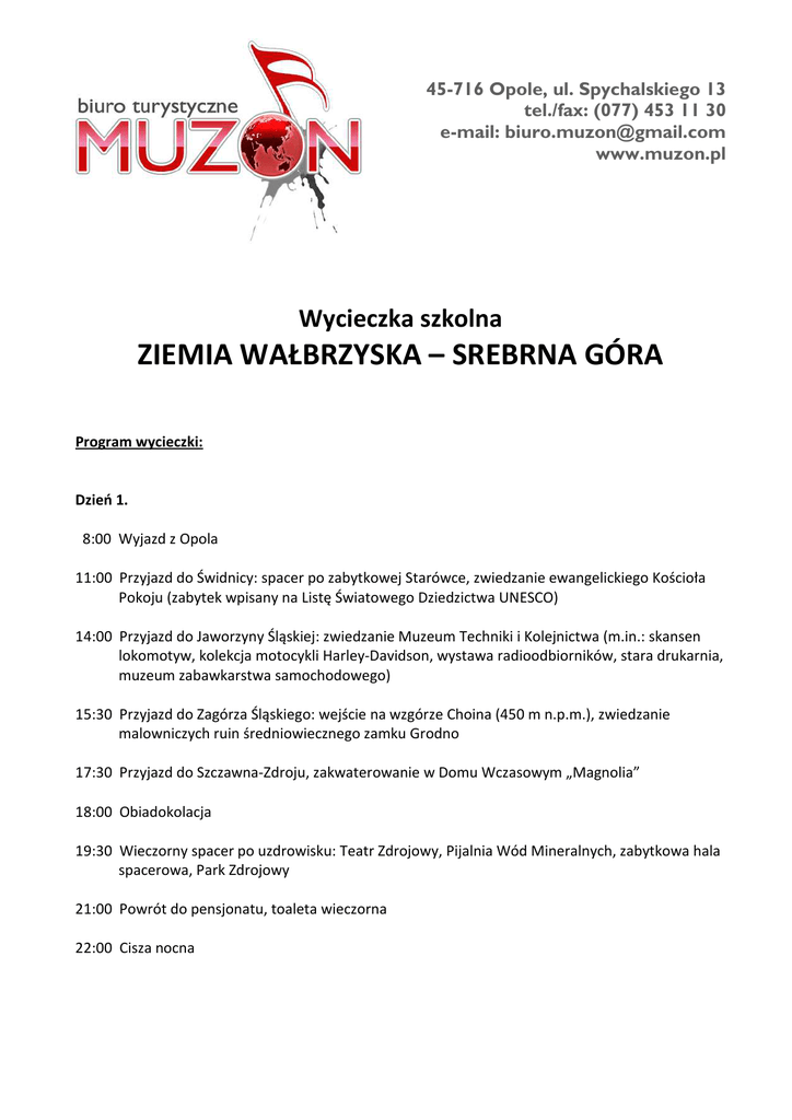 45-716 Opole, ul. Spychalskiego 13 tel./fax: (077) 453 11 30 e-mail: [email protected] www.muzon.pl Wycieczka szkolna ZIEMIA WAŁBRZYSKA – SREBRNA GÓRA Program wycieczki: Dzień 1. 8:00 Wyjazd z Opola 11:00 Przyjazd do Świdnicy: spacer po zabytkowej Starówce, zwiedzanie ewangelickiego Kościoła Pokoju (zabytek wpisany na Listę Światowego Dziedzictwa UNESCO) 14:00 Przyjazd do Jaworzyny Śląskiej: zwiedzanie Muzeum Techniki i Kolejnictwa (m.in.: skansen lokomotyw, kolekcja motocykli Harley-Davidson, wystawa radioodbiorników, stara drukarnia, muzeum zabawkarstwa samochodowego) 15:30 Przyjazd do Zagórza Śląskiego: wejście na wzgórze Choina (450 m n.p.m.), zwiedzanie malowniczych ruin średniowiecznego zamku Grodno 17:30 Przyjazd do Szczawna-Zdroju, zakwaterowanie w Domu Wczasowym „Magnolia” 18:00 Obiadokolacja 19:30 Wieczorny spacer po uzdrowisku: Teatr Zdrojowy, Pijalnia Wód Mineralnych, zabytkowa hala spacerowa, Park Zdrojowy 21:00 Powrót do pensjonatu, toaleta wieczorna 22:00 Cisza nocna Dzień 2. 7:00 Pobudka, toaleta poranna, ścielenie łóżek, pakowanie bagaży 8:00 Śniadanie 8:30 Wykwaterowanie z pensjonatu, wyjazd ze Szczawna-Zdroju 9:30 Spacer po Książańskim Parku Krajobrazowym, zwiedzanie Zamku Książ (jeden z największych w Europie, trzeci pod względem wielkości w Polsce), wizyta w zabytkowych stajniach (słynne stado ogierów) 13:00 Wyjazd z Parku Książańskiego 14:30 Przyjazd do Srebrnej Góry, obiad w restauracji „Koniuszy” 16:00 Zwiedzanie XVIII-wiecznej Twierdzy Srebrnogórskiej: dziedziniec i korona Fortu Donjon, punkty widokowe, podziemne kazamaty, pokaz strzelania z karabinu skałkowego, pokaz salwy armatniej, spotkanie z żołnierzem 33. Historycznego Regimentu Srebrnogórskiego 18:00 Wyjazd ze Srebrnej Góry 20:00 Przyjazd do Opola Cena: ustalana indywidualnie i uzależniona od liczby uczestników wycieczki (dzieci i opiekunów) W cenie: • • • • • • przejazd autokarem zakwaterowanie w Domu Wczasowym „Magnolia” w Szczawnie-Zdroju (pokoje 2- i 3-os. z umywalkami, łazienki na korytarzu) wyżywienie (wg programu) bilety wstępu opłaty przewodnickie opieka pilota
