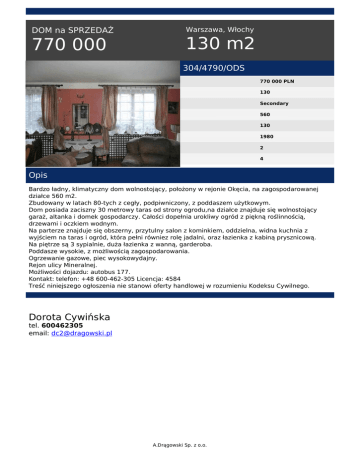 DOM na SPRZEDAŻ 770 000 Warszawa, Włochy 130 m2 304/4790/ODS 770 000 PLN 130 Secondary 560 130 1980 2 4 Opis Bardzo ładny, klimatyczny dom wolnostojący, położony w rejonie Okęcia, na zagospodarowanej działce 560 m2. Zbudowany w latach 80-tych z cegły, podpiwniczony, z poddaszem użytkowym. Dom posiada zaciszny 30 metrowy taras od strony ogrodu,na działce znajduje się wolnostojący garaż, altanka i domek gospodarczy. Całości dopełnia urokliwy ogród z piękną roślinnością, drzewami i oczkiem wodnym. Na parterze znajduje się obszerny, przytulny salon z kominkiem, oddzielna, widna kuchnia z wyjściem na taras i ogród, która pełni równiez rolę jadalni, oraz łazienka z kabiną prysznicową. Na piętrze są 3 sypialnie, duża łazienka z wanną, garderoba. Poddasze wysokie, z możliwością zagospodarowania. Ogrzewanie gazowe, piec wysokowydajny. Rejon ulicy Mineralnej. Możliwości dojazdu: autobus 177. Kontakt: telefon: +48 600-462-305 Licencja: 4584 Treść niniejszego ogłoszenia nie stanowi oferty handlowej w rozumieniu Kodeksu Cywilnego. Dorota Cywińska tel. 600462305 email: [email protected] A.Drągowski Sp. z o.o. Powered by TCPDF (www.tcpdf.org)