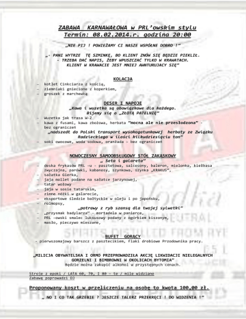 ZABAWA KARNAWAŁOWA w PRL’owskim stylu Termin: 08.02.2014.r. godzina 20:00 „NIE PIJ ! POWIEŻAMY CI NASZE WSPÓŁNE DOBRO !” „- PANI WYTRZE TĘ SZMINKĘ, BO KLIENT ZNÓW SIĘ BĘDZIE PIEKLIŁ. - TRZEBA DAĆ NAPIS, ŻEBY WPUSZCZAĆ TYLKO W KRAWATACH. KLIENT W KRAWACIE JEST MNIEJ AWNTURUJACY SIĘ” KOLACJA kotlet Cinkciarza z kością, ziemniaki gniecione z koperkiem, groszek z marchewką DESER I NAPOJE „Kawa i wuzetka są obowiązkowe dla każdego. Bijemy się o „ZŁOTĄ PATELNIĘ” Wuzetka jak trasa W-Z kawa z fusami, kawa zbożowa, herbata ”mocna ale nie przesłodzona” bez ograniczeń „nadszedł do Polski transport wysokogatunkowej herbaty ze Związku Radzieckiego w ilości kilkudziesięciu ton” soki owocowe, woda sodowa, oranżada – bez ograniczeń NOWOCZESNY SAMOOBSŁUGOWY STÓŁ ZAKĄSKOWY „ Seta i galareta” deska frykasów PRL –u - pasztetowa, salcesony, baleron, mielonka, kiełbasa zwyczajna, parówki, kabanosy, szynkowa, szynka „KRAKUS”, sałatka Gierka, jaja mollet podane na sałatce jarzynowej, tatar wołowy jaja w sosie tatarskim, zimne nóżki w galarecie, eksportowe śledzie bałtyckie w oleju i po japońsku, rolmopsy, „potrawy z ryb szansą dla twojej sylwetki” „przysmak badylarza” - mortadela w panierce, PRL –owski smalec luksusowy podany z ogórkiem kiszonym, masło, pieczywo mieszane, BUFET GORĄCY - pierwszomajowy barszcz z pasztecikiem, flaki drobiowe Przodownika pracy. „MILICJA OBYWATELSKA I ORMO PRZEPROWADZIŁA AKCJĘ LIKWIDACJI NIELEGALNYCH GORZELNI I BIMBROWNI W OKOLICACH BYTOMIA” Będzie można zakupić alkohol w przystępnych cenach. Stroje z epoki / LATA 60, 70, I 80 – te / mile widziane Zabawę poprowadzi DJ Proponowany koszt w przeliczeniu na osobę to kwota 100,00 zł. „ NO I CO TAK GRZEBIE ? JESZCZE TALERZ PRZEKRĘCI ! DO WIDZENIA !”