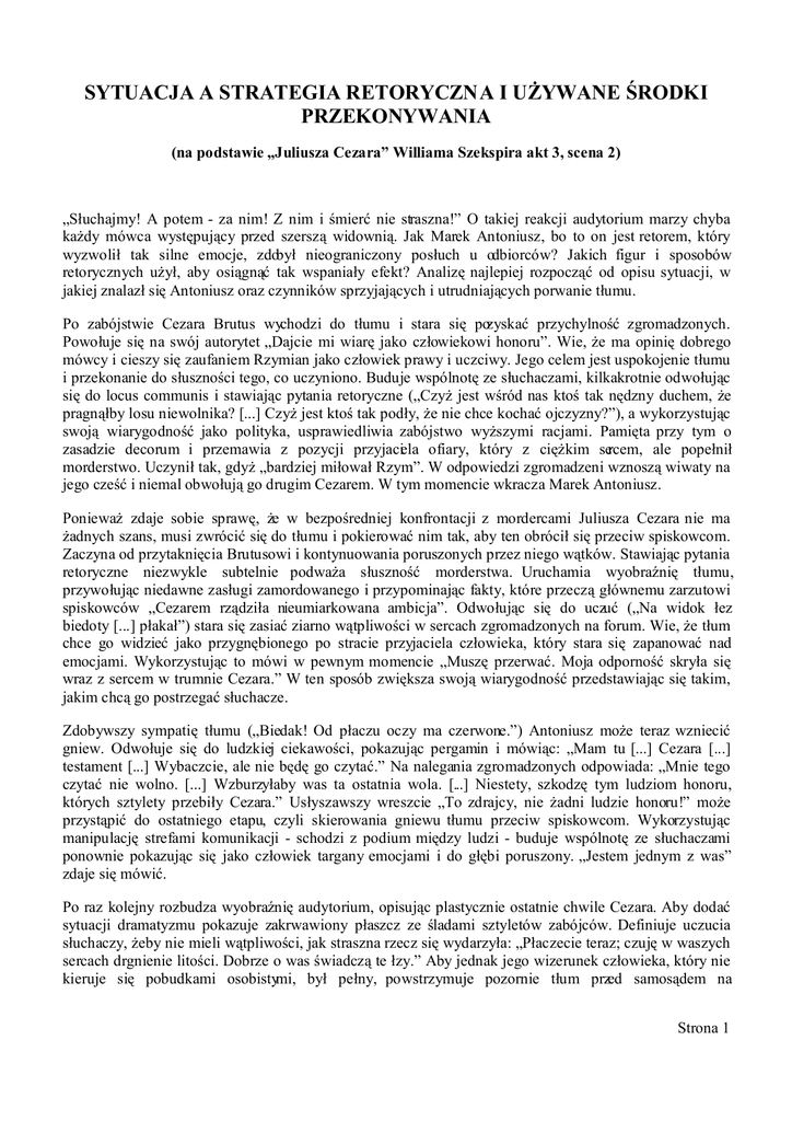SYTUACJA A STRATEGIA RETORYCZNA I UŻYWANE ŚRODKI PRZEKONYWANIA (na podstawie „Juliusza Cezara” Williama Szekspira akt 3, scena 2) „Słuchajmy! A potem - za nim! Z nim i śmierć nie straszna!” O takiej reakcji audytorium marzy chyba każdy mówca występujący przed szerszą widownią. Jak Marek Antoniusz, bo to on jest retorem, który wyzwolił tak silne emocje, zdobył nieograniczony posłuch u odbiorców? Jakich figur i sposobów retorycznych użył, aby osiągnąć tak wspaniały efekt? Analizę najlepiej rozpocząć od opisu sytuacji, w jakiej znalazł się Antoniusz oraz czynników sprzyjających i utrudniających porwanie tłumu. Po zabójstwie Cezara Brutus wychodzi do tłumu i stara się pozyskać przychylność zgromadzonych. Powołuje się na swój autorytet „Dajcie mi wiarę jako człowiekowi honoru”. Wie, że ma opinię dobrego mówcy i cieszy się zaufaniem Rzymian jako człowiek prawy i uczciwy. Jego celem jest uspokojenie tłumu i przekonanie do słuszności tego, co uczyniono. Buduje wspólnotę ze słuchaczami, kilkakrotnie odwołując się do locus communis i stawiając pytania retoryczne („Czyż jest wśród nas ktoś tak nędzny duchem, że pragnąłby losu niewolnika? [...] Czyż jest ktoś tak podły, że nie chce kochać ojczyzny?”), a wykorzystując swoją wiarygodność jako polityka, usprawiedliwia zabójstwo wyższymi racjami. Pamięta przy tym o zasadzie decorum i przemawia z pozycji przyjaciela ofiary, który z ciężkim sercem, ale popełnił morderstwo. Uczynił tak, gdyż „bardziej miłował Rzym”. W odpowiedzi zgromadzeni wznoszą wiwaty na jego cześć i niemal obwołują go drugim Cezarem. W tym momencie wkracza Marek Antoniusz. Ponieważ zdaje sobie sprawę, że w bezpośredniej konfrontacji z mordercami Juliusza Cezara nie ma żadnych szans, musi zwrócić się do tłumu i pokierować nim tak, aby ten obrócił się przeciw spiskowcom. Zaczyna od przytaknięcia Brutusowi i kontynuowania poruszonych przez niego wątków. Stawiając pytania retoryczne niezwykle subtelnie podważa słuszność morderstwa. Uruchamia wyobraźnię tłumu, przywołując niedawne zasługi zamordowanego i przypominając fakty, które przeczą głównemu zarzutowi spiskowców „Cezarem rządziła nieumiarkowana ambicja”. Odwołując się do uczuć („Na widok łez biedoty [...] płakał”) stara się zasiać ziarno wątpliwości w sercach zgromadzonych na forum. Wie, że tłum chce go widzieć jako przygnębionego po stracie przyjaciela człowieka, który stara się zapanować nad emocjami. Wykorzystując to mówi w pewnym momencie „Muszę przerwać. Moja odporność skryła się wraz z sercem w trumnie Cezara.” W ten sposób zwiększa swoją wiarygodność przedstawiając się takim, jakim chcą go postrzegać słuchacze. Zdobywszy sympatię tłumu („Biedak! Od płaczu oczy ma czerwone.”) Antoniusz może teraz wzniecić gniew. Odwołuje się do ludzkiej ciekawości, pokazując pergamin i mówiąc: „Mam tu [...] Cezara [...] testament [...] Wybaczcie, ale nie będę go czytać.” Na nalegania zgromadzonych odpowiada: „Mnie tego czytać nie wolno. [...] Wzburzyłaby was ta ostatnia wola. [...] Niestety, szkodzę tym ludziom honoru, których sztylety przebiły Cezara.” Usłyszawszy wreszcie „To zdrajcy, nie żadni ludzie honoru!” może przystąpić do ostatniego etapu, czyli skierowania gniewu tłumu przeciw spiskowcom. Wykorzystując manipulację strefami komunikacji - schodzi z podium między ludzi - buduje wspólnotę ze słuchaczami ponownie pokazując się jako człowiek targany emocjami i do głębi poruszony. „Jestem jednym z was” zdaje się mówić. Po raz kolejny rozbudza wyobraźnię audytorium, opisując plastycznie ostatnie chwile Cezara. Aby dodać sytuacji dramatyzmu pokazuje zakrwawiony płaszcz ze śladami sztyletów zabójców. Definiuje uczucia słuchaczy, żeby nie mieli wątpliwości, jak straszna rzecz się wydarzyła: „Płaczecie teraz; czuję w waszych sercach drgnienie litości. Dobrze o was świadczą te łzy.” Aby jednak jego wizerunek człowieka, który nie kieruje się pobudkami osobistymi, był pełny, powstrzymuje pozornie tłum przed samosądem na Strona 1 mordercach, w rzeczywistości nazywając sprawców po imieniu i kierując wściekłość Rzymian przeciw konkretnym osobom. W celu rozproszenia wszelkich wątpliwości i wyposażenia mścicieli w moralną legitymację do ścigania spiskowców, Antoniusz czyta na głos rzekomy testament Cezara, którego wolą jest „by każdemu z [...] obywateli Rzymu wypłacono po siedemdziesiąt pięć drachm.” Mówi później, że „zapisał wam ponadto wszystkie, będące w jego posiadaniu parki, gaje i świeżo sadzone ogrody [...] Taki był Cezar! Kiedy się narodzi drugi podobny?” W tym momencie tłum przejmuje inicjatywę i głosząc zemstę na zabójcach unosi ze sobą ciało zamordowanego. Co pozwoliło Markowi Antoniuszowi uzyskać tak spektakularny efekt? Po pierwsze, trafnie zdefiniował sytuację i układ ról w niej panujący. Potrafił wykorzystać oczekiwania słuchaczy dotyczące jego postawy i jego wystąpienia. Umiejętnie operując słowami eksploatował locus communis, czyli zaskoczenie, ból i gniew po stracie idola. Pozwolił znaleźć winnych i wskazał pośrednio możliwość ich ukarania. Po drugie, będąc świadomym własnej wiarygodności i atrakcyjności dla słuchaczy budował swój wizerunek osoby prawej, mającej na względzie dobro ogółu, głęboko szanującej demokrację. Stworzył obraz człowieka zatroskanego i przygnębionego przerażającym wydarzeniem, jakim była śmierć wodza. Postawił się po stronie publiczności ujawniając uczucia, których wszyscy się po nim spodziewali, co podniosło jeszcze jego wiarygodność. Po trzecie, posługiwał się językiem prostym, miejscami patetycznym, ale nigdy kwiecistym, gdyż taki naruszyłby zasadę decorum - nie pasowałby do sytuacji i stworzyłby dysonans z podnio