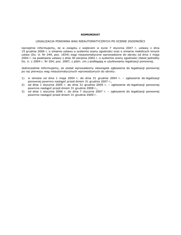 KOMUNIKAT LEGALIZACJA PONOWNA WAG NIEAUTOMATYCZNYCH PO OCENIE ZGODNOŚCI Uprzejmie informujemy, że w związku z wejściem w życie 7 stycznia 2007 r. ustawy z dnia 15 grudnia 2006 r. o zmianie ustawy o systemie oceny zgodności oraz o zmianie niektórych innych ustaw (Dz. U. Nr 249, poz. 1834) wagi nieautomatyczne wprowadzone do obrotu od dnia 1 maja 2004 r. na podstawie ustawy z dnia 30 sierpnia 2002 r. o systemie oceny zgodności (tekst jednolity Dz. U. z 2004 r. Nr 204, poz. 2087, z późn. zm.) podlegają w użytkowaniu legalizacji ponownej. Jednocześnie informujemy, że został wprowadzony obowiązek zgłoszenia do legalizacji ponownej po raz pierwszy wag nieautomatycznych wprowadzonych do obrotu: 1) 2) 3) w okresie od dnia 1 maja 2004 r. do dnia 31 grudnia 2004 r. – zgłoszenie do legalizacji ponownej powinno nastąpić przed dniem 31 grudnia 2007 r., od dnia 1 stycznia 2005 r. do dnia 31 grudnia 2005 r. – zgłoszenie do legalizacji ponownej powinno nastąpić przed dniem 31 grudnia 2008 r., od dnia 1 stycznia 2006 r. do dnia 7 stycznia 2007 r. – zgłoszenie do legalizacji ponownej powinno nastąpić przed dniem 31 grudnia 2009 r.