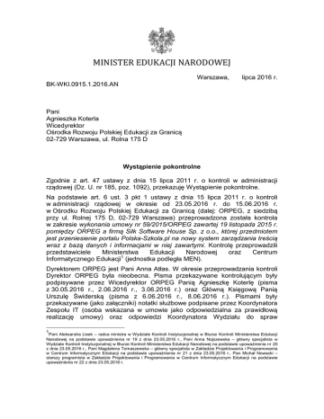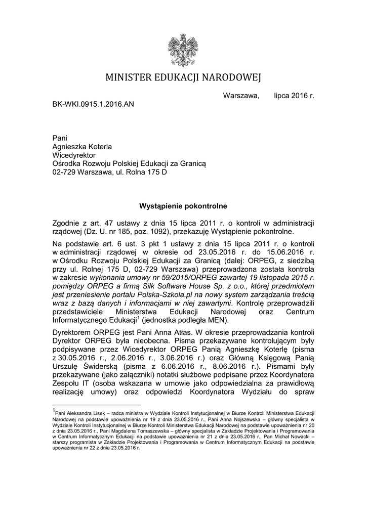 MINISTER EDUKACJI NARODOWEJ Warszawa, lipca 2016 r. BK-WKI.0915.1.2016.AN Pani Agnieszka Koterla Wicedyrektor Ośrodka Rozwoju Polskiej Edukacji za Granicą 02-729 Warszawa, ul. Rolna 175 D Wystąpienie pokontrolne Zgodnie z art. 47 ustawy z dnia 15 lipca 2011 r. o kontroli w administracji rządowej (Dz. U. nr 185, poz. 1092), przekazuję Wystąpienie pokontrolne. Na podstawie art. 6 ust. 3 pkt 1 ustawy z dnia 15 lipca 2011 r. o kontroli w administracji rządowej w okresie od 23.05.2016 r. do 15.06.2016 r. w Ośrodku Rozwoju Polskiej Edukacji za Granicą (dalej: ORPEG, z siedzibą przy ul. Rolnej 175 D, 02-729 Warszawa) przeprowadzona została kontrola w zakresie wykonania umowy nr 59/2015/ORPEG zawartej 19 listopada 2015 r. pomiędzy ORPEG a firmą Silk Software House Sp. z o.o., której przedmiotem jest przeniesienie portalu Polska-Szkola.pl na nowy system zarządzania treścią wraz z bazą danych i informacjami w niej zawartymi. Kontrolę przeprowadzili przedstawiciele Ministerstwa Edukacji Narodowej oraz Centrum 1 Informatycznego Edukacji (jednostka podległa MEN). Dyrektorem ORPEG jest Pani Anna Atłas. W okresie przeprowadzania kontroli Dyrektor ORPEG była nieobecna. Pisma przekazywane kontrolującym były podpisywane przez Wicedyrektor ORPEG Panią Agnieszkę Koterlę (pisma z 30.05.2016 r., 2.06.2016 r., 3.06.2016 r.) oraz Główną Księgową Panią Urszulę Świderską (pisma z 6.06.2016 r., 8.06.2016 r.). Pismami były przekazywane (jako załączniki) notatki służbowe podpisane przez Koordynatora Zespołu IT (osoba wskazana w umowie jako odpowiedzialna za prawidłową realizację umowy) oraz odpowiedzi Koordynatora Wydziału do spraw 1 Pani Aleksandra Lisek – radca ministra w Wydziale Kontroli Instytucjonalnej w Biurze Kontroli Ministerstwa Edukacji Narodowej na podstawie upoważnienia nr 19 z dnia 23.05.2016 r., Pani Anna Nojszewska – główny specjalista w Wydziale Kontroli Instytucjonalnej w Biurze Kontroli Ministerstwa Edukacji Narodowej na podstawie upoważnienia nr 20 z dnia 23.05.2016 r., Pani Magdalena Tomaszewska – główny specjalista w Zakładzie Projektowania i Programowania w Centrum Informatycznym Edukacji na podstawie upoważnienia nr 21 z dnia 23.05.2016 r., Pan Michał Nowacki – starszy programista w Zakładzie Projektowania i Programowania w Centrum Informatycznym Edukacji na podstawie upoważnienia nr 22 z dnia 23.05.2016 r. Wspomagania Oświaty Polonijnej i Polskojęzycznej (dalej: WWOPP). Ww. notatki służbowe Koordynatora Zespołu IT oraz odpowiedzi Koordynatora WWOPP zawierały odmienne stanowiska. Celem kontroli było sprawdzenie prawidłowości wykonania ww. umowy. Dnia 19 listopada 2015 r. pomiędzy ORPEG, reprezentowanym przez Annę Atłas – dyrektora ORPEG a firmą Silk Software House Sp. z o. o., zawarta została umowa nr 59/2015/ORPEG, której przedmiotem było przeniesienie portalu Polska-Szkoła.pl na nowy system zarządzania treścią wraz z bazą danych i informacjami w niej zawartymi. Zgodnie z zapisami umowy (§1 ust. 2), Wykonawca zobowiązany był wykonać przedmiot umowy zgodnie z ofertą z dnia 27 października 2015 r., stanowiącą załącznik nr 1 do umowy oraz SIWZ z dnia 20 października 2015 r., stanowiącą załącznik nr 2 do umowy. Umowa została zawarta w wyniku przeprowadzenia postępowania w trybie przetargu nieograniczonego na podstawie ustawy z dnia 29.01.2004 r. Prawo zamówień publicznych. W umowie określono cztery etapach realizacji przedmiotu umowy, tj.: a) etap analizy, b) etap wykonania, c) etap szkoleń i dokumentacji, d) etap serwisu. Termin realizacji etapów: analiza, wykonanie, szkolenie i dokumentacja określono od dnia zawarcia umowy do dnia 14 grudnia 2015 r. Okres objęcia serwisem określono od dnia 15 grudnia 2015 r. do dnia 30 czerwca 2016 r. Koszt realizacji przedmiotu umowy określono na kwotę 75 030,00 zł, (w tym: analiza – 12 792,00 zł, wykonanie – 41 574,00 zł, szkolenia i dokumentacja – 6 888,00 zł, serwis – 13 776,00 zł). Zgodnie z Protokołem odbioru, etapy prac ww. umowy, tj. etapy: analizy, wykonania, szkoleń i dokumentacji zostały odebrane 28.12.2015 r. bez uwag. W protokole odbioru zawarto, że prace objęte Zamówieniem zostały zrealizowane, a ich rezultaty zostały przekazane Zlecającemu. Protokół odbioru w imieniu Zlecającego został podpisany przez osobę wskazaną w umowie jako odpowiedzialną za prawidłową realizację umowy oraz przez Wykonawcę. Zgodnie z wyjaśnieniami Koordynatora Zespołu IT (załącznik nr 1 do pisma z 30.05.2016 r., znak: ORPEG-904/2016/WFK-US-4301-1-1): Przekazanie produktu będącego wykonaniem umowy odbyło się w formie działającego systemu, zainstalowanego na infrastrukturze ORPEG, sprawdzonego przez zespół IT. Przekazanie dokumentacji powykonawczej nastąpiło w formie papierowej. Przekazanie informacji o użytkownikach systemowych i hasłach odbyło się w formie papierowej, z zachowaniem wymogów bezpieczeństwa teleinformatycznego określonych w PBI. Za realizację trzech etapów prac, Wykonawcy zostało zapłacone wynagrodzenie w kwocie 61 254,00 zł. (tj. łączna kwota za trzy ww. etapy określone w umowie). 2 W wyniku kontroli ustalono, że ww. trzy etapy prac zostały odebrane po terminie określonym w umowie. Zgodnie z wyjaśnieniami przekazanymi przez Panią Agnieszkę Koterlę, wicedyrektor ORPEG (załącznik nr 1 do ww. pisma ORPEG z 30.05.2016 r.), podczas realizacji ww. umowy, w ORPEG wystąpiły okoliczności mające wpływ na przesunięcie terminu odbioru ww. trzech etapów prac, tj.: 1) Konieczność uzupełnienia architektury o bazę mySQL do obsługi portalu Joomla - podczas budowy i testowania platformy zauważono, że wcześniejsze założenia pracy jedynie na bazie MS SQL nie daje wystarczającej stabilności. Dlatego do obsługi portalu i forum przewidziano ostatecznie bazę mySQL, a formularze baz danych i proces zamawiania podręczników będzie obsługiwany przez bazę MS SQL, co poprawia wyd