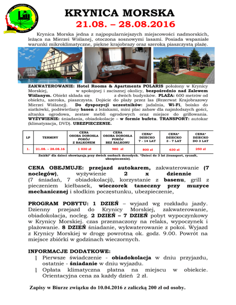 Z ER ÓBKI M E KRYNICA MORSKA C H NI ZZ A P PR Z CZ NEJ WĘ 21.08. – 28.08.2016 GL A W PO LSCE - PRZ ERÓB KA - Krynica Morska jedna z najpopularniejszych miejscowości nadmorskich, leżąca na Mierzei Wiślanej, otoczona sosnowymi lasami. Posiada wspaniałe warunki mikroklimatyczne, piękne krajobrazy oraz szeroką piaszczystą plażę. ZAKWATEROWANIE: Hotel Rooms & Apartments POLARIS położony w Krynicy Morskiej, w spokojnej i zacisznej okolicy, bezpośrednio nad Zalewem Wiślanym. Obiekt składa się z dwóch budynków. PLAŻA: 600 metrów od obiektu, szeroka, piaszczysta. Dojście do plaży przez las (Rezerwat Krajobrazowy Mierzei Wiślanej). Do dyspozycji uczestników: jadalnia, Wi-Fi, boisko do siatkówki, podświetlany basen z leżakami, mini plac zabaw dla najmłodszych gości, altanka ogrodowa, zestaw mebli ogrodowych oraz miejsce do grillowania. WYŻYWIENIE: śniadania, obiadokolacje – w formie bufetu. TRANSPORT: autokar (klimatyzacja, DVD). UBEZPIECZENIE. LP TERMINY CENA OSOBA DOROSŁA POKÓJ Z BALKONEM CENA OSOBA DOROSŁA POKÓJ BEZ BALKONU CENA* DZIECKO 7 - 14 LAT CENA* DZIECKO 3 - 7 LAT CENA* DZIECKO DO 3 LAT 1. 21.08. – 28.08.16 1 030 zł 980 zł 800 zł 630 zł 250 zł Zniżki* dla dzieci obowiązują przy dwóch osobach dorosłych. *Dzieci do 3 lat (transport, ryczałt, ubezpieczenie). CENA OBEJMUJE: przejazd autokarem, zakwaterowanie (7 noclegów), wyżywienie 2 x dziennie (7 śniadań, 7 obiadokolacji), korzystanie z basenu, grill z pieczeniem kiełbasek, wieczorek taneczny przy muzyce mechanicznej i słodkim poczęstunku, ubezpieczenie, PROGRAM POBYTU: 1 DZIEŃ – wyjazd wg rozkładu jazdy. Dzienny przejazd do Krynicy Morskiej, zakwaterowanie, obiadokolacja, nocleg. 2 DZIEŃ – 7 DZIEŃ pobyt wypoczynkowy w Krynicy Morskiej. czas przeznaczony na relaks, wypoczynek i plażowanie. 8 DZIEŃ śniadanie, wykwaterowanie z pokoi. Wyjazd z Krynicy Morskiej w drogę powrotną ok. godz. 9.00. Powrót na miejsce zbiórki w godzinach wieczornych. INFORMACJE DODATKOWE: Pierwsze świadczenie - obiadokolacja w dniu przyjazdu, ostatnie - śniadanie w dniu wyjazdu. Opłata klimatyczna płatna na miejscu w obiekcie. Orientacyjna cena za każdy dzień 2 zł. Zapisy w Biurze związku do 10.04.2016 z zaliczką 200 zł od osoby.