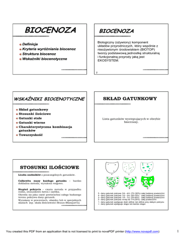 BIOCENOZA BIOCENOZA Biologiczny (ożywiony) komponent układów przyrodniczych, który wspólnie z nieożywionym środowiskiem (BIOTOP) tworzy podstawową jednostkę strukturalną i funkcjonalną przyrody jaką jest EKOSYSTEM. Definicja Kryteria wyróżniania biocenoz Struktura biocenoz Wskaźniki biocenotyczne 2 WSKAŹNIKI BIOCENOTYCZNE Skład gatunkowy Stosunki ilościowe Gatunki stałe Gatunki wierne Charakterystyczna kombinacja gatunków Towarzyskość SKŁAD GATUNKOWY Lista gatunków występujących w obrębie biocenozy. STOSUNKI ILOŚCIOWE Liczba osobników z poszczególnych gatunków. Całkowita masy każdego gatunku dokładna metoda, wyrażona wagowo. – + 1 2 bardzo Stopień pokrycia – częsta metoda w przypadku roślin, stosunkowo łatwa i szybka. Określa się jaka część powierzchni całego badanego terenu pokrywa dany gatunek. Wyrażany w procentach, ułamku lub w specjalnych skalach (np. skala ilościowości Braun-Blanquet’a). 3 4 5 5 - dany gatunek pokrywa 3/4 - 4/4 (75-100%) całej badanej powierzchni 4 - dany gatunek pokrywa 1/2 - 3/4 (50-75%) całej badanej powierzchni 3 - dany gatunek pokrywa 1/4 - 1/2 (25-50%) całej badanej powierzchni 2 - dany gatunek pokrywa mniej niż 1/4 (25%) całej powierzchni 1 - dany gatunek występuje dość obficie lub obficie przy słabym pokryciu + - dany gatunek występuje skąpo lub bardzo skąpo You created this PDF from an application that is not licensed to print to novaPDF printer (http://www.novapdf.com) 1 GATUNKI STAŁE Stałość - obecność gatunku w obrębie badanej biocenozy. Gatunki stałe występują we wszystkich (w licznych) próbach pochodzących z badanej biocenozy. Klasy stałości Frekwencja gatunku W% Klasa stałości 100-81 V 80-61 IV 60-41 III 40-21 II 20-1 I Stałość gatunku (C) może być wyrażona jako częstość jego występowania w danej biocenozie w procentach : C = 100 na / Z gdzie na - liczba prób zawierających dany gatunek Z - liczba prób w badanej serii GATUNKI WIERNE Stopnie wierności fitosocjologicznej Grupa gatunków Wierność - udział gatunku w rozmaitych biocenozach. Gatunki wierne Występują w jednym typie biocenozy. Nieobecne (lub bardzo rzadkie) w innych biocenozy. Wierność zwykle wyróżnia się w stopniach wierności dla poszczególnych gatunków. CHARAKTERYSTYCZNA KOMBINACJA GATUNKÓW Obejmuje wszystkie gatunki charakterystyczne, bez względu na stopień ich stałości oraz gatunki towarzyszące, które mają wysoki stopień stałości (C>60%) Ch (3(3-5) + C>60% Charaktery styczne Stopień wierności Gatunki 5 Wyłączne 4 Związane z jednym zespołem Wybiórcze wyraźnie, w innych mniej obfite i występują rzadziej Sposób występowania Tylko jeden zespół lub grupa zespołów 3 Przenoszące Liczne zbiorowiska, lecz tylko w jednym ma wysoki stopień stałości, ilościowy bądź żywotności Towarzyszące 2 Obojętna W dwóch lub więcej zbiorowiskach jednakowo obfity i żywotny Przypadkowe 1 Obce Właściwe innym zbiorowiskom, w danym środowisku jako relikty, forpoczty i imigranty. Rozwój słaby. TOWARZYSKOŚĆ Sposób skupienia się osobników różnych gatunków. Określa się ją najczęściej szacunkowo w ramach 5-stopniowej skali. You created this PDF from an application that is not licensed to print to novaPDF printer (http://www.novapdf.com) 2