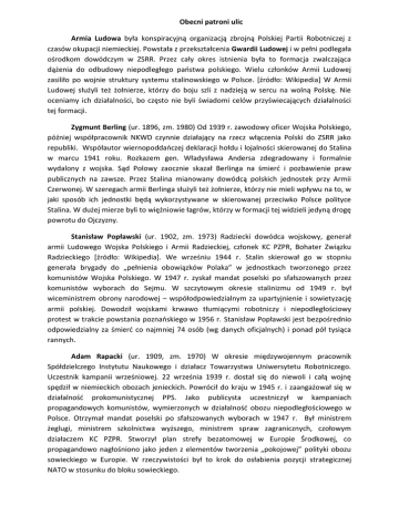 Obecni patroni ulic Armia Ludowa była konspiracyjną organizacją zbrojną Polskiej Partii Robotniczej z czasów okupacji niemieckiej. Powstała z przekształcenia Gwardii Ludowej i w pełni podlegała ośrodkom dowódczym w ZSRR. Przez cały okres istnienia była to formacja zwalczająca dążenia do odbudowy niepodległego paostwa polskiego. Wielu członków Armii Ludowej zasiliło po wojnie struktury systemu stalinowskiego w Polsce. *źródło: Wikipedia] W Armii Ludowej służyli też żołnierze, którzy do boju szli z nadzieją w sercu na wolną Polskę. Nie oceniamy ich działalności, bo często nie byli świadomi celów przyświecających działalności tej formacji. Zygmunt Berling (ur. 1896, zm. 1980) Od 1939 r. zawodowy oficer Wojska Polskiego, później współpracownik NKWD czynnie działający na rzecz włączenia Polski do ZSRR jako republiki. Współautor wiernopoddaoczej deklaracji hołdu i lojalności skierowanej do Stalina w marcu 1941 roku. Rozkazem gen. Władysława Andersa zdegradowany i formalnie wydalony z wojska. Sąd Polowy zaocznie skazał Berlinga na śmierd i pozbawienie praw publicznych na zawsze. Przez Stalina mianowany dowódcą polskich jednostek przy Armii Czerwonej. W szeregach armii Berlinga służyli też żołnierze, którzy nie mieli wpływu na to, w jaki sposób ich jednostki będą wykorzystywane w skierowanej przeciwko Polsce polityce Stalina. W dużej mierze byli to więźniowie łagrów, którzy w formacji tej widzieli jedyną drogę powrotu do Ojczyzny. Stanisław Popławski (ur. 1902, zm. 1973) Radziecki dowódca wojskowy, generał armii Ludowego Wojska Polskiego i Armii Radzieckiej, członek KC PZPR, Bohater Związku Radzieckiego *źródło: Wikipedia+. We wrześniu 1944 r. Stalin skierował go w stopniu generała brygady do „pełnienia obowiązków Polaka” w jednostkach tworzonego przez komunistów Wojska Polskiego. W 1947 r. zyskał mandat poselski po sfałszowanych przez komunistów wyborach do Sejmu. W szczytowym okresie stalinizmu od 1949 r. był wiceministrem obrony narodowej – współodpowiedzialnym za upartyjnienie i sowietyzację armii polskiej. Dowodził wojskami krwawo tłumiącymi robotniczy i niepodległościowy protest w trakcie powstania poznaoskiego w 1956 r. Stanisław Popławski jest bezpośrednio odpowiedzialny za śmierd co najmniej 74 osób (wg danych oficjalnych) i ponad pół tysiąca rannych. Adam Rapacki (ur. 1909, zm. 1970) W okresie międzywojennym pracownik Spółdzielczego Instytutu Naukowego i działacz Towarzystwa Uniwersytetu Robotniczego. Uczestnik kampanii wrześniowej. 22 września 1939 r. dostał się do niewoli i całą wojnę spędził w niemieckich obozach jenieckich. Powrócił do kraju w 1945 r. i zaangażował się w działalnośd prokomunistycznej PPS. Jako publicysta uczestniczył w kampaniach propagandowych komunistów, wymierzonych w działalnośd obozu niepodległościowego w Polsce. Otrzymał mandat poselski po sfałszowanych wyborach w 1947 r. Był ministrem żeglugi, ministrem szkolnictwa wyższego, ministrem spraw zagranicznych, czołowym działaczem KC PZPR. Stworzył plan strefy bezatomowej w Europie Środkowej, co propagandowo nagłośniono jako jeden z elementów tworzenia „pokojowej” polityki obozu sowieckiego w Europie. W rzeczywistości był to krok do osłabienia pozycji strategicznej NATO w stosunku do bloku sowieckiego.