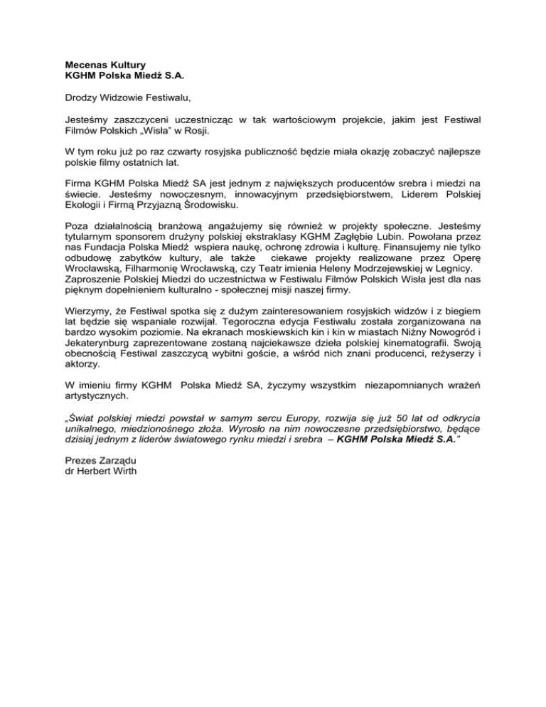 Mecenas Kultury KGHM Polska Miedź S.A. Drodzy Widzowie Festiwalu, Jesteśmy zaszczyceni uczestnicząc w tak wartościowym projekcie, jakim jest Festiwal Filmów Polskich „Wisła” w Rosji. W tym roku już po raz czwarty rosyjska publiczność będzie miała okazję zobaczyć najlepsze polskie filmy ostatnich lat. Firma KGHM Polska Miedź SA jest jednym z największych producentów srebra i miedzi na świecie. Jesteśmy nowoczesnym, innowacyjnym przedsiębiorstwem, Liderem Polskiej Ekologii i Firmą Przyjazną Środowisku. Poza działalnością branżową angażujemy się również w projekty społeczne. Jesteśmy tytularnym sponsorem drużyny polskiej ekstraklasy KGHM Zagłębie Lubin. Powołana przez nas Fundacja Polska Miedź wspiera naukę, ochronę zdrowia i kulturę. Finansujemy nie tylko odbudowę zabytków kultury, ale także ciekawe projekty realizowane przez Operę Wrocławską, Filharmonię Wrocławską, czy Teatr imienia Heleny Modrzejewskiej w Legnicy. Zaproszenie Polskiej Miedzi do uczestnictwa w Festiwalu Filmów Polskich Wisła jest dla nas pięknym dopełnieniem kulturalno - społecznej misji naszej firmy. Wierzymy, że Festiwal spotka się z dużym zainteresowaniem rosyjskich widzów i z biegiem lat będzie się wspaniale rozwijał. Tegoroczna edycja Festiwalu została zorganizowana na bardzo wysokim poziomie. Na ekranach moskiewskich kin i kin w miastach Niżny Nowogród i Jekaterynburg zaprezentowane zostaną najciekawsze dzieła polskiej kinematografii. Swoją obecnością Festiwal zaszczycą wybitni goście, a wśród nich znani producenci, reżyserzy i aktorzy. W imieniu firmy KGHM Polska Miedź SA, życzymy wszystkim niezapomnianych wrażeń artystycznych. „Świat polskiej miedzi powstał w samym sercu Europy, rozwija się już 50 lat od odkrycia unikalnego, miedzionośnego złoża. Wyrosło na nim nowoczesne przedsiębiorstwo, będące dzisiaj jednym z liderów światowego rynku miedzi i srebra – KGHM Polska Miedź S.A.” Prezes Zarządu dr Herbert Wirth