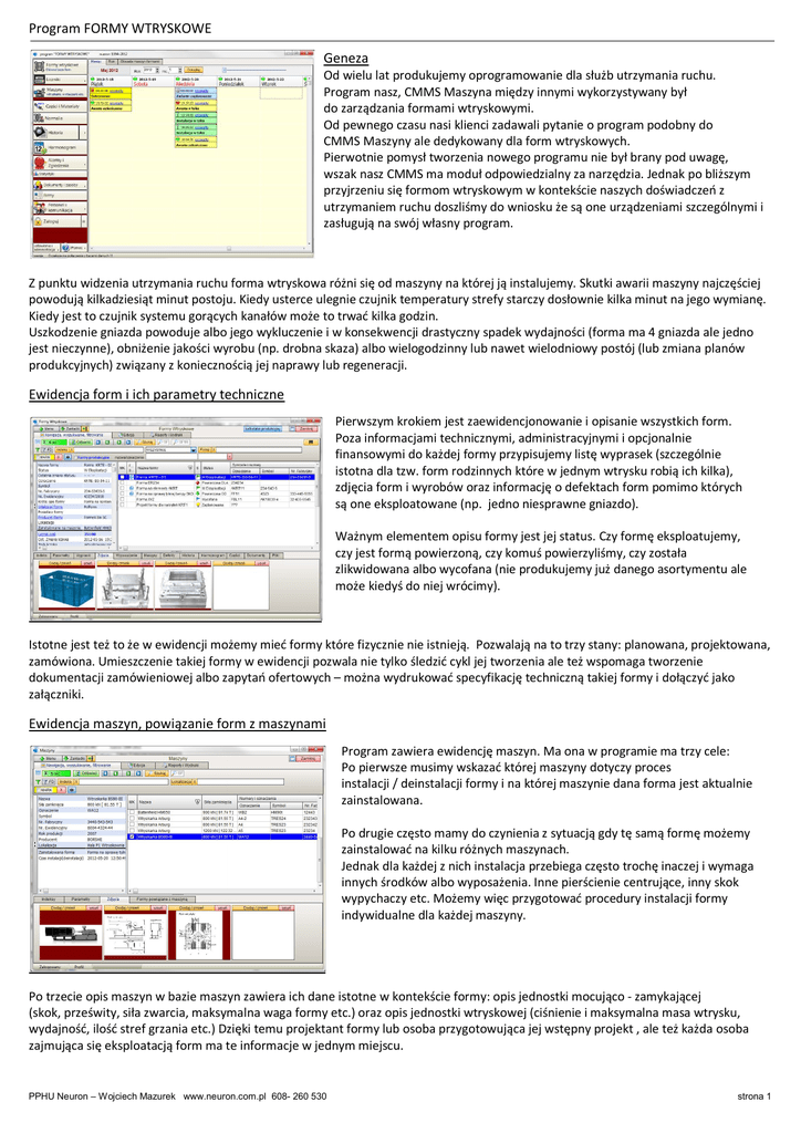 Program FORMY WTRYSKOWE Geneza Od wielu lat produkujemy oprogramowanie dla służb utrzymania ruchu. Program nasz, CMMS Maszyna między innymi wykorzystywany był do zarządzania formami wtryskowymi. Od pewnego czasu nasi klienci zadawali pytanie o program podobny do CMMS Maszyny ale dedykowany dla form wtryskowych. Pierwotnie pomysł tworzenia nowego programu nie był brany pod uwagę, wszak nasz CMMS ma moduł odpowiedzialny za narzędzia. Jednak po bliższym przyjrzeniu się formom wtryskowym w kontekście naszych doświadczeń z utrzymaniem ruchu doszliśmy do wniosku że są one urządzeniami szczególnymi i zasługują na swój własny program. Z punktu widzenia utrzymania ruchu forma wtryskowa różni się od maszyny na której ją instalujemy. Skutki awarii maszyny najczęściej powodują kilkadziesiąt minut postoju. Kiedy usterce ulegnie czujnik temperatury strefy starczy dosłownie kilka minut na jego wymianę. Kiedy jest to czujnik systemu gorących kanałów może to trwać kilka godzin. Uszkodzenie gniazda powoduje albo jego wykluczenie i w konsekwencji drastyczny spadek wydajności (forma ma 4 gniazda ale jedno jest nieczynne), obniżenie jakości wyrobu (np. drobna skaza) albo wielogodzinny lub nawet wielodniowy postój (lub zmiana planów produkcyjnych) związany z koniecznością jej naprawy lub regeneracji. Ewidencja form i ich parametry techniczne Pierwszym krokiem jest zaewidencjonowanie i opisanie wszystkich form. Poza informacjami technicznymi, administracyjnymi i opcjonalnie finansowymi do każdej formy przypisujemy listę wyprasek (szczególnie istotna dla tzw. form rodzinnych które w jednym wtrysku robią ich kilka), zdjęcia form i wyrobów oraz informację o defektach form pomimo których są one eksploatowane (np. jedno niesprawne gniazdo). Ważnym elementem opisu formy jest jej status. Czy formę eksploatujemy, czy jest formą powierzoną, czy komuś powierzyliśmy, czy została zlikwidowana albo wycofana (nie produkujemy już danego asortymentu ale może kiedyś do niej wrócimy). Istotne jest też to że w ewidencji możemy mieć formy które fizycznie nie istnieją. Pozwalają na to trzy stany: planowana, projektowana, zamówiona. Umieszczenie takiej formy w ewidencji pozwala nie tylko śledzić cykl jej tworzenia ale też wspomaga tworzenie dokumentacji zamówieniowej albo zapytań ofertowych – można wydrukować specyfikację techniczną takiej formy i dołączyć jako załączniki. Ewidencja maszyn, powiązanie form z maszynami Program zawiera ewidencję maszyn. Ma ona w programie ma trzy cele: Po pierwsze musimy wskazać której maszyny dotyczy proces instalacji / deinstalacji formy i na której maszynie dana forma jest aktualnie zainstalowana. Po drugie często mamy do czynienia z sytuacją gdy tę samą formę możemy zainstalować na kilku różnych maszynach. Jednak dla każdej z nich instalacja przebiega często trochę inaczej i wymaga innych środków albo wyposażenia. Inne pierścienie centrujące, inny skok wypychaczy etc. Możemy więc przygotować procedury instalacji formy indywidualne dla każdej maszyny. Po trzecie opis maszyn w bazie maszyn zawiera ich dane istotne w kontekście formy: opis jednostki mocująco - zamykającej (skok, prześwity, siła zwarcia, maksymalna waga formy etc.) oraz opis jednostki wtryskowej (ciśnienie i maksymalna masa wtrysku, wydajność, ilość stref grzania etc.) Dzięki temu projektant formy lub osoba przygotowująca jej wstępny projekt , ale też każda osoba zajmująca się eksploatacją form ma te informacje w jednym miejscu. PPHU Neuron – Wojciech Mazurek www.neuron.com.pl 608- 260 530 strona 1 Program FORMY WTRYSKOWE Wyposażenie form Formy to często skomplikowane urządzenia posiadające wielorakie robocze i dodatkowe wyposażenie takie jak datowniki, liczniki cykli, systemy gorących kanałów z wielokanałowymi regulatorami temperatury, czujniki i interfejsy do komunikacji z systemami sterowania i kontroli ale też takie dodatkowe wyposażenie jak haki transportowe czy blokady pozwalające zabezpieczyć je na czas transportu czy składowania. Potrzeba zaewidencjonowania wyposażenia form jest szczególnie widoczna tam gdzie forma ma kilka podobnych elementów które są wymienne w zależności od maszyny na której forma jest mocowana i które mogą się, mówiąc kolokwialnie „zawieruszyć”. Normalia i części W konstrukcji form stosuje się tzw. normalia – czyli znormalizowane części do ich budowy. W naszym programie wbudowano rejestr normaliów który pozwala na tworzenie ich bazy przydatnej tak na potrzeby konstrukcji form jak ich utrzymania. Rekord rejestru normaliów jest podobny do rekordu rejestru wyposażenia formy dzięki czemu możemy kopiować informacje z rejestru normaliów do rejestru wyposażenia. Każdy użytkownik poza formą i jej wyposażeniem, i tym wbudowanym i tym zewnętrznym ma jakąś pulę części zapasowych i materiałów eksploatacyjnych. Wszystkie te części i materiały możemy zaewidencjonować w rejestrze części oraz śledzić ich rozchód czyli zużycie na naprawy, przeglądy i czynności eksploatacyjne. Liczenie cykli Jak wspomniałem forma różni się znacznie od innych maszyn w kontekście utrzymania ruchu. Kiedy planujemy przeglądy maszyn wyznaczamy je na jakiś konkretny termin a zużycie maszyny jest tak powolne że w pierwszych latach eksploatacji można je często pominąć. W przypadku form jest inaczej. Pracują one w ekstremalnych warunkach (ciśnienie i temperatura) i każdy wykonany wtrysk ma wpływ na ich stan techniczny. Dlatego całe życie formy kręci się wokół ilości cykli przez nią wykonanych. Wszelkie czynności, przeglądy, regeneracje etc. powinny być wykonane co określoną ilość cykli. Kontrola ilości cykli ma też znaczenie w kontekście form powierzonych – częstą praktyką jest produkcja na narzędziu otrzymanym od klienta i zwracając ją właścicielowi powinniśmy mieć możliwość określenia jak