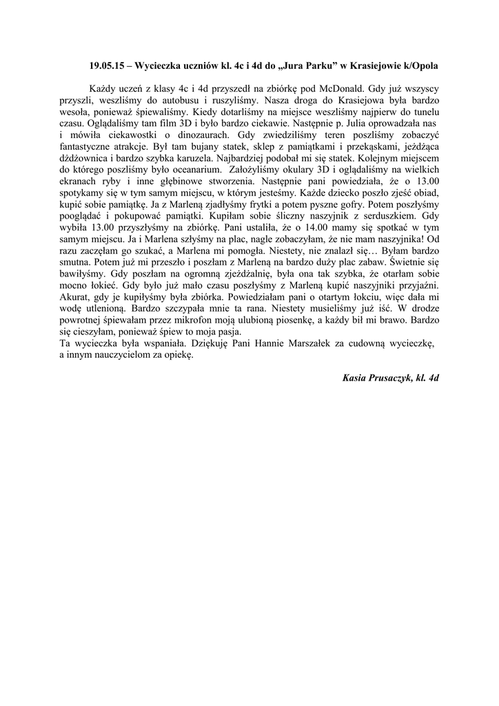19.05.15 – Wycieczka uczniów kl. 4c i 4d do „Jura Parku” w Krasiejowie k/Opola Każdy uczeń z klasy 4c i 4d przyszedł na zbiórkę pod McDonald. Gdy już wszyscy przyszli, weszliśmy do autobusu i ruszyliśmy. Nasza droga do Krasiejowa była bardzo wesoła, ponieważ śpiewaliśmy. Kiedy dotarliśmy na miejsce weszliśmy najpierw do tunelu czasu. Oglądaliśmy tam film 3D i było bardzo ciekawie. Następnie p. Julia oprowadzała nas i mówiła ciekawostki o dinozaurach. Gdy zwiedziliśmy teren poszliśmy zobaczyć fantastyczne atrakcje. Był tam bujany statek, sklep z pamiątkami i przekąskami, jeżdżąca dżdżownica i bardzo szybka karuzela. Najbardziej podobał mi się statek. Kolejnym miejscem do którego poszliśmy było oceanarium. Założyliśmy okulary 3D i oglądaliśmy na wielkich ekranach ryby i inne głębinowe stworzenia. Następnie pani powiedziała, że o 13.00 spotykamy się w tym samym miejscu, w którym jesteśmy. Każde dziecko poszło zjeść obiad, kupić sobie pamiątkę. Ja z Marleną zjadłyśmy frytki a potem pyszne gofry. Potem poszłyśmy pooglądać i pokupować pamiątki. Kupiłam sobie śliczny naszyjnik z serduszkiem. Gdy wybiła 13.00 przyszłyśmy na zbiórkę. Pani ustaliła, że o 14.00 mamy się spotkać w tym samym miejscu. Ja i Marlena szłyśmy na plac, nagle zobaczyłam, że nie mam naszyjnika! Od razu zaczęłam go szukać, a Marlena mi pomogła. Niestety, nie znalazł się… Byłam bardzo smutna. Potem już mi przeszło i poszłam z Marleną na bardzo duży plac zabaw. Świetnie się bawiłyśmy. Gdy poszłam na ogromną zjeżdżalnię, była ona tak szybka, że otarłam sobie mocno łokieć. Gdy było już mało czasu poszłyśmy z Marleną kupić naszyjniki przyjaźni. Akurat, gdy je kupiłyśmy była zbiórka. Powiedziałam pani o otartym łokciu, więc dała mi wodę utlenioną. Bardzo szczypała mnie ta rana. Niestety musieliśmy już iść. W drodze powrotnej śpiewałam przez mikrofon moją ulubioną piosenkę, a każdy bił mi brawo. Bardzo się cieszyłam, ponieważ śpiew to moja pasja. Ta wycieczka była wspaniała. Dziękuję Pani Hannie Marszałek za cudowną wycieczkę, a innym nauczycielom za opiekę. Kasia Prusaczyk, kl. 4d