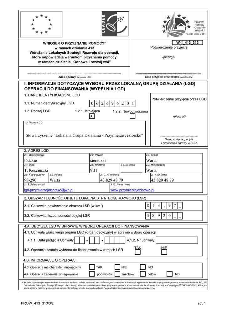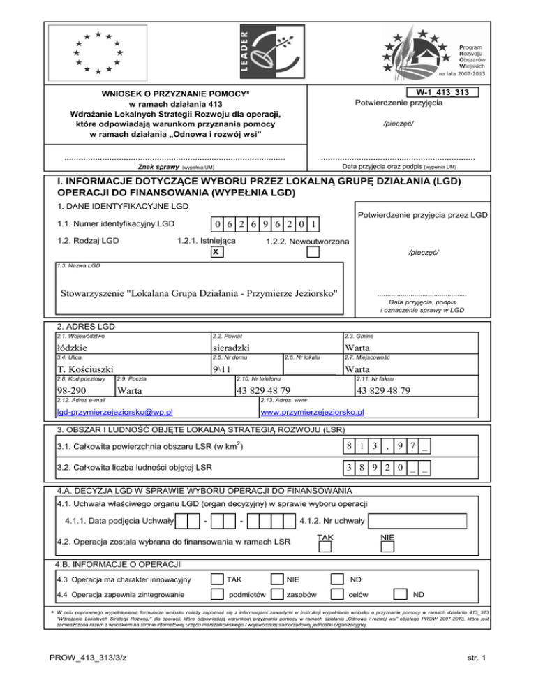Załącznik do zarzadzenia Nr……/2010 Prezesa ARiMR z dn…….2010 r. W-1_413_313 Potwierdzenie przyjęcia WNIOSEK O PRZYZNANIE POMOCY* w ramach działania 413 Wdrażanie Lokalnych Strategii Rozwoju dla operacji, które odpowiadają warunkom przyznania pomocy w ramach działania „Odnowa i rozwój wsi” /pieczęć/ ............................................................................................. Znak sprawy ................................................................. Data przyjęcia oraz podpis (wypełnia UM) (wypełnia UM) I. INFORMACJE DOTYCZĄCE WYBORU PRZEZ LOKALNĄ GRUPĘ DZIAŁANIA (LGD) OPERACJI DO FINANSOWANIA (WYPEŁNIA LGD) 1. DANE IDENTYFIKACYJNE LGD Potwierdzenie przyjęcia przez LGD 0 6 2 6 9 6 2 0 1 1.1. Numer identyfikacyjny LGD 1.2. Rodzaj LGD 1.2.1. Istniejąca X 1.2.2. Nowoutworzona /pieczęć/ 1.3. Nazwa LGD Stowarzyszenie "Lokalana Grupa Działania - Przymierze Jeziorsko" .............................................. Data przyjęcia, podpis i oznaczenie sprawy w LGD 2. ADRES LGD 2.1. Województwo 2.2. Powiat 2.3. Gmina łódzkie sieradzki 3.4. Ulica 2.5. Nr domu 2.6. Nr lokalu 9\11 __________ Warta T. Kościuszki Warta 2.7. Miejscowość 2.8. Kod pocztowy 2.9. Poczta 2.10. Nr telefonu 2.11. Nr faksu 98-290 Warta 43 829 48 79 43 829 48 79 2.12. Adres e-mail 2.13. Adres www [email protected] www.przymierzejeziorsko.pl 3. OBSZAR I LUDNOŚĆ OBJĘTE LOKALNĄ STRATEGIĄ ROZWOJU (LSR) 3.1. Całkowita powierzchnia obszaru LSR (w km2) 8 1 3 , 9 7 _ 3.2. Całkowita liczba ludności objętej LSR 3 8 9 2 0 _ _ 4.A. DECYZJA LGD W SPRAWIE WYBORU OPERACJI DO FINANSOWANIA 4.1. Uchwała właściwego organu LGD (organ decyzyjny) w sprawie wyboru operacji 4.1.1. Data podjęcia Uchwały - 4.1.2. Nr uchwały - 4.2. Operacja została wybrana do finansowania w ramach LSR TAK NIE 4.B. INFORMACJE O OPERACJI 4.3 Operacja ma charakter innowacyjny 4.4 Operacja zapewnia zintegrowanie * TAK podmiotów NIE ND zasobów celów ND W celu poprawnego wypełnienienia formularza wniosku należy zapoznać się z informacjami zawartymi w Instrukcji wypełniania wniosku o przyznanie pomocy w ramach działania 413_313 "Wdrażanie Lokalnych Strategii Rozwoju" dla operacji, które odpowiadają warunkom przyznania pomocy w ramach działania „Odnowa i rozwój wsi” objętego PROW 2007-2013, która jest zamieszczona razem z wnioskiem na stronie internetowej urzędu marszałkowskiego / wojewódzkiej samorządowej jednostki organizacyjnej. PROW_413_313/3/z str. 1 II. IDENTYFIKACJA WNIOSKODAWCY 5. NUMER IDENTYFIKACYJNY 1 6. RODZAJ WNIOSKODAWCY 6.1. Gmina 6.2. Instytucja kultury, dla której organizatorem jest jednostka samorządu terytorialnego 6.3. Osoba prawna lub jednostka organizacyjna nieposiadająca osobowości prawnej, działająca na podstawie przepisów o stosunku Państwa do Kościoła Katolickiego w Rzeczypospolitej Polskiej, o stosunku Państwa do innych kościołów lub związków wyznaniowych oraz o gwarancjach wolności sumienia i wyznania 6.4. Organizacja pozarządowa mająca status 2 organizacji pożytku publicznego 7. DANE IDENTYFIKACYJNE WNIOSKODAWCY 7.1. Nazwa 7.2. REGON 7.4. Numer KRS 7.3. Numer NIP 3 8. SIEDZIBA I ADRES WNIOSKODAWCY 8.1. Województwo 8.2. Powiat 8.4. Ulica 8.5. Nr domu 8.8. Kod pocztowy 8.9. Poczta 8.3. Gmina 8.6. Nr lokalu 8.10. Nr telefonu 8.12. Adres e-mail 8.7. Miejscowość 8.11. Nr faksu 8.13. Adres www 9. ADRES DO KORESPONDENCJI (należy wypełnić jeżeli jest inny niż w pkt 8) 9.1. Województwo 9.2. Powiat 9.4. Ulica 9.5. Nr domu 9.8. Kod pocztowy 9.9. Poczta 9.3. Gmina 9.6. Nr lokalu 9.10. Nr telefonu 9.7. Miejscowość 9.11. Nr faksu 9.12. Adres e-mail 1 Należy wpisać numer identyfikacyjny nadany zgodnie z Ustawą z dnia 18 grudnia 2003 r. o krajowym systemie ewidencji producentów, ewidencji gospodarstw rolnych oraz ewidencji wniosków o przyznanie płatności (Dz. U. z 2004 r. Nr 10, poz. 76 z późn. zm.). 2 w rozumieniu ustawy z dnia 24 kwietnia 2003 r. o działalności pożytku publicznego i o wolontariacie (Dz. U. Nr 96, poz. 873, z późn. zm.), której cele statutowe są zbieżne z celami działania "Odnowa i rozwój wsi". 3 dotyczy organizacji pozarządowej mającej status organizacji pożytku publicznego. 10. DANE OSÓB UPOWAŻNIONYCH DO REPREZENTOWANIA WNIOSKODAWCY 10.1.1. Imię 10.1.2. Nazwisko 10.1.3. Stanowisko/Funkcja 10.2.1. Imię 10.2.2. Nazwisko 10.2.3. Stanowisko/Funkcja 10.3.1. Imię 10.3.2. Nazwisko 10.3.3. Stanowisko/Funkcja PROW_413_313/3/z str. 2 11. DANE PEŁNOMOCNIKA WNIOSKODAWCY 11.1. Nazwisko/Nazwa 11.2. Imię 11.4. Województwo 11.5. Powiat 11.7. Ulica 11.8. Nr domu 11.11. Kod pocztowy 11.12. Poczta 11.3. Stanowisko/Funkcja 11.6. Gmina 11.9. Nr lokalu 11.13. Nr telefonu 11.10. Miejscowość 11.14. Nr faksu 11.15. Adres e-mail 12. DANE OSOBY UPRAWNIONEJ DO KONTAKTU 12.1. Nazwisko 12.2. Imię 12.3. Stanowisko/Funkcja 12.4. Województwo 12.5. Powiat 12.7. Ulica 12.8. Nr domu 12.11. Kod pocztowy 12.12. Poczta 12.6. Gmina 12.9. Nr lokalu 12.13. Nr telefonu 12.10. Miejscowość 12.14. Nr faksu 12.15. Adres e-mail III. OPIS OPERACJI 13. TYTUŁ OPERACJI 14. PLANOWANY CEL OPERACJI 14.1. Cel operacji 14.2. Uzasadnienie zgodności z celami LSR i kryteriami wyboru operacji przez LGD 15. MIEJSCE REALIZACJI OPERACJI 15.1. Województwo 15.4. Miejscowość A 15.2. Powiat 15.3. Gmina 15.5. Kod pocztowy 15.6. Poczta B C 15.7. Ulica/oznaczenie działki A 15.8. Nr domu B C 16. OBSZAR, NA KTÓRYM BĘDZIE REALIZOWANA OPERACJA 16.1. gmina wiejska 16.2. gmina miejsko-wiejska, z wyłączeniem miast liczących powyżej 5000 mieszkańców 16.3. gmina miejska, z wyłączeniem miejscowości liczących powyżej 5000 mieszkańców PROW_413_313/3/z str. 3 17. ZAKRES OPERACJI Zakres operacji - GŁÓWNY Koszty kwalifikowalne w zł 17.1. Budowa, przebudowa, remont lub wyposażanie budynków pełniących funkcje rekreacyjne, sportowe i społeczno - kulturalne, w tym świetlic i domów kultury, z wyłączeniem szkół, przedszkoli i żłobków 1