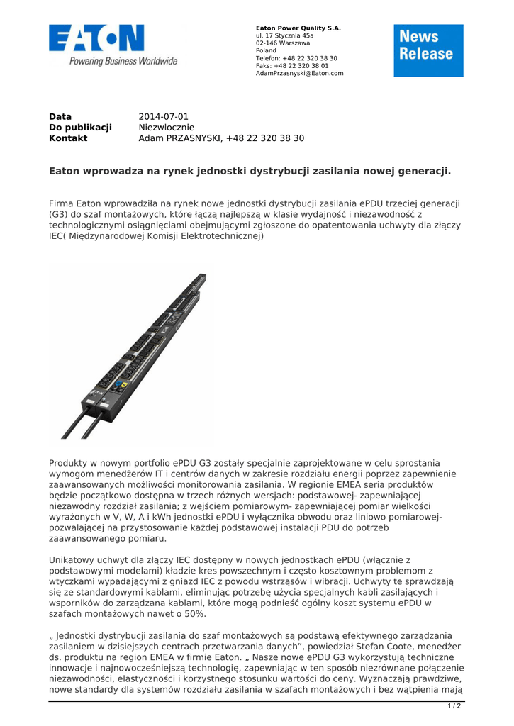 Eaton Power Quality S.A. ul. 17 Stycznia 45a 02-146 Warszawa Poland Telefon: +48 22 320 38 30 Faks: +48 22 320 38 01 [email protected] Data Do publikacji Kontakt 2014-07-01 Niezwlocznie Adam PRZASNYSKI, +48 22 320 38 30 Eaton wprowadza na rynek jednostki dystrybucji zasilania nowej generacji. Firma Eaton wprowadziła na rynek nowe jednostki dystrybucji zasilania ePDU trzeciej generacji (G3) do szaf montażowych, które łączą najlepszą w klasie wydajność i niezawodność z technologicznymi osiągnięciami obejmującymi zgłoszone do opatentowania uchwyty dla złączy IEC( Międzynarodowej Komisji Elektrotechnicznej) Produkty w nowym portfolio ePDU G3 zostały specjalnie zaprojektowane w celu sprostania wymogom menedżerów IT i centrów danych w zakresie rozdziału energii poprzez zapewnienie zaawansowanych możliwości monitorowania zasilania. W regionie EMEA seria produktów będzie początkowo dostępna w trzech różnych wersjach: podstawowej- zapewniającej niezawodny rozdział zasilania; z wejściem pomiarowym- zapewniającej pomiar wielkości wyrażonych w V, W, A i kWh jednostki ePDU i wyłącznika obwodu oraz liniowo pomiarowejpozwalającej na przystosowanie każdej podstawowej instalacji PDU do potrzeb zaawansowanego pomiaru. Unikatowy uchwyt dla złączy IEC dostępny w nowych jednostkach ePDU (włącznie z podstawowymi modelami) kładzie kres powszechnym i często kosztownym problemom z wtyczkami wypadającymi z gniazd IEC z powodu wstrząsów i wibracji. Uchwyty te sprawdzają się ze standardowymi kablami, eliminując potrzebę użycia specjalnych kabli zasilających i wsporników do zarządzana kablami, które mogą podnieść ogólny koszt systemu ePDU w szafach montażowych nawet o 50%. „ Jednostki dystrybucji zasilania do szaf montażowych są podstawą efektywnego zarządzania zasilaniem w dzisiejszych centrach przetwarzania danych”, powiedział Stefan Coote, menedżer ds. produktu na region EMEA w firmie Eaton. „ Nasze nowe ePDU G3 wykorzystują techniczne innowacje i najnowocześniejszą technologię, zapewniając w ten sposób niezrównane połączenie niezawodności, elastyczności i korzystnego stosunku wartości do ceny. Wyznaczają prawdziwe, nowe standardy dla systemów rozdziału zasilania w szafach montażowych i bez wątpienia mają 1/2 znaczący wkład w utrzymaniu ciągłości prowadzenia biznesu wszędzie tam, gdzie są używane.” Oprócz opatentowanych uchwytów IEC, nowe ePDU firmy Eaton wyróżniają się możliwością nieprzerwanej pracy w temperaturze do +60o C, co sprawia, że są idealnym wyborem do użytkowania w nowoczesnych centrach danych z podwyższonymi profilami temperaturowymi. Nisko profilowa konstrukcja 0U nowych jednostek dystrybucji sprawia, że zajmują one minimalną ilość miejsca w szafach montażowych i są kompatybilne ze wszystkimi ich rodzajami. Możliwości montażu z boku i z tyłu zapewniają nieograniczony dostęp do urządzeń IT w szafach rackowych w opcji zabudowy za pomocą kołków montażowych/spinek lub innych specyficznych systemów szybkiego i prostego montażu. Jako pomoc w zrównoważeniu obciążenia wszystkie modele ePDU G3, włączając w to wersje podstawowe, posiadają oznaczone kolorami sekcje gniazd pasujące do odpowiadających im wyłączników. Wersje liniowo pomiarowe i wejściowo-pomiarowe zostały wyposażone w wyświetlacz LCD pozwalający na łatwą konfigurację i rozwiązywanie problemów. Obie wersje posiadają również rzeczywistą dokładność pomiarową IEC ±1% wykorzystywaną do celów rozliczeń. Modele ePDU G3 podłączone do sieci pozwalają użytkownikom korzystać z programu Intelligent Power™ Manager do wykrywania, monitorowania oraz przeprowadzania masowej aktualizacji i konfiguracji wielu ePDU. Program zapewnia także integrację z platformami wirtualizacyjnymi takimi jak VMware® vCenter Server™ Nowa opatentowana funkcjonalność sieci w topologii łańcuchowej umożliwia podłączenie do czterech ePDU do pojedynczego portu sieciowego IP, zapewniając w ten sposób oszczędność kosztów do 75 % w porównaniu do konwencjonalnych jednostek dystrybucji wymagających osobnych portów. Najnowsze informacje dostępne na stronie www.eaton.eu/powerquality, na kanale @Eaton_UPS komunikatora Twitter oraz na stronie firmy Eaton EMEA w serwisie LinkedIn. Sektor elektryczny Eaton jest globalnym liderem w dziedzinie dystrybucji zasilania i zabezpieczenia obwodów; zabezpieczenia zasilania zapasowego; regulacji i automatyki; oświetlenia i bezpieczeństwa; rozwiązań strukturalnych i sprzętu instalacyjnego; rozwiązań do pracy w surowych i niebezpiecznych warunkach; a także usług inżynieryjnych. Dzięki swojemu zestawowi globalnych rozwiązań Eaton jest w stanie sprostać najbardziej krytycznym wyzwaniom w zarządzaniu zasilaniem elektrycznym dnia dzisiejszego. Eaton to przedsiębiorstwo zarządzające zasilaniem, którego sprzedaż w 2013 r. wyniosła 22,0 mld USD. Eaton oferuje energooszczędne rozwiązania wspomagające efektywne zarządzanie wykorzystaniem energii elektrycznej, hydraulicznej i mechanicznej w sposób bardziej skuteczny, bezpieczny i zrównoważony. Eaton zatrudnia około 101 000 pracowników i oferuje swoje produkty w ponad 175 krajach. Aby uzyskać więcej informacji, patrz www.eaton.eu. 2/2 Powered by TCPDF (www.tcpdf.org)