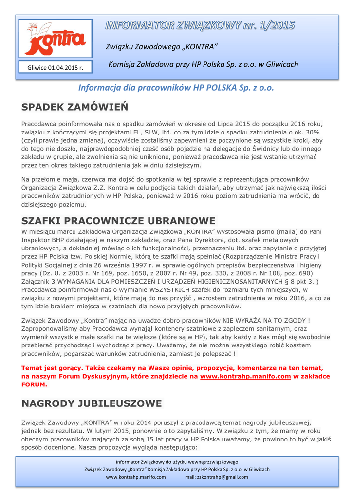 Związku Zawodowego „KONTRA” Gliwice 01.04.2015 r. Komisja Zakładowa przy HP Polska Sp. z o.o. w Gliwicach Informacja dla pracowników HP POLSKA Sp. z o.o. SPADEK ZAMÓWIEŃ Pracodawca poinformowała nas o spadku zamówień w okresie od Lipca 2015 do początku 2016 roku, związku z kończącymi się projektami EL, SLW, itd. co za tym idzie o spadku zatrudnienia o ok. 30% (czyli prawie jedna zmiana), oczywiście zostaliśmy zapewnieni że poczynione są wszystkie kroki, aby do tego nie doszło, najprawdopodobniej cześć osób pojedzie na delegacje do Świdnicy lub do innego zakładu w grupie, ale zwolnienia są nie uniknione, ponieważ pracodawca nie jest wstanie utrzymać przez ten okres takiego zatrudnienia jak w dniu dzisiejszym. Na przełomie maja, czerwca ma dojść do spotkania w tej sprawie z reprezentująca pracowników Organizacja Związkowa Z.Z. Kontra w celu podjęcia takich działań, aby utrzymać jak największą ilości pracowników zatrudnionych w HP Polska, ponieważ w 2016 roku poziom zatrudnienia ma wrócić, do dzisiejszego poziomu. SZAFKI PRACOWNICZE UBRANIOWE W miesiącu marcu Zakładowa Organizacja Związkowa „KONTRA” wystosowała pismo (maila) do Pani Inspektor BHP działającej w naszym zakładzie, oraz Pana Dyrektora, dot. szafek metalowych ubraniowych, a dokładniej mówiąc o ich funkcjonalności, przeznaczeniu itd. oraz zapytanie o przyjętej przez HP Polska tzw. Polskiej Normie, którą te szafki mają spełniać (Rozporządzenie Ministra Pracy i Polityki Socjalnej z dnia 26 września 1997 r. w sprawie ogólnych przepisów bezpieczeństwa i higieny pracy (Dz. U. z 2003 r. Nr 169, poz. 1650, z 2007 r. Nr 49, poz. 330, z 2008 r. Nr 108, poz. 690) Załącznik 3 WYMAGANIA DLA POMIESZCZEŃ I URZĄDZEŃ HIGIENICZNOSANITARNYCH § 8 pkt 3. ) Pracodawca poinformował nas o wymianie WSZYSTKICH szafek do rozmiaru tych mniejszych, w związku z nowymi projektami, które mają do nas przyjść , wzrostem zatrudnienia w roku 2016, a co za tym idzie brakiem miejsca w szatniach dla nowo przyjętych pracowników. Związek Zawodowy „Kontra” mając na uwadze dobro pracowników NIE WYRAŻA NA TO ZGODY ! Zaproponowaliśmy aby Pracodawca wynajął kontenery szatniowe z zapleczem sanitarnym, oraz wymienił wszystkie małe szafki na te większe (które są w HP), tak aby każdy z Nas mógł się swobodnie przebierać przychodząc i wychodząc z pracy. Uważamy, że nie można wszystkiego robić kosztem pracowników, pogarszać warunków zatrudnienia, zamiast je polepszać ! Temat jest gorący. Także czekamy na Wasze opinie, propozycje, komentarze na ten temat, na naszym Forum Dyskusyjnym, które znajdziecie na www.kontrahp.manifo.com w zakładce FORUM. NAGRODY JUBILEUSZOWE Związek Zawodowy „KONTRA” w roku 2014 poruszył z pracodawcą temat nagrody jubileuszowej, jednak bez rezultatu. W lutym 2015, ponownie o to zapytaliśmy. W związku z tym, że mamy w roku obecnym pracowników mających za sobą 15 lat pracy w HP Polska uważamy, że powinno to być w jakiś sposób docenione. Nasza propozycja wygląda następująco: Informator Związkowy do użytku wewnątrzzwiązkowego Związek Zawodowy „Kontra” Komisja Zakładowa przy HP Polska Sp. z o.o. w Gliwicach www.kontrahp.manifo.com mail: [email protected] 5 lat pracy w HP Polska = 50% miesięcznego wynagrodzenia 10 lat pracy w HP Polska = 75% miesięcznego wynagrodzenia 15 lat pracy w HP Polska = 100% miesięczne wynagrodzenie 20 lat pracy w HP Polska = 125% miesięczne wynagrodzenie Proponujemy również aby takie zarządzenie wchodziło z dniem 1 stycznia 2015r. Zatem nastąpiło by wyrównanie dla pracowników, którzy jubileusz obchodzili w tym roku. W dalszym ciągu nie uzyskaliśmy na to odpowiedzi, ale mamy nadzieję, że zostanie ten temat w niedługim czasie ponownie poruszony, z korzyścią dla pracowników. NOTATKA SŁUŻBOWA w celu dyscyplinowania pracowników Często stosowana przez pracodawców forma dyscyplinująca pracowników w postaci „notatki służbowej” lub innych „pism ostrzegawczych” jest praktyką niedopuszczalną. Sąd Najwyższy wyrokiem z dnia 23 listopada 2010 r. I PK105/10 uznał, iż zgodnie z Rozporządzeniem z dnia 28 maja 1996 r. w sprawie zakresu prowadzenia przez pracodawców dokumentacji w sprawach związanych ze stosunkiem pracy oraz sposobu prowadzenia akt osobowych (Dz. U. Nr 62, poz. 286) pracownika, określa wyraźnie jakie dokumenty gromadzi się w aktach osobowych. Inne dokumenty dyscyplinujące, czy „pisma ostrzegawcze” niż zawarte w § 6 niniejszego rozporządzania, nie powinny znaleźć się w aktach osobowych pracownika, a tym samym „Notatka służbowa” nie powinna figurować wśród tych dokumentów. W uzasadnieniu wyroku czytamy, iż sporządzanie takich pism czy notatek należy uznać za praktykę niedopuszczalną, prowadzącą do obejścia regulacji o nakładaniu kar porządkowych. Od "pisma ostrzegawczego" pracownik nie może się odwołać ani do pracodawcy, ani też do sądu i zakwestionować ujętych w nim zarzutów. Jednocześnie traktowanie takiego pisma inaczej niż zawiadomienia o nałożeniu kary porządkowej pozwala na jego przetrzymywanie w aktach po upływie terminów wynikających z przepisów prawa pracy. Zatem pracodawca chcąc ukarać swojego pracownika może wykorzystywać tylko katalog kar zawartych w Art.108 k.p.. „Notatka służbowa” lub inne „pismo ostrzegawcze” nie mieści się w tym katalogu, przez co takie dokumenty nie mogą być wykorzystywane w celu dyscyplinowania pracowników. Zgodnie z Art. 108 Kodeksu pracy pracodawca może nałożyć na pracownika wyłącznie trzy kary porządkowe. Należą do nich upomnienie, nagana i kara pieniężna. Przepis wyraźnie wskazuje, za jakie przewinienia na pracownika może być nałożona kara, upomnienia lub nagany, a za jakie kara pieniężna. Pracownik może być ukarany za przewinienia porządkowe, a nie przewinienia merytoryczne w wykonywaniu swoich obowiązków. Oznacz
