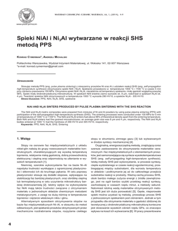 MATERIA£Y CERAMICZNE /CERAMIC MATERIALS/, 66, 1, (2014), 4-9 www.ptcer.pl/mccm Spieki NiAl i Ni3Al wytwarzane w reakcji SHS metodą PPS KONRAD CYMERMAN*, ANDRZEJ MICHALSKI Politechnika Warszawska, Wydziaá InĪynierii Materiaáowej, ul. Woáoska 141, 02-507 Warszawa *e-mail: [email protected] Streszczenie Stosując metodĊ PPS (ang. pulse plasma sintering) z mieszaniny proszków Ni oraz Al z udziaáem reakcji SHS (ang. self-propagation high-temperature synthesis) otrzymywano spieki NiAl i Ni3Al. Spiekanie prowadzono w temperaturze 1000 °C i 1100 °C w czasie 5 min przy ciĞnieniu prasowania 100 MPa. Otrzymane spieki NiAl i Ni3Al, niezaleĪnie od temperatury spiekania, miaáy gĊstoĞü wzglĊdną powyĪej 98%. Spieki miaáy drobnokrystaliczną mikrostrukturĊ. W spiekach NiAl Ğrednie ziarno wynosiáo ok. 8 m, natomiast w spiekach Ni3Al ok. 4 m. TwardoĞü spieków NiAl otrzymywanych w temperaturze 1000 °C wynosiáa 290 HV10, a spieków Ni3Al - 305 HV10. Sáowa kluczowe: PPS, NiAl, Ni3Al, SHS, spiekanie NiAl AND Ni3Al SINTERS PRODUCED BY PULSE PLASMA SINTERING WITH THE SHS REACTION The NiAl and Ni3Al matrix composites were prepared from mixtures of Ni and Al powders by using pulse plasma sintering (PPS) with participation of the self-propagation high-temperature synthesis (SHS). The sintering processes were conducted under 100 MPa for 5 min at temperatures of 1000 °C or 1100°C. The NiAl and Ni3Al sinters had above 98% of theoretical density apart from the sintering temperature. Both NiAl and Ni3Al sinters had ¿ne grained microstructures; an average grain size was 8 m and 4 m, respectively. The NiAl and Ni3Al bodies sintered at 1000 °C had the hardness of 290 HV10 and 305 HV10, respectively. Keywords: PPS, NiAl, Ni3Al, SHS, Sintering 1. WstĊp Stopy na osnowie faz miĊdzymetalicznych z ukáadu nikiel-glin naleĪą do grupy nowoczesnych materiaáów konstrukcyjnych, charakteryzujących siĊ wysoką temperaturą topnienia, relatywnie niską gĊstoĞcią, dobrą przewodnoĞcią elektryczną i cieplną oraz odpornoĞcią na utlenianie w wysokich temperaturach [1]. Niemniej, szerokie wykorzystanie faz na bazie Ni–Al napotyka trudnoĞci wynikające z ograniczonej plastycznoĞci i skáonnoĞci ich do kruchego pĊkania. W celu poprawy plastycznoĞci stosuje siĊ dodatki stopowe, wpáywające na stabilizacjĊ faz bardziej plastycznych, oraz obróbkĊ cieplną lub termoplastyczną w celu uczynienia mikrostruktury bardziej drobnoziarnistą [2]. Istotny wpáyw na wykorzystanie faz NiAl mają takĪe trudnoĞci związane z otrzymaniem materiaáu o jednorodnym skáadzie chemicznym metodami metalurgicznymi, z uwagi na duĪą róĪnicĊ w temperaturze topnienia i ciĊĪarze wáaĞciwym niklu i glinu. Alternatywnym sposobem otrzymywania stopów na bazie faz miĊdzymetalicznych Ni–Al, w stosunku do metod odlewniczych, jest spiekanie proszków otrzymywanych przez mechaniczne rozdrabnianie stopów, rozpylanie ciekáego 4 stopu w strumieniu zimnego gazu [3] lub wytwarzanych w drodze syntezy mechanicznej [4]. Oryginalną, energooszczĊdną metodą, znajdującą coraz szersze zastosowanie do otrzymywania materiaáów ceramicznych i faz miĊdzymetalicznych z elementarnych proszków, jest samorozwijająca siĊ synteza wysokotemperaturowa SHS (ang. self-propagating high-temperature synthesis). Istotą metody SHS jest wykorzystanie, w procesie syntezy, ciepáa wydzielanego w czasie reakcji egzotermicznej, przebiegającej miĊdzy substratami, dla wzrostu temperatury w ukáadzie i podtrzymanie jej aĪ do caákowitego przejĞcia substratów reakcji w produkty. WaĪną cechą procesu SHS, obok bardzo maáego zuĪycia energii z Ĩródáa zewnĊtrznego, jest na ogóá bardzo szybki przebieg reakcji syntezy, zachodzącej w czasach rzĊdu minut, a niekiedy sekund. Natomiast istotną wadą materiaáów otrzymywanych metodą SHS jest ich duĪa porowatoĞü [5]. GĊste, nieporowate spieki moĪna uzyskaü tą metodą, prowadząc proces SHS z jednoczesnym spiekaniem pod ciĞnieniem. Jednak w tym przypadku dla otrzymania materiaáu o gĊstoĞci zbliĪonej do teoretycznej z drobnokrystaliczną mikrostrukturą konieczne jest stosowanie wysokich ciĞnieĔ rzĊdu GPa, co znacząco wpáywa na koszt ich wytwarzania [6]. W pracy prezentowane SPIEKI NiAl I Ni3Al WYTWARZANE W REAKCJI SHS METODĄ PPS są wyniki badaĔ wáaĞciwoĞci fazy NiAl i Ni3Al wytwarzanych metodą impulsowo-plazmowego spiekania (PPS – ang. pulse plasma sintering) opracowaną na Wydziale InĪynierii Materiaáowej, PW. 2. Metoda PPS W metodzie PPS do inicjacji reakcji SHS wykorzystywane są silnoprądowe impulsy elektryczne. Zastosowanie silnoprądowych impulsów prądu elektrycznego stwarza specy¿czne warunki dla reakcji syntezy i spiekania proszku, a związane jest to z wydzieleniem w spiekanym materiale w czasie rzĊdu kilkuset mikrosekund energii rzĊdu kilku kJ. Taki sposób ogrzewania z jednoczesnym prasowaniem proszku zapewnia szybkie uzyskanie temperatury zapáonu reakcji SHS w caáej objĊtoĞci prasowanego proszku. W procesie PPS proszek nagrzewany jest ciepáem Joule’a w miejscu kontaktu cząstek oraz wyáadowaniami iskrowymi powstających w porach miĊdzy cząstkami proszku. Na Rys. 1 przedstawiono schemat aparatury do impulsowo-plazmowego spiekania z udziaáem reakcji SHS. W procesie spiekania mieszanina proszku umieszczona jest w matrycy gra¿towej pomiĊdzy dwoma stemplami, do których doprowadzana jest energia z baterii kondensatorów. Nagrzewanie proszku realizowane jest periodycznie powtarzanymi silnoprądowymi impulsami przez rozáadowanie baterii kondensatorów (200 F), áadowanej do napiĊcia maksymalnie 10 kV. Zastosowanie kondensatorów, jako Ĩródáa energii elektrycznej, w procesie impulsowego spiekania umoĪliwia otrzymanie periodycznie powtarzanych impulsów prądu o czasie trwania wynoszącym kilkaset mikrosekund i natĊĪeniu setek kA. Rys. 1. Schemat urządzenia do impulsowo plazmowego spiekania proszków. Fig. 1. Schemat