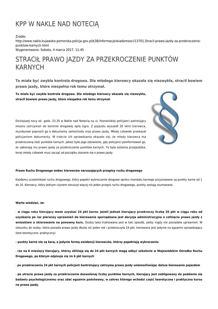 KPP W NAKLE NAD NOTECIĄ Źródło: http://www.naklo.kujawsko-pomorska.policja.gov.pl/k38/informacje/wiadomosci/13701,Stracil-prawo-jazdy-za-przekroczeniepunktow-karnych.html Wygenerowano: Sobota, 4 marca 2017, 11:45 STRACIŁ PRAWO JAZDY ZA PRZEKROCZENIE PUNKTÓW KARNYCH To miała być zwykła kontrola drogowa. Dla młodego kierowcy okazała się niezwykła, stracił bowiem prawo jazdy, które niespełna rok temu otrzymał. To miała być zwykła kontrola drogowa. Dla młodego kierowcy okazała się niezwykła, stracił bowiem prawo jazdy, które niespełna rok temu otrzymał. Dzisiejszej nocy ok. godz. 23.35 w Nakle nad Notecią na ul. Poznańskiej policjanci patrolujący miasto zatrzymali do kontroli drogowej opla tigra. Z pojazdu wyszedł 20 letni kierowca, mundurowi poprosili go o dokumenty samochodu oraz prawo jazdy. Młody człowiek przekazał policjantom dokumenty. W trakcie ich sprawdzania okazało się, że młody kierowca ma przekroczoną ilość punktów karnych. Jakież było jego zdziwienie, gdy policjanci poinformowali go, że zabierają mu prawo jazdy za przekroczenie punktów karnych. To była ostatnia przejażdżka, teraz młody człowiek musi zacząć od początku staranie się o prawo jazdy. Prawo Ruchu Drogowego wobec kierowców naruszających przepisy ruchu drogowego Każdemu uczestnikowi ruchu drogowego, który popełni wykroczenie drogowe oprócz mandatu karnego przyznawane są punkty karne od 1 do 10. Kierowcy, który jednym czynem naruszył więcej niż jeden przepis ruchu drogowego, punkty zostają zsumowane. Warto wiedzieć, że: - w ciągu roku kierujący może uzyskać 24 pkt karne. Jeżeli jednak kierujący przekroczy liczbę 20 pkt w ciągu roku od uzyskania po raz pierwszy uprawnień do kierowania sporządzana jest decyzja administracyjna o cofnięciu prawo jazdy z wnioskiem o skierowanie na ponowny kurs. Osoba taka traktowana jest w taki sposób, jakby nigdy nie posiadała uprawnień. W stosunku do osoby, która posiada prawo jazdy dłużej niż jeden rok i przekroczyła 24 pkt, kierowana jest jedynie na egzamin sprawdzający (test teoretyczno- praktyczny) - punkty karne nie są karą, a jedynie formą ewidencji kierowców, którzy popełniają wykroczenia - raz na 6 miesięcy kierujący, którzy zbliżają się do 24 pkt karnych mogą odbyć szkolenie w Wojewódzkim Ośrodku Ruchu Drogowego, po którym odpisuje się im 6 pkt karnych - po przekroczeniu 24 pkt karnych policjant kontrolujący zatrzyma prawo jazdy uniemożliwiając dalsze kierowanie pojazdem - po utracie prawa jazdy za przekroczenie dozwolonej liczby punktów karnych, kierujący jest zobligowany do poddania się badaniu psychologicznemu oraz zdać egzamin państwowy, w zakres którego wchodzi część teoretyczna i praktyczna kursu na prawo jazdy. Autor: red2.kppn Publikacja: red2.kppn Ocena: 0/5 (0) Tweetnij