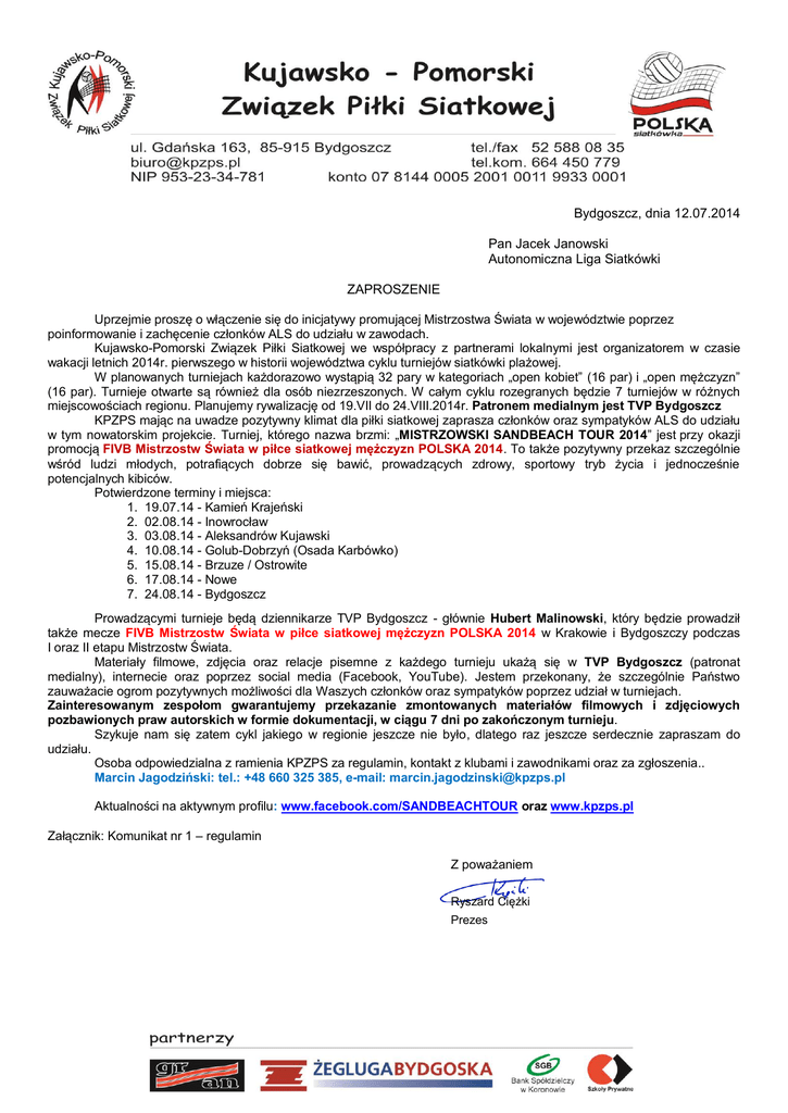 Bydgoszcz, dnia 12.07.2014 Pan Jacek Janowski Autonomiczna Liga Siatkówki ZAPROSZENIE Uprzejmie proszę o włączenie się do inicjatywy promującej Mistrzostwa Świata w województwie poprzez poinformowanie i zachęcenie członków ALS do udziału w zawodach. Kujawsko-Pomorski Związek Piłki Siatkowej we współpracy z partnerami lokalnymi jest organizatorem w czasie wakacji letnich 2014r. pierwszego w historii województwa cyklu turniejów siatkówki plażowej. W planowanych turniejach każdorazowo wystąpią 32 pary w kategoriach „open kobiet” (16 par) i „open mężczyzn” (16 par). Turnieje otwarte są również dla osób niezrzeszonych. W całym cyklu rozegranych będzie 7 turniejów w różnych miejscowościach regionu. Planujemy rywalizację od 19.VII do 24.VIII.2014r. Patronem medialnym jest TVP Bydgoszcz KPZPS mając na uwadze pozytywny klimat dla piłki siatkowej zaprasza członków oraz sympatyków ALS do udziału w tym nowatorskim projekcie. Turniej, którego nazwa brzmi: „MISTRZOWSKI SANDBEACH TOUR 2014” jest przy okazji promocją FIVB Mistrzostw Świata w piłce siatkowej mężczyzn POLSKA 2014. To także pozytywny przekaz szczególnie wśród ludzi młodych, potrafiących dobrze się bawić, prowadzących zdrowy, sportowy tryb życia i jednocześnie potencjalnych kibiców. Potwierdzone terminy i miejsca: 1. 19.07.14 - Kamień Krajeński 2. 02.08.14 - Inowrocław 3. 03.08.14 - Aleksandrów Kujawski 4. 10.08.14 - Golub-Dobrzyń (Osada Karbówko) 5. 15.08.14 - Brzuze / Ostrowite 6. 17.08.14 - Nowe 7. 24.08.14 - Bydgoszcz Prowadzącymi turnieje będą dziennikarze TVP Bydgoszcz - głównie Hubert Malinowski, który będzie prowadził także mecze FIVB Mistrzostw Świata w piłce siatkowej mężczyzn POLSKA 2014 w Krakowie i Bydgoszczy podczas I oraz II etapu Mistrzostw Świata. Materiały filmowe, zdjęcia oraz relacje pisemne z każdego turnieju ukażą się w TVP Bydgoszcz (patronat medialny), internecie oraz poprzez social media (Facebook, YouTube). Jestem przekonany, że szczególnie Państwo zauważacie ogrom pozytywnych możliwości dla Waszych członków oraz sympatyków poprzez udział w turniejach. Zainteresowanym zespołom gwarantujemy przekazanie zmontowanych materiałów filmowych i zdjęciowych pozbawionych praw autorskich w formie dokumentacji, w ciągu 7 dni po zakończonym turnieju. Szykuje nam się zatem cykl jakiego w regionie jeszcze nie było, dlatego raz jeszcze serdecznie zapraszam do udziału. Osoba odpowiedzialna z ramienia KPZPS za regulamin, kontakt z klubami i zawodnikami oraz za zgłoszenia.. Marcin Jagodziński: tel.: +48 660 325 385, e-mail: [email protected] Aktualności na aktywnym profilu: www.facebook.com/SANDBEACHTOUR oraz www.kpzps.pl Załącznik: Komunikat nr 1 – regulamin Z poważaniem Ryszard Ciężki Prezes