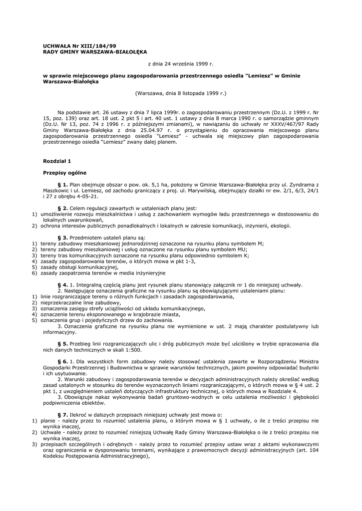 UCHWAŁA Nr XIII/184/99 RADY GMINY WARSZAWA-BIAŁOŁĘKA z dnia 24 września 1999 r. w sprawie miejscowego planu zagospodarowania przestrzennego osiedla "Lemiesz" w Gminie Warszawa-Białołęka (Warszawa, dnia 8 listopada 1999 r.) Na podstawie art. 26 ustawy z dnia 7 lipca 1999r. o zagospodarowaniu przestrzennym (Dz.U. z 1999 r. Nr 15, poz. 139) oraz art. 18 ust. 2 pkt 5 i art. 40 ust. 1 ustawy z dnia 8 marca 1990 r. o samorządzie gminnym (Dz.U. Nr 13, poz. 74 z 1996 r. z późniejszymi zmianami), w nawiązaniu do uchwały nr XXXV/467/97 Rady Gminy Warszawa-Białołęka z dnia 25.04.97 r. o przystąpieniu do opracowania miejscowego planu zagospodarowania przestrzennego osiedla “Lemiesz” - uchwala się miejscowy plan zagospodarowania przestrzennego osiedla “Lemiesz” zwany dalej planem. Rozdział 1 Przepisy ogólne § 1. Plan obejmuje obszar o pow. ok. 5,1 ha, połoŜony w Gminie Warszawa-Białołęka przy ul. Zyndrama z Maszkowic i ul. Lemiesz, od zachodu graniczący z proj. ul. Marywilską, obejmujący działki nr ew. 2/1, 6/3, 24/1 i 27 z obrębu 4-05-21. § 2. Celem regulacji zawartych w ustaleniach planu jest: 1) umoŜliwienie rozwoju mieszkalnictwa i usług z zachowaniem wymogów ładu przestrzennego w dostosowaniu do lokalnych uwarunkowań, 2) ochrona interesów publicznych ponadlokalnych i lokalnych w zakresie komunikacji, inŜynierii, ekologii. 1) 2) 3) 4) 5) 6) 1) 2) 3) 4) 5) § 3. Przedmiotem ustaleń planu są: tereny zabudowy mieszkaniowej jednorodzinnej oznaczone na rysunku planu symbolem M; tereny zabudowy mieszkaniowej i usług oznaczone na rysunku planu symbolem MU; tereny tras komunikacyjnych oznaczone na rysunku planu odpowiednio symbolem K; zasady zagospodarowania terenów, o których mowa w pkt 1-3, zasady obsługi komunikacyjnej, zasady zaopatrzenia terenów w media inŜynieryjne § 4. 1. Integralną częścią planu jest rysunek planu stanowiący załącznik nr 1 do niniejszej uchwały. 2. Następujące oznaczenia graficzne na rysunku planu są obowiązującymi ustaleniami planu: linie rozgraniczające tereny o róŜnych funkcjach i zasadach zagospodarowania, nieprzekraczalne linie zabudowy, oznaczenia zasięgu strefy uciąŜliwości od układu komunikacyjnego, oznaczenie terenu eksponowanego w krajobrazie miasta, oznaczenia grup i pojedyńczych drzew do zachowania. 3. Oznaczenia graficzne na rysunku planu nie wymienione w ust. 2 mają charakter postulatywny lub informacyjny. § 5. Przebieg linii rozgraniczających ulic i dróg publicznych moŜe być uściślony w trybie opracowania dla nich danych technicznych w skali 1:500. § 6. 1. Dla wszystkich form zabudowy naleŜy stosować ustalenia zawarte w Rozporządzeniu Ministra Gospodarki Przestrzennej i Budownictwa w sprawie warunków technicznych, jakim powinny odpowiadać budynki i ich usytuowanie. 2. Warunki zabudowy i zagospodarowania terenów w decyzjach administracyjnych naleŜy określać według zasad ustalonych w stosunku do terenów wyznaczonych liniami rozgraniczającymi, o których mowa w § 4 ust. 2 pkt 1, z uwzględnieniem ustaleń dotyczących infrastruktury technicznej, o których mowa w Rozdziale 4. 3. Obowiązuje nakaz wykonywania badań gruntowo-wodnych w celu ustalenia moŜliwości i głębokości podpiwniczenia obiektów. § 7. Ilekroć w dalszych przepisach niniejszej uchwały jest mowa o: 1) planie - naleŜy przez to rozumieć ustalenia planu, o którym mowa w § 1 uchwały, o ile z treści przepisu nie wynika inaczej, 2) Uchwale - naleŜy przez to rozumieć niniejszą Uchwałę Rady Gminy Warszawa-Białołęka o ile z treści przepisu nie wynika inaczej, 3) przepisach szczególnych i odrębnych - naleŜy przez to rozumieć przepisy ustaw wraz z aktami wykonawczymi oraz ograniczenia w dysponowaniu terenami, wynikające z prawomocnych decyzji administracyjnych (art. 104 Kodeksu Postępowania Administracyjnego), 4) rysunku planu - naleŜy przez to rozumieć rysunek planu na mapie w skali 1:1000 stanowiący załącznik nr 1 do niniejszej uchwały, 5) przeznaczeniu podstawowym - naleŜy przez to rozumieć takie przeznaczenie, które powinno przewaŜać na danym obszarze, wyznaczonym liniami rozgraniczającymi, 6) przeznaczeniu dopuszczalnym - naleŜy przez to rozumieć rodzaje przeznaczenia inne niŜ podstawowe, które uzupełniają lub wzbogacają przeznaczenie podstawowe, 7) obszarze - naleŜy przez to rozumieć obszar o określonym rodzaju przeznaczenia podstawowego, wyznaczony na rysunku planu liniami rozgraniczającymi, 8) planie ogólnym Warszawy - naleŜy rozumieć przez to tekst i rysunek miejscowego planu ogólnego zagospodarowania przestrzennego m.st. Warszawy, zatwierdzonego przez Radę m.st. Warszawy uchwałą nr XXXV/199/92 z dnia 28 września 1992r. 9) usługach nieuciąŜliwych - naleŜy przez to rozumieć taką działalność detaliczną jak zakłady usług bytowych np. fryzjerstwo, magiel, naprawa obuwia czy sprzętu gospodarstwa domowego, elektrotechnicznego, ślusarstwo (np. dorabianie kluczy, naprawa rowerów), handel detaliczny itp. 10) usługach I i II stopnia obsługi - naleŜy przez to rozumieć: * I stopień - usługi podstawowe, o ograniczonym zasięgu oddziaływania dotyczącym najbliŜszego terenu, lokalne, * II stopień - usługi ponadpodstawowe, o zasięgu oddziaływania dotyczącym całej jednostki administracyjnej tj. gminy. Rozdział 2 Przepisy szczegółowe 1) 2) 3) 4) 5) 6) 1) 2) 3) 4) 5) 6) 7) § 8. 1. Na terenie przeznaczonym pod zabudowę mieszkaniową jednorodzinną [M] obowiązują następujące ustalenia: ustala się realizację nowej zabudowy mieszkaniowej jednorodzinnej o wysokości do 2,5 kondygnacji, obowiązuje wymóg zharmonizowania wyglądu zabudowy poprzez: a) realizację zabudowy z dachami kalenicowymi o nachyleniu min. 30o, b) kolorystykę elewacji - preferuje się barwy jasne c) kolorystykę pokrycia dachowego - preferuje się kolor czerwony i barwy ciemne, d) kolorystykę stolarki, e) ujednolicenie formy ogrodzeń od strony dojazdowych uli