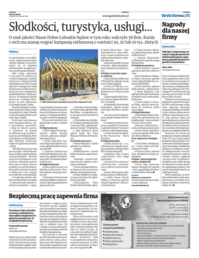 Gazeta Lubuska Czwartek, 29 września 2016 Strefa biznesu //15 www.gazetalubuska.pl Słodkości, turystyka, usługi... O znak jakości Nasze Dobre Lubuskie będzie w tym roku walczyło 38 firm. Każda z nich ma szansę wygrać kampanię reklamową o wartości 30, 20 lub 10 tys. złotych Co najważniejsze w tym plebiscycie, organizowanym przez „Gazetę Lubuską” po raz dziewiąty? To, że niejednej lubuskiej firmie pomógł on zyskać szerokie grono klientów. Jakie mamy zgłoszenia w tym roku? Po siedem jest w trzech kategoriach: artykuły spożywcze, usługi pozostałe oraz kultura i rozrywka. Po pięć zgłoszeń w kategoriach usługi turystyczne i produkt przemysłowy, po trzy w kategoriach: usługi budowlane i usługi medyczne. W kategorii artykuły spożywcze - produkty ekologiczne są dwa zgłoszenia, a w kategorii nauka - jedno. W sumie Czytelnicy oraz Kapituła konkursu będą oceniać 40 produktów i usług. Zabrakło w tym roku zgłoszeń pieczywa oraz mięsa i wędlin. Przed nami najciekawsza część naszego konkursu, czyli prezentacja produktów i usług na łamach gazety, w internecie na portalu strefabiznesu.gazetalubuska.pl oraz przed Kapitułą. Przez trzy kolejne czwartki października będziemy pokazywać i opisywać zgłoszone produkty i usługi. - Dla kilku firm już ten etap jest zwycięski - mówi Marzena Gruszczyńska z działu reklamy „Gazety Lubuskiej”. - Bowiem naszymi Czytelnikami są też szefowie, właściciele, prezesi firm, którzy widząc ciekawe produkty na naszych łamach, dzwonili do biorących udział w plebiscycie i nie czekając na wyniki oferowali kontrakty. I o to głównie chodzi w plebiscycie Nasze Dobre Lu-buskie - o wypromowanie naszych rodzimych produktów i usług. FOT. AUTOR Plebiscyt b Takie konstrukcje ciesielskie tworzy firma Alpodach z Żar Często Kapituła, która już wiele widziała, jest zaskoczona pomysłowością lubuszan na biznes, zarówno w kategorii produktowej, jak i w warstwie usługowej. W tym roku Czytelnicy i Kapituła będą oceniać te właśnie firmy: a Usługi medyczne 1.Firma Usługi Fizjoterapeutyczne Adrian Kurpias z Jasienia, zgłoszone usługi fizjoterapeutyczne 2. Firma Cedis Med. Centrum Diagnostyki Słuchu z Gorzowa zgłosiła badanie słuchu metodą ABR 3. Centrum Okulistyczne OCULISTIC Rafał Paczała z Zielonej Góry zgłosiło leczenie laserem 2RT zwyrodnienia plamki żółtej oczu a Usługi turystyczne 1.Firma Agroturystyka Jan Zdzisława Solarzowie z Trzebiela zgłosiła usługi agro-turystyczne 2.Firma Stary Folwark Jacek Jurkowski-Maślak z Lipinek Łużyckich zgłosiła gospodarstwo agroturystyczne 3. Sławskie Centrum Kultury i Wypoczynku zgłosiło Wake Park Sława - wyciąg elektryczny do uprawiania narciarstwa wodnego 4. Przedsiębiorstwo Handlowo-Usługowe Bogdan Kozubal z Gorzowa Wlkp. zgłosiło pensjonat „W sam las” w Barnówku 5. Pałac Mierzęcin Novol zgłosił Grape Spa Pałac Mierzęcin Wellness & Wine Resort a Artykuły spożywcze 1.Firma Magnolia z Lubska zgłosiła trzy produkty: - Mulatek - Koffinki kawowe – nowość! Wafle z kremem o smaku kawowym - Rondelini – nowość! Delikatny kruchy wafelek w naturalnej czekoladzie 2.Firma Catering Dietetyczny Smaczna Dieta z Gorzowa zgłosiła catering dietetyczny 3.Firma Handlowo Usługowa Anna Czarnota z Żar zgłosiła lody naturalne 4.Zielonogórska firma Nordis Chłodnie Polskie zgłosi- Bezpieczną pracę zapewnia firma Kodeks pracy Pracodawca, który zatrudnia na umowy cywilnoprawne, musi zadbać o bezpieczne i higieniczne warunki pracy. To uwzględnia Kodeks pracy Krystyna Brzozowska regiopraca.pl [email protected] Kodeks pracy ma zastosowanie wyłącznie do osób zatrudnionych w ramach umowy o pracę. Jednak jest jeden wyjątek, a mianowicie przepisy dotyczące bez- pieczeństwa i higieny pracy. W myśl art. 304 par. 1 kodeksu pracy, pracodawca ma obowiązek zapewnić bezpieczne i higieniczne warunki pracy także osobom fizycznym wykonującym pracę np. na podstawie umowy zlecenie oraz osobom prowadzącym w zakładzie pracy lub w miejscu wyznaczonym przez pracodawcę na własny rachunek działalność gospodarczą. Tak samo jak w stosunku do osób zatrudnionych na podstawie umowy o pracę, pracodawca jest zobowiązany m.in. odpowiednio organizować pracę osób zatrudnionych na umo- wach cywilnoprawnych, a także reagować na potrzeby w zakresie zapewnienia im bezpiecznych i higienicznych warunków pracy. Zakres obowiązków szefa uregulowany jest w art. 207 par. 2 kodeksu i pracy i jest znacznie szerszy i uszczegółowiony także w innych przepisach. Dlatego też należy przyjąć, że o sposobie ich realizacji względem osób niebędących pracownikami decydować będą w szczególności rodzaj pracy wykonywanej przez te osoby, a także warunki pracy i związane z nimi zagrożenia. a ła Rożki Kubuś Play! - lody śmietankowe w rożku waflowym z sosem truskawkowym udekorowane drażami z czekolady mlecznej 5.Restauracja Bella Toscana z Gorzowa – danie Lubuski Skoczek z Darami Gorzowskich Lasów a Kultura i rozrywka, imprezy cykliczne 1.Firma Klaudia Wilkowska z Zielonej Góry zgłosiła escape room Tkalnia Zagadek 2.Firma LCT-BIS Sp. z o.o. z Zielonej Góry zgłosiła Targi Budownictwa i Wyposażenia Wnętrz 3.Zielonogórski Klub Sportowy Karate zgłosił OSiR Bunkier w Świdnicy 4.Firma Kadet-OK ze Strzelec Krajeńskich zgłosiła escape room Open The Door w Gorzowie 5.Stowarzyszenie Solanizatorzy zgłosiło Solanin Film Festiwal 6. Fundacja Twórczości Ludowej „Cepeliada” z Nowej Soli zgłosiła Festiwal Twórczości Ludowej i Jadła Regionalnego 7. Gmina Przytoczna zgłosiła Dni Przytocznej - Dzień Pomidora a Usługi (pozostałe) 1.Firma Glopol Sp. z o.o. z Zielonej Góry zgłosiła sprzedaż produktów ekologicznych BIO w sklepie Ekoganik 2.Rodzinny Dom Seniora „Leśne Zacisze” z Żar – usługi opiekuńcze 3.Zachód Nieruchomości z Zielonej Góry – pośrednictwo w obrocie nieruchomościami 4.Dua