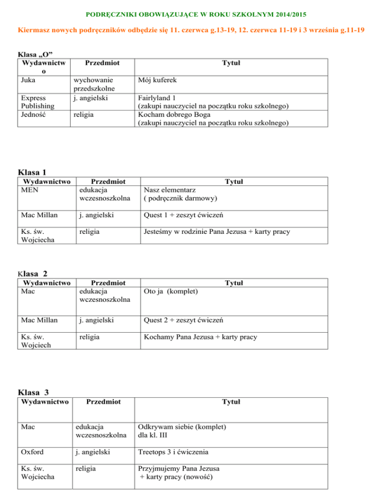 PODRĘCZNIKI OBOWIĄZUJĄCE W ROKU SZKOLNYM 2014/2015 Kiermasz nowych podręczników odbędzie się 11. czerwca g.13-19, 12. czerwca 11-19 i 3 września g.11-19 Klasa „O” Wydawnictw o Juka Express Publishing Jedność Przedmiot wychowanie przedszkolne j. angielski religia Tytuł Mój kuferek Fairlyland 1 (zakupi nauczyciel na początku roku szkolnego) Kocham dobrego Boga (zakupi nauczyciel na początku roku szkolnego) Klasa 1 Wydawnictwo MEN Przedmiot edukacja wczesnoszkolna Nasz elementarz ( podręcznik darmowy) Mac Millan j. angielski Quest 1 + zeszyt ćwiczeń Ks. św. Wojciecha religia Jesteśmy w rodzinie Pana Jezusa + karty pracy Klasa 2 Wydawnictwo Mac Tytuł Przedmiot edukacja wczesnoszkolna Tytuł Oto ja (komplet) Mac Millan j. angielski Quest 2 + zeszyt ćwiczeń Ks. św. Wojciech religia Kochamy Pana Jezusa + karty pracy Klasa 3 Wydawnictwo Przedmiot Tytuł Mac edukacja wczesnoszkolna Odkrywam siebie (komplet) dla kl. III Oxford j. angielski Treetops 3 i ćwiczenia Ks. św. Wojciecha religia Przyjmujemy Pana Jezusa + karty pracy (nowość) Klasa IV Autor /wydawnictwo E. Horwath, A. Żegleń WSiP Gdańskie Wydawnictwo Oświatowe Wyd. szkolne PWN Przedmiot j. polski matematyka historia Tytuł podręcznika Słowa z uśmiechem( nowa podstawa) podręcznik+ 2 zeszyty ćwiczeń Matematyka z plusem, 3 zeszyty ćwiczeń ( bez 4 zeszytu ćwiczeń podstawowych) My i historia. Historia i społeczeństwo. + zeszyt ćwiczeń (nowa podstawa)) Na tropach przyrody 4+ zeszyt ćwiczeń Nowa Era przyroda MAC muzyka MAC plastyka Stan Pol Stanecka Bogusława, Stanecki Czesław. zajęcia techniczne Karta rowerowa. Zajęcia techniczne w szkole podstawowej w klasach IV-VI Operon zajęcia komputerowe j. angielski Ciekawi świata IV-VI (bez ćwiczeń) Oxford Księgarnia Św. Wojciecha religia Muzyczny świat 4 + ćwiczenia Plastyka Lubię tworzyć 4 Steps in English 1 podręcznik + ćwiczenia Jestem Chrześcijaninem + karty pracy Klasa V Autor /wydawnictwo E. Horwath, A. Żegleń WSiP Przedmiot Tytuł podręcznika j. polski kl. V a Słowa z uśmiechem( nowa podstawa) podręcznik+ 2 zeszyty ćwiczeń Dobrowolska WSiP Gdańskie Wydawnictwo Oświatowe Wydawnictwo szkolne PWN Nowa Era j. polski kl. V b matematyka „Jutro pójdę w świat (nowa podstawa) + ćwiczenia Matematyka z plusem, 3 zeszyty ćwiczeń (nowa podstawa) bez 4 zeszytu ćwiczeń podstawowych historia Oxford j. angielski Mac plastyka My i historia. Historia i społeczeństwo.(nowy) + zeszyt ćwiczeń Na tropach przyrody 5 + zeszyt ćwiczeń Steps in English 2 (podręcznik + ćwiczenia) Lubię tworzyć 5 Księgarnia Św. Wojciecha religia Wierzę w Boga + karty pracy Operon MAC zajęcia komputerowe muzyka Ciekawi świata IV-VI ( kontynuacja) (bez ćwiczeń) Muzyczny świat 5 + ćwiczenia Agencja wydawnicza Stan Pol zajęcia techniczne Zajęcia techniczne. Podręcznik z ćwiczeniami cz.1 przyroda Klasa VI Autor /wydawnictwo Dobrowolska WSiP Gdańskie Wydawnictwo Oświatowe Wydawnictwo szkolne PWN Nowa Era Przedmiot j. polski matematyka historia przyroda Oxford j. angielski MAC muzyka Księgarnia Św. Wojciecha Agencja wydawnicza Stan Pol MAC religia Operon Tytuł Jutro pójdę w świat ( nowa podstawa) + ćwiczenia Matematyka z plusem, zeszyty ćwiczeń ( nowa podstawa) My i historia. Historia i społeczeństwo. + zeszyt ćwiczeń ( nowa podstawa) Na tropach przyrody 6+ ćwiczenia ( nowa podstawa) Steps in English 3 (podręcznik + ćwiczenia) Muzyczny świat 6 + ćw. zajęcia techniczne Wierzę w Kościół + karty pracy Zajęcia techniczne. Podręcznik z ćwiczeniami cz. 2 plastyka Lubię tworzyć 6 zajęcia komputerowe Ciekawi świata IV-VI ( kontynuacja) (bez ćwiczeń)
