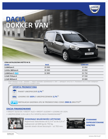 3 CENA KATALOGOWA NETTO W ZŁ SILNIK BASE CONFORT 1.6 84 Euro 5 29 900 32 850 1.6 SCe 100 Euro 6 30 900 33 850 1.6 84 Euro 5 32 800 35 750 1.5 dCi 75 Euro 5 - 37 550 1.5 dCi 90 Euro 5 - 39 800 Cennik obowiązuje od dnia 12.08.2015 r. i dotyczy samochodów wyprodukowanych w 2015 r., spełniających normę Euro 5. Prezentowane ceny są cenami katalogowymi. Liczba samochodów w promocji ograniczona. Szczegóły w salonie. OFERTA PROMOCYJNA PAKIET UBEZPIECZEŃ 2,7%(1) LEASING OD 102% Z UBEZPIECZENIEM 2,7%(1) INSTALACJA GAZOWA LPG W PROMOCYJNEJ CENIE 2900 ZŁ BRUTTO(2) DACIA FINANSOWANIE • KREDYT 50/50 0% • KREDYT 4x25 • KREDYT ULGOWY • LEASING OD 102% • UBEZPIECZENIE 3,5% LUB 2,7% Z OFERTĄ DACIA FINANSOWANIE(1) DOSKONAŁE WŁAŚCIWOŚCI UŻYTKOWE Pojemność ładunkowa od 3,3 m3 aż do 3,9 m3. Ładowność od 600 kg do 750 kg. Szeroki otwór drzwi bocznych – aż 703 mm. STARANNIE ZAPROJEKTOWANE WNĘTRZE 2 WYPOSAŻENIE DOKKER VAN Base Confort ● ● 290 1 100 ● P ● 415 ● 1 100 ● 0 ● - 1 500 Gumowa wykła dzi na podłogowa s trefy ła dunkowej (poza 1.6 LPG) - 220 Tyl ne pa nel e ś ci a nek bocznych i os łony na dkol i (poza 1.6 LPG) 8 podłogowych uchwytów do mocowa ni a ła dunku 2 uchwyty do mocowa ni a ła dunku na ś ci a ni e po s troni e bocznych drzwi przes uwa nych i 3 uchwyty po s troni e przeci wnej Ła downoś ć ● 210 ● - ● 600kg 750kg ● ● ● ● ● 370 ●/-(1.6 84 LPG) ● 370 ●/-(1.6 84 LPG) Pra we boczne drzwi przes uwa ne (ni eprzes zkl ona l ewa boczna ś ci a nka i ni eprzes zkl one tyl ne drzwi ) ● ● Przes zkl one pra we boczne drzwi przes uwa ne z otwi era ną s zybą - 210 2 przes uwa nych, bocznych drzwi z otwi era nymi s zyba mi - 1260 Tyl ne , a s ymetryczne, pełne drzwi dwus krzydłowe Dwus krzydłowe, a s ymetryczne, przes zkl one drzwi tyl ne z podgrzewa ną s zybą i wyci era czką s zyby Drzwi l ewe przes uwne pełne ● ● - 350 - 1050 Drzwi l ewe przes uwne przes zkl one - 1260 ● ● - ●/-(1.6 84 LPG) - 530 - P P WYGLĄD ZEWNĘTRZNY Przedni i tyl ny zderza k w kol orze s za rym Przedni i tyl ny zderza k w kol orze na dwozi a Boczne l i s twy ochronne w kol orze ci emnos za rym Cza rne rel i ngi da chowe Sta l owe obręcze kół 14" z mi ni koła pa ki em Obręcze kół 15" z koła pa ki em pełnym La ki er meta l i zowa ny SIEDZENIA I WYSTRÓJ WNĘTRZA Ta pi cerka ze s kóry ekol ogi cznej Ta pi cerka ma teri a łowa PRZEGRODY OCHRONNE Obrotowa przegroda kra towa montowa na w zes ta wi eni u z wyjmowa nym fotel em pa s a żera Da ci a Ea s y Sea t STREFA ŁADUNKOWA BEZPIECZEŃSTWO CZYNNE I BIERNE ABS z ukła dem ws poma ga ni a na głego ha mowa ni a ® Sys tem kontrol i toru ja zdy ESC z funkcją za pobi ega ni a poś l i zgowi kół przy rus za ni u (ASR) Czołowa podus zka powi etrzna ki erowcy Czołowa podus zka powi etrzna pa s a żera Koło za pa s owe DRZWI I SZYBY PROWADZENIE POJAZDU I INSTRUMENTY KONTROLNE Ws poma ga ni e ukła du ki erowni czego Komputer pokła dowy (ogól ny i dzi enny l i czni k ki l ometrów, przebi eg od os ta tni ego ta nkowa ni a , i l oś ć zużytego pa l i wa , ś redni e zużyci e pa l i wa , za s i ęg na pozos ta łym za pa s i e pa l i wa , ś redni a prędkoś ć, przebi eg pozos ta ły do na s tępnego przegl ądu) Ra da r cofa ni a WIDOCZNOŚĆ Refl ektory przeci wmgłowe El ekryczni e s terowa ne i podgrzewa ne l us terka ws teczne Base Confort 60 - P P 60 P P 2080 - P 530 - - 740 - 1590 - 580 820 580 KOMFORT Centra l na bl oka da drzwi El ektryczni e podnos zone s zyby przedni e Przenoś na popi el ni czka /za pa l ni czka Ki erowni ca z regul a cją w pi oni e Fotel ki erowcy z regul a cją w pi oni e Ręczna kl i ma tyza cja SCHOWKI Za myka ny s chowek w des ce rozdzi el czej RADIOODTWARZACZE I MULTIMEDIA Da ci a Pl ug&Mus i c: Ra di oodbi orni k 1 DIN USB, Gni a zdo ja ck, Bl uetooth ® Da ci a Pl ug&Ra di o: Ra di oodbi orni k CD-MP3 2 DIN USB, Gni a zdo ja ck, Bl uetooth® Da ci a Medi a Na v: wbudowa ny s ys tem na wi ga cji z 7" dotykowym ekra nem, obejmujący ra di oodbi orni k, złącze Bl uetooth z możl i woś ci ą podłączeni a przenoś nych odtwa rza czy PAKIETY Look El ektryczny Pra ktyczny 2 ● = seryjne ○ = w opcji P = element pakietu - = niedostępne Niektóre opcje wymagają zamówienia innych opcji lub wykluczają się wzajemnie. Szczegóły u Autoryzowanych Partnerów Dacii. CHARAKTERYSTYKA TECHNICZNA SILNIK Pa l i wo Typ s krzyni bi egów Norma emi s ji s pa l i n Typ s i l ni ka 3 Pojemnoś ć s kokowa (cm ) Średni ca cyl i ndra x s kok tłoka (mm) Li czba cyl i ndrów / za worów Ma ks yma l na moc kW EWG (KM) Prędkoś ć obrotowa przy ma ks yma l nej mocy Ma ks yma l ny moment obrotowy EWG (mkg) Prędkoś ć obrotowa przy ma ks yma l nym momenci e 1.6 MPI 84 1.6 SCe 100 1.6 MPI 84 LPG 1.5 dCi 75 benzyna mech. 5b Euro 5 K7M 812 1598 79,5x80,5 4/8 60,5 (82) 5000 134 2800 benzyna mech. 5b Euro 6 H4M 738 1 598 78 x 83,6 4/16 75(102) 5 600 156 4000 benzyna LPG mech. 5b Euro 5 K7M 812 1598 79,5x80,5 4/8 60,5 (82) / LPG : 59 (80) 5000 134 2800 wi el opunktowy Typ wtrys ku Wol nos s ący/doła dowa ny Ukła d wol nos s ący S/- Ka tal i za tor/Fi l tr cząs tek s tałych 1.5 dCi 90 Di es el Di es el mech. 5b mech. 5b Euro 5 Euro 5 K9K 612 K9K 612 1461 1461 76x80,5 76x80,5 4/8 4/8 55 (75) 66 (90) 4000 3750 180 200 1750 1750 bezpoś redni z s ys temem Common Ra i l + wi el owtrys k Turbos pręża rka S/S S/S OSIĄGI Ws półczynni k a reodyna mi czny SCx Prędkoś ć ma ks yma l na (km/h) od 0 do 100 km/h (s ) 400 m ze s tartu za trzyma nego (s ) 1000 m ze s tartu za trzyma nego (s ) 0,965 159 13,7 19 35,6 0,965 170 12,7 18,3 34,2 0,965 159 14,3 /LPG : 14,9 19 / LPG : 19,3 35,6 / LPG : 36,1 0,965 150 15,9 21 37,9 0,965 162 13,6 19 35,5 175 9,9 6,2 7,9 50 140 7,7 5,3 6,2 50 175 / LPG : 144 9,9 / LPG : 11,7 6,2 / LPG : 7,5 7,9 / LPG : 9,0 50 118 5,2 4,1 4,5 50 118 5,2 4,2 4,5 50 ZUŻYCIE PALIWA I EMISJA CO2 CO2 (w cykl umi es za nym w g/km) W cykl 
