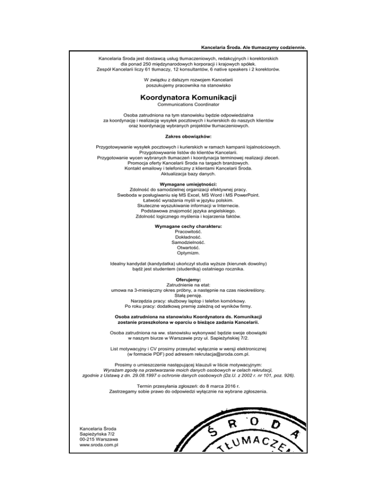 Kancelaria Środa. Ale tłumaczymy codziennie. Kancelaria Środa jest dostawcą usług tłumaczeniowych, redakcyjnych i korektorskich dla ponad 250 międzynarodowych korporacji i krajowych spółek. Zespół Kancelarii liczy 61 tłumaczy, 12 konsultantów, 6 native speakers i 2 korektorów. W związku z dalszym rozwojem Kancelarii poszukujemy pracownika na stanowisko Koordynatora Komunikacji Communications Coordinator Osoba zatrudniona na tym stanowisku będzie odpowiedzialna za koordynację i realizację wysyłek pocztowych i kurierskich do naszych klientów oraz koordynację wybranych projektów tłumaczeniowych. Zakres obowiązków: Przygotowywanie wysyłek pocztowych i kurierskich w ramach kampanii lojalnościowych. Przygotowywanie listów do klientów Kancelarii. Przygotowanie wycen wybranych tłumaczeń i koordynacja terminowej realizacji zleceń. Promocja oferty Kancelarii Środa na targach branżowych. Kontakt emailowy i telefoniczny z klientami Kancelarii Środa. Aktualizacja bazy danych. Wymagane umiejętności: Zdolność do samodzielnej organizacji efektywnej pracy. Swoboda w posługiwaniu się MS Excel, MS Word i MS PowerPoint. Łatwość wyrażania myśli w języku polskim. Skuteczne wyszukiwanie informacji w Internecie. Podstawowa znajomość języka angielskiego. Zdolność logicznego myślenia i kojarzenia faktów. Wymagane cechy charakteru: Pracowitość. Dokładność. Samodzielność. Otwartość. Optymizm. Idealny kandydat (kandydatka) ukończył studia wyższe (kierunek dowolny) bądź jest studentem (studentką) ostatniego rocznika. Oferujemy: Zatrudnienie na etat: umowa na 3-miesięczny okres próbny, a następnie na czas nieokreślony. Stałą pensję. Narzędzia pracy: służbowy laptop i telefon komórkowy. Po roku pracy: dodatkową premię zależną od wyników firmy. Osoba zatrudniona na stanowisku Koordynatora ds. Komunikacji zostanie przeszkolona w oparciu o bieżące zadania Kancelarii. Osoba zatrudniona na ww. stanowisku wykonywać będzie swoje obowiązki w naszym biurze w Warszawie przy ul. Sapieżyńskiej 7/2. List motywacyjny i CV prosimy przesyłać wyłącznie w wersji elektronicznej (w formacie PDF) pod adresem [email protected]. Prosimy o umieszczenie następującej klauzuli w liście motywacyjnym: Wyrażam zgodę na przetwarzanie moich danych osobowych w celach rekrutacji, zgodnie z Ustawą z dn. 29.08.1997 o ochronie danych osobowych (Dz.U. z 2002 r. nr 101, poz. 926). Termin przesyłania zgłoszeń: do 8 marca 2016 r. Zastrzegamy sobie prawo do odpowiedzi wyłącznie na wybrane zgłoszenia. Kancelaria Środa Sapieżyńska 7/2 00-215 Warszawa www.sroda.com.pl