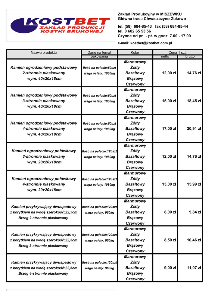 Zakład Produkcyjny w MISZEWKU Główna trasa Chwaszczyno-Żukowo tel. (58) 684-85-43 fax (58) 684-85-44 tel. 0 602 65 53 56 Czynne od pn. - pt. w godz. 7.00 - 17.00 e-mail: [email protected] Nazwa produktu Dane na temat pakowania Kamień ogrodzeniowy podstawowy 2-stronnie piaskowany wym. 40x20x18cm Ilość na palecie:60szt Kamień ogrodzeniowy podstawowy 3-stronnie piaskowany wym. 40x20x18cm Ilość na palecie:60szt Kamień ogrodzeniowy podstawowy 4-stronnie piaskowany wym. 40x20x18cm Ilość na palecie:60szt Kamień ogrodzeniowy połówkowy 3-stronnie piaskowany wym. 20x20x18cm Ilość na palecie:120szt Kamień ogrodzeniowy połówkowy 4-stronnie piaskowany wym. 20x20x18cm Ilość na palecie:120szt Kamień przykrywający dwuspadowy z korytkiem na wodę szerokość:22,5cm Brzeg 2-stronnie piaskowany Ilość na palecie:120szt Kamień przykrywający dwuspadowy z korytkiem na wodę szerokość:22,5cm Brzeg 3-stronnie piaskowany Ilość na palecie:120szt Kamień przykrywający dwuspadowy z korytkiem na wodę szerokość:22,5cm Brzeg 4-stronnie piaskowany Ilość na palecie:120szt waga palety: 1080kg waga palety: 1080kg waga palety: 1080kg waga palety: 1080kg waga palety: 1080kg waga palety: 960kg waga palety: 960kg waga palety: 960kg Kolor Marmurowy Żółty Bazaltowy Brązowy Czerwony Marmurowy Żółty Bazaltowy Brązowy Czerwony Marmurowy Żółty Bazaltowy Brązowy Czerwony Marmurowy Żółty Bazaltowy Brązowy Czerwony Marmurowy Żółty Bazaltowy Brązowy Czerwony Marmurowy Żółty Bazaltowy Brązowy Czerwony Marmurowy Żółty Bazaltowy Brązowy Czerwony Marmurowy Żółty Bazaltowy Brązowy Czerwony Cena 1 szt. netto brutto 12,00 zł 14,76 zł 15,00 zł 18,45 zł 17,00 zł 20,91 zł 12,00 zł 14,76 zł 13,00 zł 15,99 zł 8,00 zł 9,84 zł 8,50 zł 10,46 zł 9,00 zł 11,07 zł Zakład Produkcyjny w MISZEWKU Główna trasa Chwaszczyno-Żukowo tel. (58) 684-85-43 fax (58) 684-85-44 tel. 0 602 65 53 56 Czynne od pn. - pt. w godz. 7.00 - 17.00 Czynne w soboty w godz. 8.00 - 14.00 e-mail: [email protected] OGRODZENIA SZLACHETNE Systemowe ogrodzenia nadają niepowtarzalny, naturalny oraz elegancki charakter każdej posesji. Systemy ogrodzenia, składają się z tzw. zalewowych kamieni ogrodzeniowych oraz kamieni przykrawających wykonanych z grysów marmurowych, bazaltowych, oraz granitowych. Kamień ogrodzeniowy 40/20/18: 1 - 2 stronnie piaskowany(na murek) 2 - 3 stronnie piaskowany(krańcowy na murek) 3 - 4 stronnie piaskowany(na słupek) Kamień ogrodzeniowy 20/20/18: 4 - 3 stronnie piaskowany(krańcowy na murek) 5 - 4 stronnie piaskowany(na słupek) Kamień przykrywający dwuspadowy z odprowadzającym korytkiem na wodę 22,5: 6 - Brzeg 2 stronnie piaskowany(na murek 40/20/18) 7 - Brzeg 3 stronnie piaskowany(na słupek 40/20/18 lub na murek początkowy i końcowy) 8 - Brzeg 4 stronnie piaskowany(na słupek 20/20/18) Dostępne kolory : Żółty / Bazaltowy / Brązowy / Marmurowy / Czerwony Cennik obowiązuje od 01.11.2015 do 31.03.2016