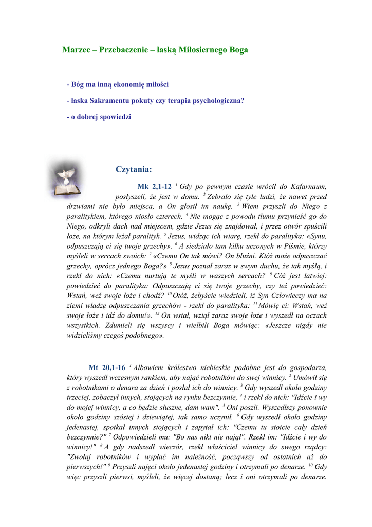 Marzec – Przebaczenie – łaską Miłosiernego Boga - Bóg ma inną ekonomię miłości - łaska Sakramentu pokuty czy terapia psychologiczna? - o dobrej spowiedzi Czytania: Mk 2,1-12 1 Gdy po pewnym czasie wrócił do Kafarnaum, posłyszeli, że jest w domu. 2 Zebrało się tyle ludzi, że nawet przed drzwiami nie było miejsca, a On głosił im naukę. 3 Wtem przyszli do Niego z paralitykiem, którego niosło czterech. 4 Nie mogąc z powodu tłumu przynieść go do Niego, odkryli dach nad miejscem, gdzie Jezus się znajdował, i przez otwór spuścili łoże, na którym leżał paralityk. 5 Jezus, widząc ich wiarę, rzekł do paralityka: «Synu, odpuszczają ci się twoje grzechy». 6 A siedziało tam kilku uczonych w Piśmie, którzy myśleli w sercach swoich: 7 «Czemu On tak mówi? On bluźni. Któż może odpuszczać grzechy, oprócz jednego Boga?» 8 Jezus poznał zaraz w swym duchu, że tak myślą, i rzekł do nich: «Czemu nurtują te myśli w waszych sercach? 9 Cóż jest łatwiej: powiedzieć do paralityka: Odpuszczają ci się twoje grzechy, czy też powiedzieć: Wstań, weź swoje łoże i chodź? 10 Otóż, żebyście wiedzieli, iż Syn Człowieczy ma na ziemi władzę odpuszczania grzechów - rzekł do paralityka: 11 Mówię ci: Wstań, weź swoje łoże i idź do domu!». 12 On wstał, wziął zaraz swoje łoże i wyszedł na oczach wszystkich. Zdumieli się wszyscy i wielbili Boga mówiąc: «Jeszcze nigdy nie widzieliśmy czegoś podobnego». Mt 20,1-16 1 Albowiem królestwo niebieskie podobne jest do gospodarza, który wyszedł wczesnym rankiem, aby nająć robotników do swej winnicy. 2 Umówił się z robotnikami o denara za dzień i posłał ich do winnicy. 3 Gdy wyszedł około godziny trzeciej, zobaczył innych, stojących na rynku bezczynnie, 4 i rzekł do nich: "Idźcie i wy do mojej winnicy, a co będzie słuszne, dam wam". 5 Oni poszli. Wyszedłszy ponownie około godziny szóstej i dziewiątej, tak samo uczynił. 6 Gdy wyszedł około godziny jedenastej, spotkał innych stojących i zapytał ich: "Czemu tu stoicie cały dzień bezczynnie?" 7 Odpowiedzieli mu: "Bo nas nikt nie najął". Rzekł im: "Idźcie i wy do winnicy!" 8 A gdy nadszedł wieczór, rzekł właściciel winnicy do swego rządcy: "Zwołaj robotników i wypłać im należność, począwszy od ostatnich aż do pierwszych!" 9 Przyszli najęci około jedenastej godziny i otrzymali po denarze. 10 Gdy więc przyszli pierwsi, myśleli, że więcej dostaną; lecz i oni otrzymali po denarze. 11 Wziąwszy go, szemrali przeciw gospodarzowi, 12 mówiąc: "Ci ostatni jedną godzinę pracowali, a zrównałeś ich z nami, którzyśmy znosili ciężar dnia i spiekoty". 13 Na to odrzekł jednemu z nich: "Przyjacielu, nie czynię ci krzywdy; czy nie o denara umówiłeś się ze mną? 14 Weź, co twoje i odejdź! Chcę też i temu ostatniemu dać tak samo jak tobie. 15 Czy mi nie wolno uczynić ze swoim, co chcę? Czy na to złym okiem patrzysz, że ja jestem dobry?" 16 Tak ostatni będą pierwszymi, a pierwsi ostatnimi». Łk 15,11-32 11 Powiedział też: «Pewien człowiek miał dwóch synów. 12 Młodszy z nich rzekł do ojca: "Ojcze, daj mi część majątku, która na mnie przypada". Podzielił więc majątek między nich. 13 Niedługo potem młodszy syn, zabrawszy wszystko, odjechał w dalekie strony i tam roztrwonił swój majątek, żyjąc rozrzutnie. 14 A gdy wszystko wydał, nastał ciężki głód w owej krainie i on sam zaczął cierpieć niedostatek. 15 Poszedł i przystał do jednego z obywateli owej krainy, a ten posłał go na swoje pola żeby pasł świnie. 16 Pragnął on napełnić swój żołądek strąkami, którymi żywiły się świnie, lecz nikt mu ich nie dawał. 17 Wtedy zastanowił się i rzekł: Iluż to najemników mojego ojca ma pod dostatkiem chleba, a ja tu z głodu ginę. 18 Zabiorę się i pójdę do mego ojca, i powiem mu: Ojcze, zgrzeszyłem przeciw Bogu i względem ciebie; 19 już nie jestem godzien nazywać się twoim synem: uczyń mię choćby jednym z najemników. 20 Wybrał się więc i poszedł do swojego ojca. A gdy był jeszcze daleko, ujrzał go jego ojciec i wzruszył się głęboko; wybiegł naprzeciw niego, rzucił mu się na szyję i ucałował go. 21 A syn rzekł do niego: "Ojcze, zgrzeszyłem przeciw Bogu i względem ciebie, już nie jestem godzien nazywać się twoim synem". 22 Lecz ojciec rzekł do swoich sług: "Przynieście szybko najlepszą szatę i ubierzcie go; dajcie mu też pierścień na rękę i sandały na nogi! 23 Przyprowadźcie utuczone cielę i zabijcie: będziemy ucztować i bawić się, 24 ponieważ ten mój syn był umarły, a znów ożył; zaginął, a odnalazł się". I zaczęli się bawić. . 25 Tymczasem starszy jego syn przebywał na polu. Gdy wracał i był blisko domu, usłyszał muzykę i tańce. 26 Przywołał jednego ze sług i pytał go, co to ma znaczyć. 27 Ten mu rzekł: "Twój brat powrócił, a ojciec twój kazał zabić utuczone cielę, ponieważ odzyskał go zdrowego". 28 Na to rozgniewał się i nie chciał wejść; wtedy ojciec jego wyszedł i tłumaczył mu. 29 Lecz on odpowiedział ojcu: "Oto tyle lat ci służę i nigdy nie przekroczyłem twojego rozkazu; ale mnie nie dałeś nigdy koźlęcia, żebym się zabawił z przyjaciółmi. 30 Skoro jednak wrócił ten syn twój, który roztrwonił twój majątek z nierządnicami, kazałeś zabić dla niego utuczone cielę". 31 Lecz on mu odpowiedział: "Moje dziecko, ty zawsze jesteś przy mnie i wszystko moje do ciebie należy. 32 A trzeba się weselić i cieszyć z tego, że ten brat twój był umarły, a znów ożył, zaginął, a odnalazł się"». Proponowane fragmenty nauczania Prymasa (…) Jak bardzo to jest potrzebne, to z łaski Bożej rozeznajemy bliżej w zamęcie, który obecnie przeżywa nasza Ojczyzna. Instytucje się walą i nie mają zupełnie siły, ażeby się obronić. l nie obronią się. Jak domek z kart wszystko się rozsypuje w wyniku niemocy wewnęt
