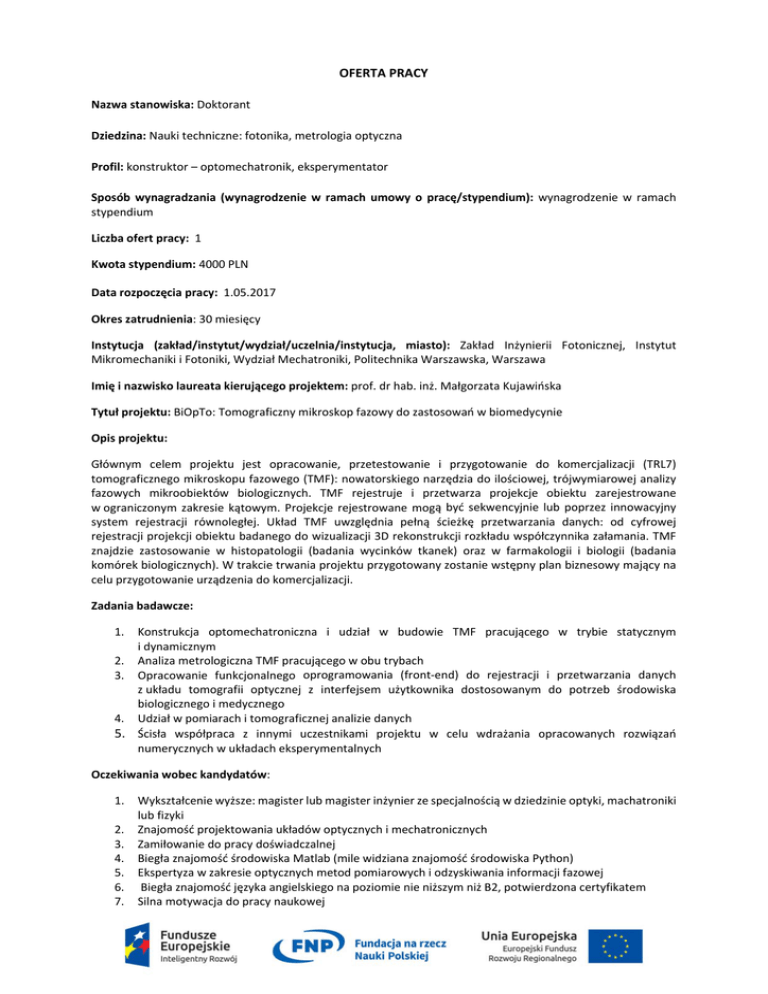 OFERTA PRACY Nazwa stanowiska: Doktorant Dziedzina: Nauki techniczne: fotonika, metrologia optyczna Profil: konstruktor – optomechatronik, eksperymentator Sposób wynagradzania (wynagrodzenie w ramach umowy o pracę/stypendium): wynagrodzenie w ramach stypendium Liczba ofert pracy: 1 Kwota stypendium: 4000 PLN Data rozpoczęcia pracy: 1.05.2017 Okres zatrudnienia: 30 miesięcy Instytucja (zakład/instytut/wydział/uczelnia/instytucja, miasto): Zakład Inżynierii Fotonicznej, Instytut Mikromechaniki i Fotoniki, Wydział Mechatroniki, Politechnika Warszawska, Warszawa Imię i nazwisko laureata kierującego projektem: prof. dr hab. inż. Małgorzata Kujawińska Tytuł projektu: BiOpTo: Tomograficzny mikroskop fazowy do zastosowań w biomedycynie Opis projektu: Głównym celem projektu jest opracowanie, przetestowanie i przygotowanie do komercjalizacji (TRL7) tomograficznego mikroskopu fazowego (TMF): nowatorskiego narzędzia do ilościowej, trójwymiarowej analizy fazowych mikroobiektów biologicznych. TMF rejestruje i przetwarza projekcje obiektu zarejestrowane w ograniczonym zakresie kątowym. Projekcje rejestrowane mogą być sekwencyjnie lub poprzez innowacyjny system rejestracji równoległej. Układ TMF uwzględnia pełną ścieżkę przetwarzania danych: od cyfrowej rejestracji projekcji obiektu badanego do wizualizacji 3D rekonstrukcji rozkładu współczynnika załamania. TMF znajdzie zastosowanie w histopatologii (badania wycinków tkanek) oraz w farmakologii i biologii (badania komórek biologicznych). W trakcie trwania projektu przygotowany zostanie wstępny plan biznesowy mający na celu przygotowanie urządzenia do komercjalizacji. Zadania badawcze: 1. Konstrukcja optomechatroniczna i udział w budowie TMF pracującego w trybie statycznym i dynamicznym 2. Analiza metrologiczna TMF pracującego w obu trybach 3. Opracowanie funkcjonalnego oprogramowania (front‐end) do rejestracji i przetwarzania danych z układu tomografii optycznej z interfejsem użytkownika dostosowanym do potrzeb środowiska biologicznego i medycznego 4. Udział w pomiarach i tomograficznej analizie danych 5. Ścisła współpraca z innymi uczestnikami projektu w celu wdrażania opracowanych rozwiązań numerycznych w układach eksperymentalnych Oczekiwania wobec kandydatów: 1. 2. 3. 4. 5. 6. 7. Wykształcenie wyższe: magister lub magister inżynier ze specjalnością w dziedzinie optyki, machatroniki lub fizyki Znajomość projektowania układów optycznych i mechatronicznych Zamiłowanie do pracy doświadczalnej Biegła znajomość środowiska Matlab (mile widziana znajomość środowiska Python) Ekspertyza w zakresie optycznych metod pomiarowych i odzyskiwania informacji fazowej Biegła znajomość języka angielskiego na poziomie nie niższym niż B2, potwierdzona certyfikatem Silna motywacja do pracy naukowej Lista wymaganych dokumentów* 1. 2. 3. 4. 5. 6. 7. List motywacyjny CV Wykaz ocen z ostatnich dwóch lat studiów (lub studium doktoranckiego) List rekomendacyjny Lista publikacji i artykułów konferencyjnych Odpis dyplomu ukończenia studiów wyższych na poziomie magistra lub magistra inżyniera Certyfikat potwierdzający znajomość języka angielskiego na poziomie nie niższym niż B2 *dokumenty w języku angielskim Dodatkowe informacje o rekrutacji (np. strona www): Adres przesyłania zgłoszeń: elektronicznie na adres e‐mail: [email protected], w temacie wiadomości proszę wpisać „Zgłoszenie na stanowisko doktoranta w projekcie BiOpTo” Termin nadsyłania zgłoszeń: 5.03.2017 Prosimy o zamieszczenie następującej klauzuli: „Wyrażam zgodę na przetwarzanie moich danych osobowych dla potrzeb niezbędnych do realizacji procesu rekrutacji zgodnie z Ustawą z dnia 29 sierpnia 1997 r. o ochronie danych osobowych ( Dz. U. z 2016 r. poz. 922 z późń. zm.)”