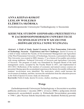 ANNA KIEPAS-KOKOT LESŁAW WOŁEJKO ELŻBIETA SKÓRSKA =DFKRGQLRSRPRUVNL8QLZHUV\WHW7HFKQRORJLF]Q\Z6]F]HFLQLH KIERUNEK STUDIÓW GOSPODARKA PRZESTRZENNA W ZACHODNIOPOMORSKIM UNIWERSYTECIE TECHNOLOGICZNYM W SZCZECINIE – DOŚWIADCZENIA I NOWE WYZWANIA Abstract: A Field of Study Spatial Economy in West Pomeranian University of Technology, Szczecin – Experiences and New Challenges. Spatial Economy as a field of study realised the Faculty of Environmental Management and Agriculture of the West Pomeranian University of Technology, Szczecin, is presented in the paper. This University was created in 2009, January, 1st as a fusion of two public universities with strong traditions: Technical University of Szczecin and Agriculture University of Szczecin. The program of study was formulated by Program Board of the land management course, accepted by the Faculty Board in 2011, and implemented in 2011/2012. Reflections of the teachers of economic and natural science courses are presented. Basing upon the accumulated experiences the factors favourably influencing students’ involvement were identified. The motivators, which could increase the involvement of students, and thus, increase the satisfaction from the education process in the field of Spatial Economy study are discussed. Keywords: Field of study, Spatial Economy, studies, teaching, university. Wstęp Zachodniopomorski Uniwersytet Technologiczny w Szczecinie to uczelnia publiczna utworzona 1 stycznia 2009 r. [Ustawa 2008] z połączenia dwóch najstarszych szczecińskich uczelni, tj. Politechniki Szczecińskiej powstałej w 1946 r. jako Wyższa Szkoła Inżynierska oraz Akademii Rolniczej powsta64 łej w 1954 r. jako Wyższa Szkoła Rolnicza w Szczecinie. Jest to pierwszy przykład fuzji uczelni publicznych, którą prawnie umożliwiła obowiązująca od 2005 r. Ustawa Prawo o szkolnictwie wyższym [Ustawa 2005]. Zgodnie z treścią tej ustawy nowa uczelnia została uznana jako tzw. uniwersytet przymiotnikowy i zaliczona do grupy uczelni technicznych [Klasyfikacja… 2016]. Zachodniopomorski Uniwersytet Technologiczny w Szczecinie przejął pracowników i cały majątek oraz strukturę uczelni macierzystych i w ten sposób składa się z 10 wydziałów, które mają łącznie 13 uprawnień do nadawania stopnia naukowego doktora habilitowanego oraz 19 uprawnień do nadawania stopnia doktora. Jednym z celów fuzji uczelni była osiągnięcie efektu synergii potencjału naukowego i dydaktycznego w stosunku do obu macierzystych uczelni [Strategia 2012]. Oceniając to z perspektywy ponad 7 lat, został on osiągnięty, o czym świadczą m.in. wyniki w rankingach uczelni krajowych oraz we współpracy z biznesem [Perspektywy… 2015; Informacja… 2016]. 1. Utworzenie kierunku gospodarka przestrzenna Korzystając ze wzmocnionego potencjału powstałej Uczelni, w 2010 r. podjęto działania prowadzące do utworzenia kierunku gospodarka przestrzenna. Ustalono, że kierunek ten będzie realizowany na Wydziale Kształtowania Środowiska i Rolnictwa z wydatną pomocą kadrową innych wydziałów, w szczególności Wydziału Ekonomicznego oraz Wydziału Budownictwa i Architektury. Uzasadnieniem takiego wyboru było to, że Wydział ten prowadził już od wielu lat kierunki studiów Ochrona Środowiska oraz Architektura Krajobrazu [Bacieczko et al. 2014], zatem gospodarka przestrzenna była naturalnym uzupełnieniem oferty dydaktycznej. W odróżnieniu jednak od innych uczelni nie ma na Wydziale jednej specjalistycznej jednostki, która mogłaby być kluczową dla tego kierunku studiów. Są za to dwie duże jednostki w strukturze Wydziału zajmujące się tematyką gospodarowania przestrzenią i kształtowania środowiska: Katedra Ekologii i Ochrony Środowiska oraz Katedra Projektowania Krajobrazu. Władze Wydziału zdecydowały, że program studiów opracuje powołana w październiku 2010 r. Rada Programowa kierunku gospodarka przestrzenna, w której skład weszło 7 osób z różnych katedr i zakładów Wydziału [Uchwała 2010]. Po trzech miesiącach intensywnych dyskusji podczas 10 kolejnych posiedzeń Rady Programowej opracowano oparty na podstawie ministerialnych standardów kształcenia program studiów inżynierskich I stopnia [Rozporządzenie… 2007], które zatwierdziła Rada Wydziału [Uchwała… 2011]. Pierwszy program studiów inżynierskich obejmował 2500 godzin, z czego 1250 godzin 65 stanowiły ćwiczenia, zwiększono do 180 (w stosunku do obowiązujących standardów kształcenia) liczbę godzin zajęć językowych odpowiadającą ustaleniom Senatu Uczelni, 7 semestrów, a w każdym nie więcej niż 8 przedmiotów, przy czym w semestrze ostatnim w związku z koniecznością przygotowania przez studentów prac inżynierskich, większość zajęć miała charakter seminaryjny. W programie umieszczono cztery przedmioty (przyrodnicze uwarunkowania gospodarowania przestrzenią, planowanie infrastruktury technicznej, planowanie przestrzenne, geograficzne systemy informacji przestrzennej) złożone z kilku części, stanowiące analog modułów opisywanych przez Churskiego [2013]. Przedmiot ‘Przyrodnicze uwarunkowania gospodarowania przestrzenią’, oznaczony jako PUGP, podzielono na 4 części tematyczne po 90 godzin każda, realizowane w kolejnych semestrach: 1) abiotyczne elementy środowiska; 2) biotyczne elementy środowiska; 3) gospodarka leśna i obszary wiejskie; 4) ochrona przyrody i krajobrazu. W programie studiów uwzględniono ponadto 30 przedmiotów obieralnych (fakultatywne), pozostawiając studentom wybór z zastrzeżeniem, że przedmiot może być uruchomiony przy 15 zainteresowanych nim studentach. 2. Tryb konkursowy powierzania przedmiotów Rada Programowa opracowała w tym okresie także kryteria konkursowe, które pozwoliłyby wybrać najlepsze oferty prowadzenia przedmiotów przez nauczycieli akademickich. Przyjęto dwa zasadnicze kryteria kwalifikacji: wykształcenie i doświadczenie oraz dorobek dydaktyczny, nauko