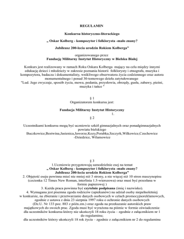 REGULAMIN Konkursu historyczno-literackiego „ Oskar Kolberg - kompozytor i folklorysta -mało znany? Jubileusz 200-lecia urodzin Rokiem Kolberga” organizowanego przez Fundację Militarny Instytut Historyczny w Bielsku Białej Konkurs jest realizowany w ramach Roku Oskara Kolberga mający na celu między innymi edukację dzieci i młodzieży w zakresie poznania historii folklorysty i etnografa, muzyka i kompozytora, badacza i dokumentalisty, wnikliwego obserwatora życia codziennego oraz autora monumentalnego i ponad 30-tomowego dzieła zatytułowanego "Lud. Jego zwyczaje, sposób życia, mowa, podania, przysłowia, obrzędy, gusła, zabawy, pieśni, muzyka i tańce " §1 Organizatorem konkursu jest: Fundacja Militarny Instytut Historyczny 1. §2 Uczestnikami konkursu mogą być uczniowie szkół gimnazjalnych oraz ponadgimnazjalnych powiatu bielskiego Buczkowice,Bestwina,Jasienica,Jaworze,Kozy,Porabka,Szczyrk,Wilkowice,Czechowice -Dziedzice, Wilamowice §3 1.Uczniowie przygotowują samodzielnie esej na temat „ Oskar Kolberg - kompozytor i folklorysta -mało znany? Jubileusz 200-lecia urodzin Rokiem Kolberga” 2. Objętość eseju powinna mieć nie mniej niż 3 strony, a nie więcej niż 10 stron maszynopisu (czcionka 12 Times New Roman, interlinia 1.5-wierszowa) oraz musi być przesłana w formie papierowej ) 3. Każda praca powinna być czytelnie podpisana (imię i nazwisko). 4. Wymagana jest pisemna zgoda rodziców (opiekunów) na udział osoby niepełnoletniej w konkursie, na zbieranie i przetwarzanie danych osobowych w celach promocyjnoreklamowych, zgodnie z ustawa z dnia 23 sierpnia 1997 roku o ochronie danych osobowych (Dz.U. Nr 133 poz. 883 z późn.zm.) oraz zgoda na przekazanie autorskich praw majątkowych do swoich prac. Zgoda musi być wyrażona na piśmie w formie oświadczenia: dla uczestników konkursu którzy nie ukończyli 18 roku życia – zgodnie z załącznikiem nr 1 do regulaminu; dla uczestników którzy ukończyli 18 rok życia – zgodnie z załącznikiem nr 2 do regulaminu konkursu. 5. Prace bez oświadczeń nie będą brały udział w konkursie. 6. Zgłoszone do konkursu prace nie mogą być, do czasu ogłoszenia wyników, publikowane w całości lub we fragmentach oraz nie mogą być nagrodzone w innych konkursach. §4 Przebieg Konkursu: Komisja Konkursowa powołana na ten cel przez przedstawicieli wymienionych w § 1 pkt. 1 ogłosi konkurs a następnie wyłoni 3 prace dla uczniów gimnazjum oraz 3 prace dla uczniów szkół ponadgimazjalych 3. Podczas oceny w pierwszym i drugim etapie konkursu będą brane pod uwagę przede wszystkim: wiek uczestnika; poprawność stylistyczna i językowa; znajomość historii dotyczącej tematu; indywidualizm; umiejętność wykorzystania źródeł w pracy (stron internetowych, artykułów, czasopism, książek itp.) §5 Każdy uczeń może zgłosić tylko jedną pracę §6 Konkurs rozpoczyna się 27 październiak 2014 roku. §7 1. Termin przesyłania prac do konkursu upływa w dniu 20 listopada roku (decyduje data stempla). 2. Organizator nie ponosi odpowiedzialności za usługi pocztowe lub za działalność osób trzecich. §8 1.Prace należy przesłać listem poleconym na adres: Fundacja Militarny Instytut Historyczny ul. Cieszyńska 70 43-300 Bielsko-Biała „ Oskar Kolberg - kompozytor i folklorysta -mało znany? Jubileusz 200-lecia urodzin Rokiem Kolberga” 2. Prace muszą zawierać następujące informacje: imię i nazwisko autora pracy, rok urodzenia, adres zamieszkania, e-mail, telefon kontaktowy, klasa uczestnika, nazwa i adres szkoły do której uczęszcza autor pracy, podpisana przez autora wersja papierowa pracy, wersja elektroniczna na płycie CD lub DVD oraz oświadczenie o którym mowa w § 3 pkt. 4. §9 1. Nagrodami w konkursie są: w obu kategoriach : dla uczniów gimnazjum oraz dla uczniów szkół ponadgimnazjalnych a. za pierwsze miejsce – nagroda rzeczowa o równowartości 300 zł b. za drugie miejsce – nagroda rzeczowa o równowartości 120 zł c. za trzecie miejsce – nagroda rzeczowa o równowartości 80 zł 3. Nazwiska autorów prac wyłonionych w konkursie podane na stronie internetowej fundacji fundacjamih.pl oraz przesłane na podane adresy mailowe 4. Uroczyste ogłoszenie wyników odbędzie się w Muzeum Regionalnym im. ks. Zygmunta Bubaka w Bestwinie Dokładna data, czas i miejsce zostanie podane na stronie internetowej o czym laureaci zostaną powiadomieni telefonicznie, mailem lub listownie. § 10 1. Przystępując do konkursu uczestnik, który zakwalifikuje się do drugiego etapu konkursu ,zobowiązuje się przenieść nieodpłatnie na Organizatora wszelkie autorskie prawa majątkowe i prawa pokrewne do prac literackich, w tym wyłączne prawa do zezwalania na wykonywanie zależnych praw autorskich oraz przenoszenia praw nabytych na inne osoby, wraz z prawem do dokonywania w nim zmian oraz do nieograniczonego w czasie korzystania w kraju i za granicą na polach eksploatacji określonych w art. 50 ustawy z dnia 4 lutego 1994 r. o prawie autorskim i prawach pokrewnych (Dz. U. Z 2006 r., Nr 90, poz. 631 z późn. zm.) w szczególności na polach eksploatacji związanych z działalnością promocyjną, marketingową i reklamową w tym praw do: wyłącznego używania i wykorzystania prac we wszelkiej działalności promocyjnej, reklamowej, informacyjnej i usługowej, utrwalania i zwielokrotniania prac wszelkimi technikami graficznymi, utrwalania i zwielokrotniania poprzez dokonywanie zapisu prac na nośnikach elektronicznych, publicznego wystawiania, wyświetlania na wszelkich imprezach otwartych i zamkniętych, nadawania na wizji przewodowej i bezprzewodowej, w tym sieci Internet, nadawania za pośrednictwem satelity, 2. wprowadzania do obrotu i dystrybucji, wprowadzania do pamięci komputera i umieszczania na stronie internetowej, najmu, dzierżawy i bezpłatnego użyczenia Organizator zastrzega sobie prawo do wykorzystania przedmiotu umowy na innych polach eksploatacji nieprzewid