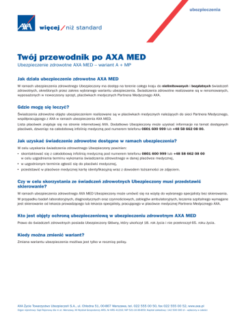 ubezpieczenia Twój przewodnik po AXA MED Ubezpieczenie zdrowotne AXA MED – wariant A + MP Jak działa ubezpieczenie zdrowotne AXA MED W ramach ubezpieczenia zdrowotnego Ubezpieczony ma dostęp na terenie całego kraju do nielimitowanych i bezpłatnych świadczeń zdrowotnych, określonych przez zakres wybranego wariantu ubezpieczenia. Świadczenia zdrowotne realizowane są w renomowanych, wyposażonych w nowoczesny sprzęt, placówkach medycznych Partnera Medycznego AXA. Gdzie mogę się leczyć? Świadczenia zdrowotne objęte ubezpieczeniem realizowane są w placówkach medycznych należących do sieci Partnera Medycznego, współpracującego z AXA w ramach ubezpieczenia AXA MED. Lista placówek znajduje się na stronie internetowej AXA. Dodatkowo Ubezpieczony może uzyskać informacje na temat dostępnych placówek, dzwoniąc na całodobową infolinię medyczną pod numerem telefonu 0801 600 999 lub +48 58 662 08 00. Jak uzyskać świadczenie zdrowotne dostępne w ramach ubezpieczenia? W celu uzyskania świadczenia zdrowotnego Ubezpieczony powinien: skontaktować się z całodobową infolinią medyczną pod numerem telefonu 0801 600 999 lub +48 58 662 08 00 w celu uzgodnienia terminu wykonania świadczenia zdrowotnego w danej placówce medycznej, w uzgodnionym terminie zgłosić się do placówki medycznej, przedstawić w placówce medycznej kartę identyfikacyjną wraz z dowodem tożsamości ze zdjęciem. Czy w celu skorzystania ze świadczeń zdrowotnych Ubezpieczony musi przedstawić skierowanie? W ramach ubezpieczenia zdrowotnego AXA MED Ubezpieczony może umówić się na wizytę do wybranego specjalisty bez skierowania. W przypadku badań laboratoryjnych, diagnostycznych oraz czynnościowych, zabiegów ambulatoryjnych, leczenia szpitalnego wymagane jest skierowanie od lekarza prowadzącego lub lekarza specjalisty, pracującego w placówce medycznej Partnera Medycznego AXA. Kto jest objęty ochroną ubezpieczeniową w ubezpieczeniu zdrowotnym AXA MED Prawo do świadczeń zdrowotnych posiada Ubezpieczony Główny, który ukończył 18. rok życia i nie przekroczył 65. roku życia. Kiedy można zmienić wariant? Zmiana wariantu ubezpieczenia możliwa jest tylko w rocznicę polisy. AXA Życie Towarzystwo Ubezpieczeń S.A., ul. Chłodna 51, 00-867 Warszawa, tel. 022 555 00 50, fax 022 555 00 52, www.axa.pl Organ rejestrowy: Sąd Rejonowy dla m.st. Warszawy, XII Wydział Gospodarczy KRS, Nr KRS 41216; NIP 521-10-36-859; Kapitał zakładowy: 142 500 000 zł – wpłacony w całości Szczegółowy zakres świadczeń zdrowotnych, do których uprawniony jest Ubezpieczony – wariant A + MP 1. Konsultacje lekarskie (internista, lekarz medycyny rodzinnej) Wizyta realizowana w ciągu 24 godzin od momentu zgłoszenia takiej potrzeby przez Ubezpieczonego, w godzinach pracy placówki medycznej należącej do sieci Partnera Medycznego AXA. Konsultacja lekarska dla dorosłych i dzieci obejmuje: zebranie wywiadu medycznego, badanie przedmiotowe, postawienie diagnozy, wystawienie zaświadczeń o stanie zdrowia oraz niezdolności do pracy, wystawienie recept na leki lub materiały medyczne, zlecenie badań diagnostycznych, interpretację badań diagnostycznych, zlecenie konsultacji specjalistycznych, konsultację przed szczepieniami ochronnymi. 2. Konsultacje specjalistyczne w dziedzinach: położnictwo i ginekologia, urologia Wizyta realizowana w ciągu 72 h od momentu zgłoszenia takiej potrzeby przez Ubezpieczonego, w godzinach pracy placówki medycznej należącej do sieci Partnera Medycznego AXA. Konsultacja lekarska dla dorosłych i dzieci obejmuje: zebranie wywiadu medycznego, badanie przedmiotowe, postawienie diagnozy, wystawienie zaświadczeń o stanie zdrowia oraz niezdolności do pracy, wystawienie recept na leki lub materiały medyczne, zlecenie badań diagnostycznych, interpretację badań diagnostycznych, zlecenie konsultacji specjalistycznych. 3. Opieka lekarska nad ciążą Opieka wybranego lekarza specjalisty w tej dziedzinie, konieczne konsultacje oraz poradnictwo zdrowotne z zakresu fizjologii przebiegu ciąży i porodu. 4. Ambulatoryjne zabiegi pielęgniarskie Zabiegi wykonywane są na zlecenie lekarza placówki medycznej należącej do sieci Partnera Medycznego AXA. dożylny wlew kroplowy, iniekcje (domięśniowe, dożylne, podskórne), inhalacje (z lekiem), opatrunki, szczepionka przeciw tężcowi, usunięcie szwów, wykonanie szczepienia Profilaktyczne badania pracowników (MP) Badania realizowane są po skierowaniu Ubezpieczonego Głównego przez Ubezpieczającego. 5.1. Koordynacja i realizacja badań wstępnych, okresowych i kontrolnych w wybranych placówkach medycznych na terenie całego kraju 5.2. Wizytacja stanowisk pracy 5.3. Prowadzenie analiz stanu zdrowia Ubezpieczonych Głównych i czynne poradnictwo lekarza medycyny pracy w stosunku do chorych na choroby zawodowe lub inne choroby związane z wykonywaną pracą 5.4. Udział lekarza medycyny pracy w zakładowej komisji bezpieczeństwa i higieny pracy 5.5. Konsultacje specjalistyczne w zależności od czynników szkodliwych na stanowisku pracy konsultacja i badanie lekarza medycyny pracy wraz z wydaniem zaświadczenia o zdolności do pracy konsultacja i badanie lekarza okulisty 5.6. Badania laboratoryjne zlecane w zależności od czynników szkodliwych na stanowisku pracy i wskazań medycznych profil podstawowy (OB, morfologia krwi obwodowej, badanie ogólne moczu, pobranie krwi) badania dodatkowe: cholesterol całkowity, cholesterol HDL, cholesterol LDL, glukoza, triglicerydy 5.7. Badania radiologiczne zlecane w zależności od czynników szkodliwych występujących na stanowisku pracy i wskazań medycznych RTG klatki piersiowej 5.8. Badania specjalistyczne zlecane w zależności od czynników szkodliwych występujących na stanowisku pracy i wskazań medycznych EKG spoczynkowe 1090509 5.