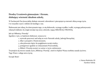 Drodzy Uczniowie gimnazjum i liceum, ślubujący wierność ideałom szkoły, W Eucharystii Pan Jezus jakby ślubuje wierność człowiekowi i pieczętuje tę wierność ofiarą swego życia. I to wszystko czyni z miłości do każdego z nas. Ślubowanie jest ofiarą, bo dotrzymanie tego, co się ślubowało, wymaga wysiłku i walki, wymaga pokonywania własnych słabości, by mógł rozwijać się nowy człowiek, żyjący MIŁOŚCIĄ I PRAWDĄ. Jak żyć Miłością i Prawdą? Zgodnie z tym, co będziecie ślubować, oznacza to: 1. wytrwale pracować nad sobą na wzór Patronki szkoły, Jadwigi Borzęckiej, 2. dbać o przyjaźń z Panem Jezusem, 3. zdecydowanie dążyć do pogłębiania swojej wiedzy, 4. postępować zgodnie ze wskazaniami Przewodnika, 5. Miłość i Prawdę uważać za ważne w życiu codziennym. Trzymajcie się mocno zasady życia „Miłością i Prawdą”, niech to będzie Wasza osobista zasada życiowa. Tego Wam z całego serca życzę. Szczęść Boże! s. Hanna Słodzinka CR Dyrektor Szkoły