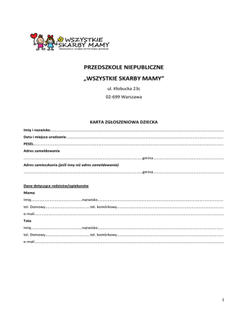 PRZEDSZKOLE NIEPUBLICZNE „WSZYSTKIE SKARBY MAMY” ul. Kłobucka 23c 02-699 Warszawa KARTA ZGŁOSZENIOWA DZIECKA Imię i nazwisko…………………………………………………………………………….………………………………………..………………………………………. Data i miejsce urodzenie………………………………………………….……………………………………………………………………………………………. PESEL………….………………………………………………………………………….………………………………………………………………………………………. Adres zameldowania …………….………………………………………………………………………………………………gmina……………………………………………………………….. Adres zamieszkania (jeśli inny niż adres zameldowania) …………………………………………………………………………………….………………………gmina……………………………………………………………….. Dane dotyczące rodziców/opiekunów Mama Imię……………………………………………..nazwisko…………………….………………………………………………..………….………………………………. tel. Domowy………………………………….…….tel. komórkowy………………….…………...…………………………….…………………………………. e-mail……………………………………………………………………………………….…………………………………………………………………………………….. Tata Imię……………………………………………..nazwisko…………………….………………………………………………..………….………………………………. tel. Domowy………………………………….…….tel. komórkowy………………….…………...…………………………….…………………………………. e-mail……………………………………………………………………………………….…………………………………………………………………………………….. 1 Upoważnienie do odbioru dziecka z przedszkola Do odbioru dziecka z przedszkola upoważnione są osoby wymienione w poniższej tabeli. W momencie odbioru przejmuje ona pełna odpowiedzialność za Jego bezpieczeństwo. Imię i nazwisko Nr dowodu osobistego Okres ważności upoważnienia Podpis rodzica 1. 2. 3. 4. 5. Oświadczam, że dziecko jest zdrowe i może uczestniczyć w zajęciach przedszkolnych. ………………………………………. Miejscowość, data ……………………………………………. czytelny podpis rodzica Wyrażam zgodę na przetwarzanie moich danych osobowych oraz danych mojego dziecka w ramach Przedszkoli Wszystkie Skarby Mamy Monika Czarniecka ul. Cicha 57, 05-152 Cybulice zgodnie z ustawą z dnia 29.08.1997r. o ochronie danych osobowych (tekst jednolity DZ.U. z 2002roku, Nr 101, poz. 926 ze zmianami) w celu realizacji opieki i wychowania przedszkolnego. Zostałem/zostałam poinformowany o prawie wglądu w moje dane osobowe oraz dane osobowe mojego dziecka i ich poprawiania. Niniejsza zgoda ma charakter dobrowolny. Administratorem danych osobowych jest Monika Czarniecka zam. zam. ul. Cicha 57, 05-152 Cybulice ………………………………………. Miejscowość, data ……………………………………………. czytelny podpis rodzica Wyrażam zgodę na dostarczanie informacji handlowej za pomocą środków komunikacji elektronicznej zgodnie z postanowieniami ustawy z dnia 18 lipca 2002 r. o świadczeniu usług drogą elektroniczną (Dz. U. Nr 144, poz. 1204, ze zm.) i w tym celu udostępniam swój e-mail. ………………………………………. Miejscowość, data ……………………………………………. czytelny podpis rodzica 2