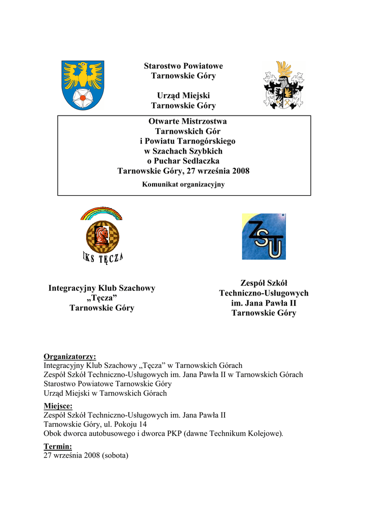 Starostwo Powiatowe Tarnowskie Góry Urząd Miejski Tarnowskie Góry Otwarte Mistrzostwa Tarnowskich Gór i Powiatu Tarnogórskiego w Szachach Szybkich o Puchar Sedlaczka Tarnowskie Góry, 27 września 2008 Komunikat organizacyjny Integracyjny Klub Szachowy „Tęcza” Tarnowskie Góry Zespół Szkół Techniczno-Usługowych im. Jana Pawła II Tarnowskie Góry Organizatorzy: Integracyjny Klub Szachowy „Tęcza” w Tarnowskich Górach Zespół Szkół Techniczno-Usługowych im. Jana Pawła II w Tarnowskich Górach Starostwo Powiatowe Tarnowskie Góry Urząd Miejski w Tarnowskich Górach Miejsce: Zespół Szkół Techniczno-Usługowych im. Jana Pawła II Tarnowskie Góry, ul. Pokoju 14 Obok dworca autobusowego i dworca PKP (dawne Technikum Kolejowe). Termin: 27 września 2008 (sobota) System rozgrywek: System szwajcarski na dystansie 9 rund. Tempo gry: po 15 minut na zawodnika W zawodach obowiązują przepisy gry FIDE i PZSzach zgodnie z Kodeksem Szachowym. Szczegóły, zwłaszcza dotyczące kolejności miejsc, podane zostaną przez sędziego głównego na odprawie technicznej. Sprzęt szachowy zapewniają organizatorzy Wpisowe: Zawodnicy z rankingiem powyŜej 2000 – pozostali seniorzy – juniorzy (do 16 lat) – zawodnicy niepełnosprawni – członkowie IKSz „Tęcza” – 40 zł 30 zł 20 zł 20 zł 20 zł. Uwaga! Organizator ma prawo odmówić udziału zawodnikom, którzy w innych turniejach szachowych wykazali się niesportowym zachowaniem. Harmonogram imprezy: 900 - 945 Przyjmowanie zgłoszeń 45 9 Odprawa techniczna 00 10 Rozpoczęcie I rundy 1000 - 1300 Rundy od I do V 1300 – 1345 Przerwa na posiłek 1345 - 1600 Rundy od VI do IX około 1615 Zakończenie turnieju Nagrody: I miejsce – 250 zł oraz puchar II miejsce – 150 zł III miejsce – 100 zł. najlepsza zawodniczka – 150 zł oraz puchar (w przypadku startu minimum 3 zawodniczek) IV - XII miejsce - nagrody rzeczowe Ponadto puchary otrzymują: najlepszy zawodnik niepełnosprawny najlepszy zawodnik powiatu tarnogórskiego najlepszy mieszkaniec Tarnowskich Gór najlepszy junior do lat 16. Organizatorzy przewidują równieŜ specjalne wyróŜnienia w następujących kategoriach dla zawodników nie nagrodzonych: dla najlepszych zawodników niepełnosprawnych, dla najlepszego zawodnika IKSz „Tęcza”. Pełna pula nagród zostanie ogłoszona po V rundzie. Wszelkie zapytania dotyczące turnieju proszę kierować: na adres: Tadeusz Bobecki, 42-606 Tarnowskie Góry, ul. Dąbrowskiego 4b telefony: (32)285 98 50; 509 406 792 e-mail: [email protected]