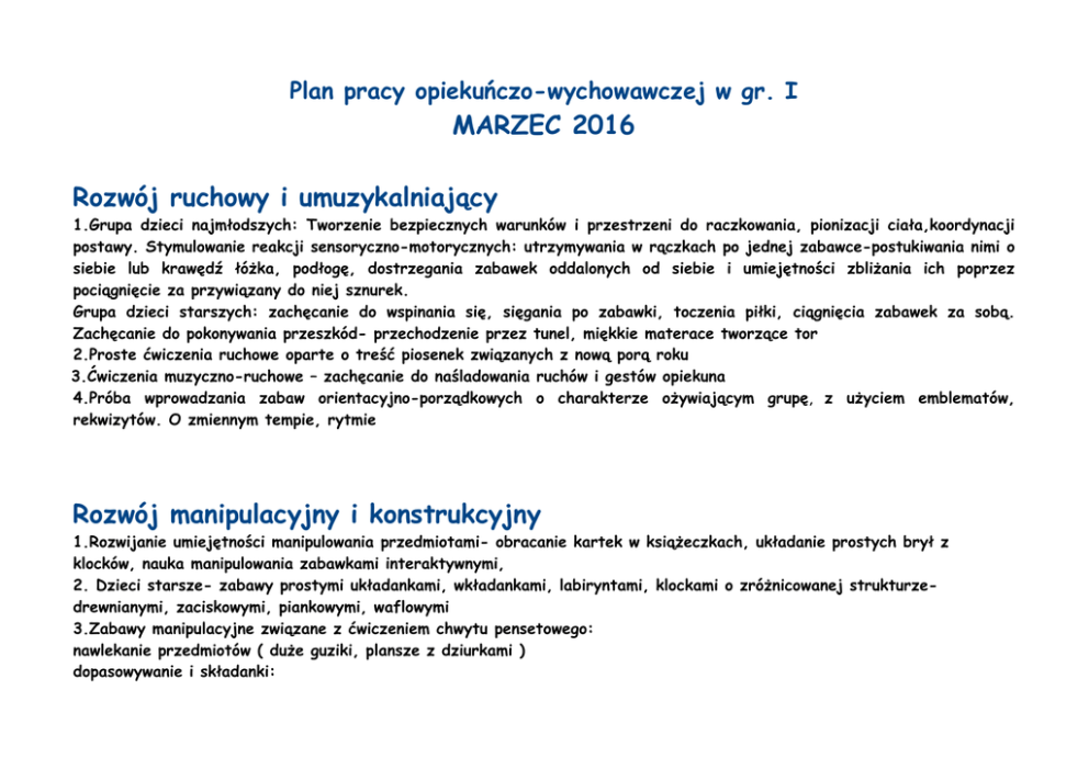 Plan pracy opiekuńczo-wychowawczy MARZEC 2016 gr I