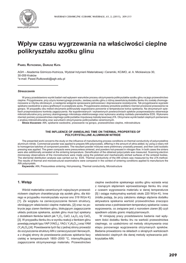 MATERIA£Y CERAMICZNE /CERAMIC MATERIALS/, 65, 2, (2013), 209-213 www.ptcer.pl/mccm Wpáyw czasu wygrzewania na wáaĞciwoĞci cieplne polikrysztaáu azotku glinu PAWEà RUTKOWSKI, DARIUSZ KATA AGH – Akademia Górniczo-Hutnicza, Wydziaá InĪynierii Materiaáowej i Ceramiki, KCiMO, al. A. Mickiewicza 30, 30-059 Kraków *e-mail: [email protected] Streszczenie W pracy przedstawiono wyniki badaĔ nad wpáywem warunków procesu otrzymywania polikrysztaáów azotku glinu na jego przewodnictwo cieplne. Przygotowane, przy uĪyciu komercyjnego proszku, zestawy azotku glinu z róĪną zawartoĞcią dodatku tlenku itru zostaáy zhomogenizowane w máynku obrotowym, a nastĊpnie wstĊpnie sprasowane jednoosiowo i doprasowane izostatycznie. Tak przygotowane wypraski spiekano swobodnie w piecu gra¿towym w przepáywie azotu. Przygotowane zestawy proszków poddano równieĪ procesowi prasowania na gorąco. W przypadku obu metod otrzymane polikrysztaáy wygrzewano ponownie w temperaturze koĔca spiekania. Na otrzymanych spiekach przeprowadzono kontrolĊ zagĊszczenia. Na wypolerowanych i wytrawionych powierzchniach spieków przeprowadzono obserwacje mikrostrukturalne przy pomocy skaningowego mikroskopu elektronowego oraz wykonano analizĊ rozkáadu pierwiastków EDS. Wykonano równieĪ pomiary przewodnictwa cieplnego polikrysztaáów impulsową metodą laserową LFA. Otrzymane wyniki badaĔ cieplnych porównano z analizą mikrostrukturalną oraz warunkami otrzymywania polikrysztaáów ceramicznych. Sáowa kluczowe: AlN, spiekanie swobodne, prasowanie na gorąco, przewodnictwo cieplne, mikrostruktura THE INFLUENCE OF ANNEALING TIME ON THERMAL PROPERTIES OF POLYCRYSTALLINE ALUMINIUM NITRIDE The presented work concerns the study on the inÀuence of manufacturing process conditions on thermal conductivity of polycrystalline aluminum nitride. Commercial powder was applied to prepare AlN polycrystals, differing in the amount of yttria added, by using a rotary mill to homogenize batches of component powders. The resultant powder mixtures were preliminary uniaxially pressed, and then cold isostatic pressing was applied. The green compacts were pressureless sintered, and powders hot-pressed in nitrogen Àow. In both cases the sinters were also additionally annealed at the sintering temperature. Densi¿cation of the obtained polycrystals was measured. Scanning electron microscopy observations of the microstructure were made using the polished and mechanically etched surfaces of the sintered bodies. The elemental distribution analysis was carried out by EDS. Thermal conductivity of the AlN sinters was measured by the LFA method. The results of thermal and microstructural examinations were compared in the context of sintering conditions applied to manufacture the AlN polycrystals. Keywords: AlN, Pressureless sintering, Hot-pressing, Thermal conductivity, Microstructure 1. WstĊp WĞród materiaáów ceramicznych najwyĪszym przewodnictwem cieplnym charakteryzuje siĊ azotek glinu, dla którego w przypadku monokrysztaáu wynosi ono 319 W/(m·K) [1]. Ze wzglĊdu na zanieczyszczenie tlenem struktury, obniĪającym wáaĞciwoĞci cieplne materiaáu, [2] oraz na pokrycie jego ziaren tlenkiem glinu, blokującym zagĊszczanie ukáadu podczas spiekania, azotek glinu musi byü spiekany z dodatkiem tlenków takich jak Y2O3, CaO, La2O3 czy CeO2 [3]. W przypadku tlenku itru w wyniku reakcji z tlenkiem glinu powstają związki typu YAP (YAlO3), YAG ( Y3Al5O12) oraz YAM (Y4Al2O9) [4]. Powstawanie tych faz z jednej strony prowadzi do oczyszczenia struktury AlN z zanieczyszczeĔ tlenowych, a z drugiej strony do powstawania podczas spiekania fazy ciekáej w temperaturach 1800–2000 °C, intensy¿kującej zagĊszczanie otrzymywanego materiaáu. Przewodnictwo cieplne swobodnie spiekanego azotku glinu wzrasta wraz z rosnącym stĊĪeniem wprowadzanego tlenku itru oraz z czasem wygrzewania materiaáu w danej temperaturze [5] i osiąga maksymalną wartoĞü okoáo 220 W/(m·K). Inne Ĩródáa podają, Īe przy zaáoĪeniu staáego stĊĪenia dodatku aktywatora spiekania wartoĞü przewodnictwa znacząco wzrasta wraz z podniesieniem temperatury spiekania i czasu wygrzewania, co związane jest z rozrostem ziaren [6] czyli spadkiem udziaáu granic miĊdzyziarnowych. W niniejszej pracy przedstawiono badania nad wpáywem iloĞci dodatku tlenku itru na wartoĞü przewodnictwa cieplnego, co uzaleĪniono od metody otrzymywania oraz etapu ponownego wygrzewania otrzymanych spieków. Badania prowadzono na skáadach o skrajnych wartoĞciach wáaĞciwoĞci cieplnych dla danej metody wytwarzania polikrysztaáów AlN. 209 P. RUTKOWSKI, D. KATA 2. Preparatyka i metodyka badawcza Do wytworzenia spieków azotku glinu uĪyto komercyjnie dostĊpnego proszku AlN ¿rmy „Starck” GmbH oraz tlenku itru produkcji tej samej ¿rmy. Substraty zestawiono stechiometrycznie, tak aby udziaá tlenku itru w mieszaninie mieĞciá siĊ w przedziale od 0% do 10% obj. Polikrysztaáy AlN otrzymano dwoma metodami, obejmującymi swobodne spiekanie i prasowanie na gorąco. Oba procesy przeprowadzono w przepáywie azotu. W przypadku prasowania na gorąco, stechiometrycznie zestawione mieszaniny proszków zhomogenizowano na mokro w alkoholu izopropylowym przy uĪyciu mielników z azotku krzemu przez okres 24 godzin. W przypadku spiekania swobodnego przygotowane w ten sam sposób proszki zgranulowano, przecierając je przez sito, a nastĊpnie po wstĊpnym zaprasowywaniu w prasie jednoosiowej otrzymano pastylki, które poddano doprasowaniu izostatycznemu pod ciĞnieniem 250 MPa. Warunki spiekania dla obydwu metod w przypadku próbek o skrajnych wartoĞciach przewodnictwa cieplnego przedstawiono w Tabeli 1. Pomiary ciepáa wáaĞciwego wykonano za pomocą analizatora termicznego Netzsch STA 449 F3, biorąc do obliczeĔ sygnaáy DSC badanego materiaáu oraz sza¿ru. DyfuzyjnoĞü cieplną zmierzono impulsową metodą laserową na urządzeniu LFA 427 ¿rmy Netzsch. Przewodnictwo