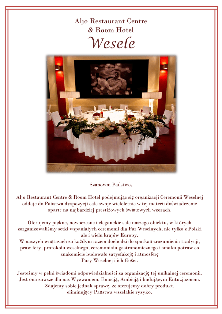 Aljo Restaurant Centre & Room Hotel Wesele Szanowni Państwo, Aljo Restaurant Centre & Room Hotel podejmując się organizacji Ceremonii Weselnej oddaje do Państwa dyspozycji całe swoje wieloletnie w tej materii doświadczenie oparte na najbardziej prestiżowych światowych wzorach. Oferujemy piękne, nowoczesne i eleganckie sale naszego obiektu, w których zorganizowaliśmy setki wspaniałych ceremonii dla Par Weselnych, nie tylko z Polski ale i wielu krajów Europy. W naszych wnętrzach za każdym razem dochodzi do spotkań zrozumienia tradycji, praw fety, protokołu weselnego, ceremoniału gastronomicznego i smaku potraw co znakomicie budowało satysfakcję i atmosferę Pary Weselnej i ich Gości. Jesteśmy w pełni świadomi odpowiedzialności za organizację tej unikalnej ceremonii. Jest ona zawsze dla nas Wyzwaniem, Emocją, Ambicją i budującym Entuzjazmem. Zdajemy sobie jednak sprawę, że oferujemy dobry produkt, eliminujący Państwa wszelakie ryzyko. Aljo Restaurant Centre & Room Hotel Oferta Weselna Szanowni Państwo, Wesele to wielkie życiowe wydarzenie. Pozostaje w pamięci przez lata. Bardzo ważne są więc uroda i klimat miejsca, jak i zapewnienie profesjonalnej obsługi. Jesteśmy przekonani, że spełniamy te warunki i powierzając nam organizację Przyjęcia Weselnego dokonują Państwo trafnego wyboru. Aljo Restaurant Centre & Room Hotel to Największy i Najnowocześniejszy Kompleks Restauracyjny w Polsce w skład którego wchodzą wyjątkowo eleganckie i przestronne sale specjalnie aranżowane na potrzeby wesela, które pozwalają organizować przyjęcia weselne nawet dla 500 osób. Zapewniamy tym samym znakomite warunki dla zorganizowania przyjęcia na najwyższym poziomie. Aljo Restaurant Centre & Room Hotel W cenie Menu otrzymują Państwo: Apartament dla Nowożeńców dostępny od Piątku do Poniedziałku. Śniadanie dla Nowożeńców. Chleb Weselny wypiekany przez cukierników Restauracji. Sale bankietowe o powierzchni dopasowanej do planowanej liczby uczestników, w uzgodnionym ustawieniu stołów i parkietem do tańca. Ceremoniał powitania Nowożeńców przed przyjęciem weselnym. Wyjątkowa niespodzianka Para Młoda otrzymuje od Restauracji Aljo podarunek w postaci zaproszenia na kolację z okazji pierwszej rocznicy wesela. Uprzejmie informujemy, że dzieciom do lat 5 zapewniamy posiłki gratis, a dla dzieci w wieku 6-10 lat koszt menu to tylko 75% wartości. Dżentelmeńsko uzgadniamy zakończenie imprezy weselnej na godzinę 05:00 rano. Natomiast poprawiny uzgadniamy na zakończenie max o 24:00 godz. Aljo Restaurant Centre & Room Hotel Ceremonia Powitania Pary Młodej Na Młodą Parę oczekują wszyscy Goście oraz Rodzice. Po przybyciu Młodej Pary Szofer pomaga wysiąść z samochodu Państwu Młodym, następuje powitanie chlebem i solą poprzez Mistrza Ceremonii, Szefa Kuchni oraz Rady Kelnerskiej. Młoda Para następnie przechodzi po czerwonym dywanie do Sali Balowej. Kelnerzy otwierają przy gościach szampana, częstując wszystkich gości podczas składania życzeń. Ostatnim Gościem składającym życzenia jest Mistrz Ceremonii, który osobiście wręcza Państwu Młodym lampkę Szampana. Wznoszony jest pierwszy toast weselny, po którym Państwo Młodzi jak każe tradycja rozbijają kieliszki „Na Szczęście”. Ceremoniał Tortu Weselnego Ceremonialny wjazd tortu weselnego wraz z fontannami, suchym lodem, specjalną muzyka, grą świateł, gigantycznymi racami. Radzaje: Izydor, Szwarcwaldzki, Orzechowy, Toffi, Tiramisu, Rojall, Capuccino, W-Z, Marcello, Napoleon, Czekoladowo-Wiśniowy. Ceremoniał Gastronomiczny Ceremonialny wjazd pokazu wraz z fontannami, żywym ogniem, specjalną muzyka, grą świateł oraz gigantycznymi racami. Dzik po Myśliwsku Prosiak po Królewsku Sum Faszerowany Indyk faszerowany Jesiotr Pieczony Łosoś Pieczony Udziec Pieczony Dodatki do pokazu kulinarnego: Ziemniaki pieczone - Kasza z warzywami - Ryż z warzywami Kapusta z grzybami lub Sałatka wiosenna Sosy na zimno (czosnkowy, meksykański) Barszcz czerwony z pasztecikiem II Kolacja płonąca: Niesamowity Pokaz Mnichów Ceremonialny wjazd Mnichów w oprawie Gregoriańskiej muzyki, gry świateł, żywym ogniem schowanymi za kłębami ciężkiego dymu. Dodatkowo, jako atrakcję Menu proponujemy: Stół Wiejski Stół z Kuchnią Śródziemnomorską Stół z Kuchnią Włoską Drink Bar Alkoholowy Fontanna czekoladowa Rollbar do piwa oraz Keg Piwa Lech Nagłośnienie Sali Pokrowce na krzesełka Dekoracja Sali: do uzgodnienia indywidualnie……. DJ Janelt, DJ Łukasz: do uzgodnienia indywidualnie… Instruktor tańca Limuzyna do wesela Obraz Młodych Wytwornica do ciężkiego dymu Płonące Imiona Młodych do Tortu Pokoje hotelowe Gigantyczny Czerwony dywan Zaawansowane Pokazy Pirotechnicznie Aljo Restaurant Centre & Room Hotel Szanowni Państwo, Mam nadzieję, że powyższa propozycja spotka się z Państwa zainteresowaniem. Zdajemy sobie sprawę, że ostateczną decyzję mogą Państwo podjąć dopiero po obejrzeniu naszej Restauracji. Zapraszam więc do nas w celu omówienia szczegółów. Oczekujemy więc na telefon od Państwa i propozycję terminu spotkania. Menager: Eskan Darwich