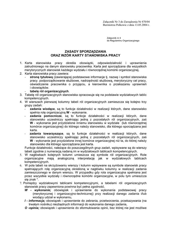 Załącznik Nr 3 do Zarządzenia Nr 870/04 Burmistrza Polkowic z dnia 13.05.2004 r. Załącznik nr 4 do Regulaminu Organizacyjnego ZASADY SPORZĄDZANIA ORAZ WZÓR KARTY STANOWISKA PRACY 1. Karta stanowiska pracy określa obowiązki, odpowiedzialność i uprawnienia zatrudnionego na danym stanowisku pracownika. Karta jest sporządzana dla wszystkich merytorycznych stanowisk każdego wydziału i równorzędnej komórki organizacyjnej. 2. Karta stanowiska pracy zawiera: - stronę tytułową (zawierającej podstawowe informacje tj. nazwę i symbol stanowiska pracy. podporządkowanie służbowe, nadrzędność służbową, merytoryczny cel pracy, oświadczenie pracownika o przyjęciu, a kierownika o przekazaniu uprawnień i obowiązków. - tabelę ról organizacyjnych. 3. Tabelę ról organizacyjnych stanowiska opracowuje się na podstawie wydziałowych tablic kompetencyjnych. 4. W wierszach pierwszej kolumny tabeli ról organizacyjnych zamieszcza się kolejno trzy grupy zadań: - zadania wiodące, są to funkcje działalności w realizacji których, dane stanowisko spełnia rolę organizacyjną W - wykonanie. - zadania pomocnicze, są to funkcje działalności w realizacji których, dane stanowisko uczestniczy spełniając jedną z pozostałych ról organizacyjnych, zaś W - wykonanie jest przydzielone innemu stanowisku w wydziale (lub równorzędnej komórce organizacyjnej) do którego należy stanowisko, dla którego sporządzana jest karta. - zadania towarzyszące, są to funkcje działalności w realizacji których, dane stanowisko uczestniczy spełniając jedną z pozostałych ról organizacyjnych, zaś W - wykonanie jest przydzielone innej komórce organizacyjnej niż ta, do której należy stanowisko dla którego sporządzana jest karta. Funkcje działalności, należące do poszczególnych grup zadań, wpisywane są do wierszy tabeli zgodnie z numeracją nadaną im w wydziałowych tablicach kompetencyjnych. 5. W nagłówkach kolejnych kolumn umieszcza się symbole ról organizacyjnych. Role organizacyjne mają analogiczną interpretację jak w wydziałowych tablicach kompetencyjnych. 6. W pola tabeli na skrzyżowaniu wierszy i kolumn wpisywane są symbole stanowisk pracy spełniających rolę organizacyjną określoną w nagłówku kolumny w realizacji zadania zamieszczonego w danym wierszu. W przypadku gdy rola organizacyjna spełniana jest przez wszystkie wydziały i równorzędne komórki organizacyjne, w polu tym umieszcza się znak *. 7. Pomiędzy wydziałowymi tablicami kompetencyjnymi, a tabelami ról organizacyjnych stanowisk pracy zapewniona powinna być pełna zgodność. W - wykonanie; obowiązek i uprawnienie do wykonania podstawowej pracy (merytorycznej i organizacyjno-technicznej) przy realizacji danego zadania i/lub wiodący udział w wykonaniu, I - informacja; obowiązek i uprawnienie do zebrania, przetworzenia, przekazywania (na trwałym nośniku) niezbędnych informacji do wykonania danego zadania, O -opinia; obowiązek i uprawnienie do sformułowania opinii, bez której nie jest możliwe zakończenie realizacji danego zadania, Dm - decyzja merytoryczna; obowiązek i uprawnienie do podjęcia i przekazania decyzji dotyczącej rozstrzygnięć merytorycznych (w formie ustnej lub pisemnej), Df - decyzja finansowa; obowiązek i uprawnienie do podjęcia i przekazania decyzji dotyczącej rozstrzygnięć finansowych związanych z decyzją merytoryczną (w formie ustnej lub pisemnej), U - udział; obowiązek i uprawnienie do uczestniczenia w realizacji danego zadania w inny sposób, np.: częściowe wykonanie, wymiana poglądów, konsultacja. Nk - nadzór z koordynacją grupową; obowiązek i uprawnienie do ogólnego nadzorowania i koordynowania sposobu i kolejności spełnianych ról organizacyjnych, w ramach danej funkcji przez kilka wydziałów lub równorzędnych komórek organizacyjnych. Nb - nadzór bezpośredni; obowiązek i uprawnienie do bezpośredniego nadzorowania i motywowania przebiegu wykonania pracy podstawowej i współdziałania wykonawcy z innymi komórkami (stanowiskami) uczestniczącymi w realizacji funkcji, a także ustalenia i przekazywania wytycznych oraz zaleceń. 8. Symbole ról organizacyjnych wpisywane są w pola tablicy, na skrzyżowaniu wierszy (zadania - funkcje działalności) i kolumn w nagłówku których zamieszczono symbole burmistrza, zastępców, sekretarza, skarbnika, dyrektora Gabinetu Burmistrza i stanowisk danego wydziału (równorzędnej komórki organizacyjnej). 9. W pola tablicy, na skrzyżowaniu wierszy i kolumn w nagłówku których zamieszczono symbole ról organizacyjnych wpisywane są symbole wydziałów i równorzędnych komórek organizacyjnych uczestniczących w realizacji danej funkcji działalności. 10. Role organizacyjne W, Dm, Ot, Nk, Nb mogą być dla danej funkcji działalności przyporządkowane tylko jednemu realizatorowi. 11. Tablice kompetencyjne poszczególnych wydziałów muszą być wzajemnie zgodne tzn.: - odwzorowany w nich podział ról organizacyjnych musi być identyczny dla danego zadania (funkcji działalności) w tablicach kompetencyjnych każdego wydziału (równorzędnej komórki organizacyjnej), który uczestniczy w jego realizacji, - identyczne pod względem merytorycznym funkcje działalności nie mogą występować pod różnymi nazwami. 12. Karty stanowisk pracy sporządza się według poniższego wzoru. 2 Wzór karty stanowiska pracy KARTA STANOWISKA PRACY W URZĘDZIE GMINY POLKOWICE Nazwa stanowiska pracy: ......................................................................................................................................... symbol................... Nazwa komórki organizacyjnej: ......................................................................................................................... ................. symbol..................... Podporządkowanie służbowe: .......................................................................................................