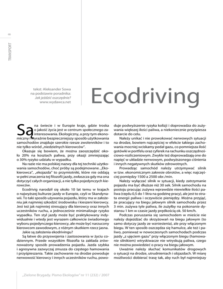 TRANSPORT tekst: Aleksander Sowa na podstawie poradnika: Jak jeździć oszczędnie? www.wydawca.net Ecodriving Są na świecie i w Europie kraje, gdzie troska o jakość życia jest w centrum społecznego zainteresowania. Ekologiczny, a przy tym ekonomiczny i wyraźnie bezpieczniejszy sposób użytkowania samochodów znajduje szerokie rzesze zwolenników i to nie tylko wśród „niedzielnych kierowców”. Okazuje się bowiem, że można zaoszczędzić około 20% na kosztach paliwa, przy okazji zmniejszając o 30% ryzyko udziału w wypadku. Na razie nie ma polskiej nazwy dla tej techniki użytkowania samochodów, choć próby są podejmowane. „Ekokierowca”, „ekojazda” to przymiotniki, które nie oddają w pełni znaczenia tej filozofii jazdy, zwłaszcza gdy ma ona dotyczyć całych organizacji, a nie tylko pojedynczych kierowców. Ecodrivig narodził się około 10 lat temu w krajach o najwyższej kulturze jazdy w Europie, czyli w Skandynawii. To taki sposób używania pojazdu, który ma w założeniu jak najmniej szkodzić środowisku i kieszeni kierowcy. Jest też jak najmniej stresujący dla kierowcy oraz innych uczestników ruchu, a jednocześnie minimalizuje ryzyko wypadku. Ten styl jazdy może być praktykowany indywidualnie i wtedy jest wyrazem całkowicie świadomego wyboru pojedynczego kierowcy, ale może być narzucony kierowcom zawodowym, z różnym skutkiem rzecz jasna. Jakie są założenia ekodrivingu? Są łatwe do przyswojenia i zastosowania w życiu codziennym. Przede wszystkim filozofia ta zakłada zrównoważony sposób prowadzenia pojazdu. Jazda szybka i agresywna zazwyczaj zmusza do częstego hamowania i przyśpieszania. Takie zachowanie na drodze powoduje nerwowość kierowcy i innych uczestników ruchu, powo- „Zielone Brygady. Pismo Ekologów” nr 11 (232) / 2007 duje podwyższenie ryzyka kolizji i doprowadza do zużywania większej ilości paliwa, a niekoniecznie przyśpiesza dotarcie do celu. Należy unikać i nie prowokować nerwowych sytuacji na drodze, bowiem najczęściej w efekcie takiego zachowania mocniej wciskamy pedał gazu, co pomniejsza ilość gotówki w portfelu oraz cyferek na rachunku oszczędnościowo-rozliczeniowym. Zwykle też doprowadzają one do napięć w układzie nerwowym, podwyższonego ciśnienia i innych negatywnych skutków zdrowotnych. Prowadząc samochód należy utrzymywać silnik w tzw. ekonomicznym zakresie obrotów, a więc najczęściej pomiędzy 1500 a 2500 obr./min. Należy wyłączać silnik w sytuacji, kiedy zatrzymanie pojazdu ma być dłuższe niż 30 sek. Silnik samochodu na postoju pracując zużywa wprawdzie niewielkie ilości paliwa (rzędu 0,5 do 1 litra na godzinę pracy), ale jest to strata energii paliwa i oczywiście pieniędzy. Można przyjąć, że pracujący na biegu jałowym silnik samochodu przez 3 min. zużywa tyle paliwa, ile zużyłby na pokonanie dystansu 1 km w czasie jazdy prędkością ok. 50 km/h. Podczas poruszania się samochodem w mieście nie należy dojeżdżać do skrzyżowań na biegu jałowym (to samo dotyczy jazdy ze wzniesienia), ale przy włączonym biegu. W ten sposób oszczędza się hamulce, ale też i paliwo, ponieważ w nowoczesnych samochodach podczas jazdy „z ujęciem gazu” przy włączonym biegu (hamowanie silnikiem) wtryskiwacze nie wtryskują paliwa, czego nie można powiedzieć o pracy na biegu jałowym. Uważnie należy słuchać komunikatów drogowych o sytuacji na drodze, utrudnieniach i objazdach. W miarę możliwości dobierać trasę tak, aby ruch był najmniejszy TRANSPORT www.texasfreeway.com np. rano. Tak samo w przypadku dłuższych wypraw, jak i pokonywanych często odcinków. Należy dbać o stan techniczny swojego samochodu. Sprawdzać regularnie ciśnienie w ogumieniu i dokonywać przeglądów zgodnie z zaleceniami producenta. Trzeba pamiętać, że każdy element wystający poza obrys samochodu to dodatkowa porcja paliwa potrzebna do jego poruszania się. Box na narty, bagażnik dachowy, uchwyt na rowery itd. to elementy, które powinieneś zdemontować, jeśli ich nie używasz. Nie warto wozić ze sobą w aucie starych gazet, butów do koszykówki, zabawek dzieci, butelek piwa i innych drobiazgów, które niepotrzebnie podnoszą wagę samochodu. Każde 10 kg dodatkowej masy to nie mniej niż 0,1 litra paliwa na 100 km. Nie wciskaj gazu przy zapalaniu silnika samochodu i nie rozgrzewaj go na postoju. Po zapaleniu silnika ruszaj natychmiast i jak najszybciej wrzucaj dwójkę. Silnik się rozgrzeje w czasie jazdy, bez straty paliwa. Biegi zmieniaj nim silnik osiągnie maksymalny moment obrotowy, który jest inny dla różnych samochodów. Przy hamowaniu silnikiem redukuj biegi wcześniej niż przy 1200 obr/min. Nie przekraczaj ekonomicznych prędkości, które zresztą często pokrywają się z dozwolonymi przez kodeks drogowy, wiec oszczędza się równocześnie na mandatach. Przyśpieszając, wciskaj pedał przyśpieszenia do 3/4. I tyle. To już wystarczy. Oto najważniejsze założenia filozofii ekodrivingu. Mam nadzieję, że przyjmie się ona również w naszym dzikim kraju, co zaprocentuje korzyścią dla środowiska naturalnego oraz naszego (jako uczestników ruchu drogowego) samopoczucia i oczywiście – kieszeni. „Zielone Brygady. Pismo Ekologów” nr 11 (232) / 2007