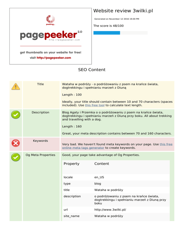 Website review 3wilki.pl Generated on November 12 2016 19:00 PM The score is 48/100 SEO Content Title Wataha w podróży - o podróżowaniu z psem na krańce świata, dogtrekkingu i spełnianiu marzeń z Diuną Length : 100 Ideally, your title should contain between 10 and 70 characters (spaces included). Use this free tool to calculate text length. Description Blog Agaty i Przemka o o podróżowaniu z psem na krańce świata, dogtrekkingu i spełnianiu marzeń z Diuną przy boku. All about trekking and travelling with a dog. Length : 160 Great, your meta description contains between 70 and 160 characters. Keywords Very bad. We haven't found meta keywords on your page. Use this free online meta tags generator to create keywords. Og Meta Properties Good, your page take advantage of Og Properties. Property Content locale en_US type blog title Wataha w podróży description o podróżowaniu z psem na krańce świata, dogtrekkingu i spełnianiu marzeń z Diuną przy boku url http://www.3wilki.pl/ site_name Wataha w podróży SEO Content image Headings http://www.3wilki.pl/?al2fb_image=1 H1 2 H2 16 H3 6 H4 0 H5 0 H6 0 [H1] [H1] Contact Us [H2] Z psem do pracy, czyli o tym, że niemożliwe nie istnieje… [H2] Wspinaczka lodowa z psem. Czyli dlaczego Słowacy to taki fajny naród [H2] Co się z nami dzieje, czyli o tym, że niezupełnie zeszliśmy na psy [H2] Pierwszy krok… [H2] To nie jest kraj dla psa, czyli o ciemniejszej stronie mocy [H2] Testy: przyczepka NordicCab 5-in-1 [H2] Jak karmić psa w podróży. Co lepsze: karma, a może mięso? [H2] Testy: buty Merrell Grassbow Sport GTX [H2] Jak podróżować we dwoje i nie zwariować [H2] Z prądem, czy pod prąd? Czyli jak zasilać elektronikę w podróży [H2] Łapy, łapy – cztery łapy… Czyli o pielęgnacji psich łap [H2] Puchar Dog Orient 2014 w Sobótce [H2] Testy: sakwy Crosso [H2] Podróż z dreszczykiem, czyli o tym, co zaskoczyło nas w drodze do Mongolii [H2] Grey Wolf Mongolia – Rowerem przez rosyjski Ałtaj [H2] Posts navigation [H3] Latest [H3] Zamów książkę z dedykacją [H3] Wygraliśmy m.in. [H3] Nagroda rowertouru – Podróż Roku 2014 [H3] Książka Górska Roku 2015 wg czytelników magazynu N.P.M. [H3] 1 Images We found 34 images on this web page. 7 alt attributes are empty or missing. Add alternative text so that search engines can better understand the content of your images. Text/HTML Ratio Ratio : 8% This page's ratio of text to HTML code is below 15 percent, this means that your website probably needs more text content. Flash Iframe Perfect, no Flash content has been detected on this page. Great, there are no Iframes detected on this page. SEO Links URL Rewrite Good. Your links looks friendly! Underscores in the URLs Perfect! No underscores detected in your URLs. In-page links We found a total of 29 links including 0 link(s) to files Statistics External Links : noFollow 0% External Links : Passing Juice 0% Internal Links 100% In-page links Anchor Type Juice Z psem do pracy, czyli o... Internal Passing Juice Wspinaczka lodowa z psem... Internal Passing Juice Co się z nami dzieje, c... Internal Passing Juice Pierwszy krok… Internal Passing Juice Menu Internal Passing Juice Agata Włodarczyk Internal Passing Juice To nie jest kraj dla psa, czyli o ciemniejszej stronie mocy Internal Passing Juice Testy: przyczepka NordicCab 5-in-1 Internal Passing Juice Przemo Internal Passing Juice Jak karmić psa w podróży. Co lepsze: karma, a może mięso? Internal Passing Juice Testy: buty Merrell Grassbow Sport GTX Internal Passing Juice Jak podróżować we dwoje i nie zwariować Internal Passing Juice Z prądem, czy pod prąd? Czyli jak zasilać elektronikę w podróży Internal Passing Juice Łapy, łapy – cztery łapy… Czyli o pielęgnacji psich łap Internal Passing Juice Puchar Dog Orient 2014 w Sobótce Internal Passing Juice In-page links Testy: sakwy Crosso Internal Passing Juice Podróż z dreszczykiem, czyli o tym, co zaskoczyło nas w drodze do Mongolii Internal Passing Juice Grey Wolf Mongolia – Rowerem przez rosyjski Ałtaj Internal Passing Juice 2 Internal Passing Juice 3 Internal Passing Juice 6 Internal Passing Juice Wataha w podróży Internal noFollow Pokazy Internal Passing Juice Publikacje Internal Passing Juice Mówią o nas Internal Passing Juice “Wataha w Podróży. Himalaje na czterech łapach” Internal Passing Juice Testy Internal Passing Juice Porady Internal Passing Juice Więcej... Internal Passing Juice SEO Keywords Keywords Cloud nie testy psem jak czyli more read podróży przemo nas Keywords Consistency Keyword Content more 8 read 8 testy 6 podróży 6 czyli 5 Title Keywords Description Headings Usability Url Domain : 3wilki.pl Length : 9 Favicon Great, your website has a favicon. Printability We could not find a Print-Friendly CSS. Language Good. Your declared language is en. Dublin Core This page does not take advantage of Dublin Core. Document Doctype HTML 5 Encoding Perfect. Your declared charset is UTF-8. W3C Validity Errors : 25 Warnings : 19 Email Privacy Great no email address has been found in plain text! Deprecated HTML Deprecated tags Occurrences <center> 1 Deprecated HTML tags are HTML tags that are no longer used. It is recommended that you remove or replace these HTML tags because they are now obsolete. Speed Tips Excellent, your website doesn't use nested tables. Too bad, your website is using inline styles. Too bad, your website has too many CSS files (more than 4). Too bad, your website has too many JS files (more than 6). Too bad, your website does not take advantage of gzip. Mobile Mobile Optimization Apple Icon Meta Viewport Tag Flash content Optimization XML Sitemap Great, your website has an XML sitemap. http://www.3wilki.pl/sitemap.xml http://www.3wilki.pl/sitemap-news.xml Robots.txt http://3wilki.pl/robots.txt Great, your website has a robots.txt file. Analytics Great, your website has an analytics tool. Google Analytics Powered by TCPDF (www.tcpdf.o