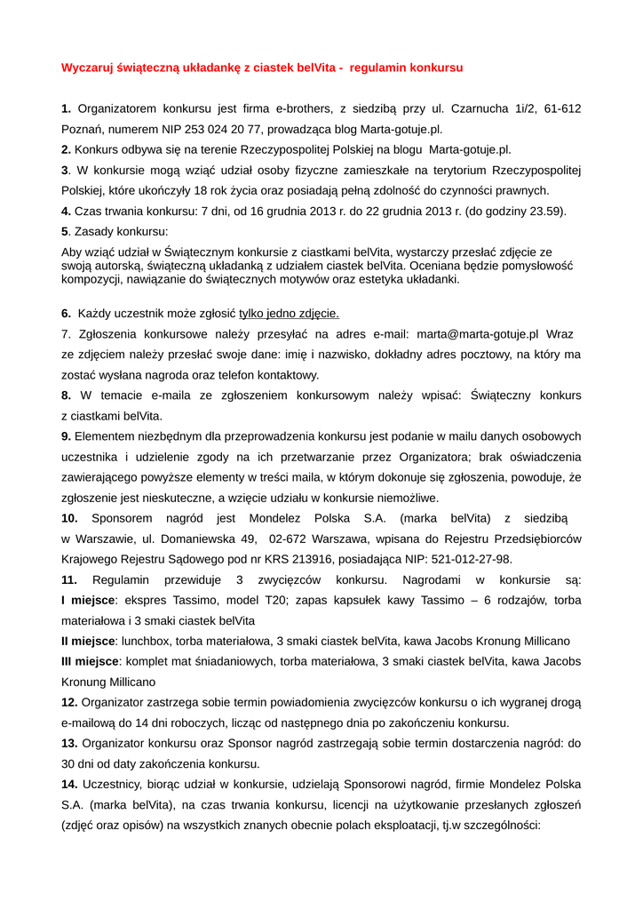 Wyczaruj świąteczną układankę z ciastek belVita - regulamin konkursu 1. Organizatorem konkursu jest firma e-brothers, z siedzibą przy ul. Czarnucha 1i/2, 61-612 Poznań, numerem NIP 253 024 20 77, prowadząca blog Marta-gotuje.pl. 2. Konkurs odbywa się na terenie Rzeczypospolitej Polskiej na blogu Marta-gotuje.pl. 3. W konkursie mogą wziąć udział osoby fizyczne zamieszkałe na terytorium Rzeczypospolitej Polskiej, które ukończyły 18 rok życia oraz posiadają pełną zdolność do czynności prawnych. 4. Czas trwania konkursu: 7 dni, od 16 grudnia 2013 r. do 22 grudnia 2013 r. (do godziny 23.59). 5. Zasady konkursu: Aby wziąć udział w Świątecznym konkursie z ciastkami belVita, wystarczy przesłać zdjęcie ze swoją autorską, świąteczną układanką z udziałem ciastek belVita. Oceniana będzie pomysłowość kompozycji, nawiązanie do świątecznych motywów oraz estetyka układanki. 6. Każdy uczestnik może zgłosić tylko jedno zdjęcie. 7. Zgłoszenia konkursowe należy przesyłać na adres e-mail: [email protected] Wraz ze zdjęciem należy przesłać swoje dane: imię i nazwisko, dokładny adres pocztowy, na który ma zostać wysłana nagroda oraz telefon kontaktowy. 8. W temacie e-maila ze zgłoszeniem konkursowym należy wpisać: Świąteczny konkurs z ciastkami belVita. 9. Elementem niezbędnym dla przeprowadzenia konkursu jest podanie w mailu danych osobowych uczestnika i udzielenie zgody na ich przetwarzanie przez Organizatora; brak oświadczenia zawierającego powyższe elementy w treści maila, w którym dokonuje się zgłoszenia, powoduje, że zgłoszenie jest nieskuteczne, a wzięcie udziału w konkursie niemożliwe. 10. Sponsorem nagród jest Mondelez Polska S.A. (marka belVita) z siedzibą w Warszawie, ul. Domaniewska 49, 02-672 Warszawa, wpisana do Rejestru Przedsiębiorców Krajowego Rejestru Sądowego pod nr KRS 213916, posiadająca NIP: 521-012-27-98. 11. Regulamin przewiduje 3 zwycięzców konkursu. Nagrodami w konkursie są: I miejsce: ekspres Tassimo, model T20; zapas kapsułek kawy Tassimo – 6 rodzajów, torba materiałowa i 3 smaki ciastek belVita II miejsce: lunchbox, torba materiałowa, 3 smaki ciastek belVita, kawa Jacobs Kronung Millicano III miejsce: komplet mat śniadaniowych, torba materiałowa, 3 smaki ciastek belVita, kawa Jacobs Kronung Millicano 12. Organizator zastrzega sobie termin powiadomienia zwycięzców konkursu o ich wygranej drogą e-mailową do 14 dni roboczych, licząc od następnego dnia po zakończeniu konkursu. 13. Organizator konkursu oraz Sponsor nagród zastrzegają sobie termin dostarczenia nagród: do 30 dni od daty zakończenia konkursu. 14. Uczestnicy, biorąc udział w konkursie, udzielają Sponsorowi nagród, firmie Mondelez Polska S.A. (marka belVita), na czas trwania konkursu, licencji na użytkowanie przesłanych zgłoszeń (zdjęć oraz opisów) na wszystkich znanych obecnie polach eksploatacji, tj.w szczególności: a) w zakresie utrwalania i zwielokrotniania utworu – wytwarzanie dowolną techniką egzemplarzy utworu, w tym techniką drukarską, reprograficzną, zapisu magnetycznego, techniką cyfrową oraz innymi znanymi w chwili przeniesienia praw technikami, wprowadzanie do pamięci komputera; b) w zakresie obrotu oryginałem albo egzemplarzami, na których utwór utrwalono – wprowadzanie do obrotu w kraju i zagranicą, użyczenie lub najem oryginału albo egzemplarzy; c) w zakresie rozpowszechniania utworu w sposób inny niż określony w pkt. b) –publiczne wykonanie, wystawienie, wyświetlenie, odtworzenie oraz nadawanie i reemitowanie, a także publiczne udostępnianie utworu w taki sposób, aby każdy mógł mieć do niego dostęp w miejscu i w czasie przez siebie wybranym, w tym w sieciach Internet, extranet oraz intranet, a także w mediach społecznościowych. 15. Przystąpienie do konkursu jest jednoznaczne z akceptacją regulaminu w całości. W przypadku wszelkich pytań odnośnie konkursu, należy z Organizatorem konkursu pod adresem e-mail: [email protected]. się kontaktować