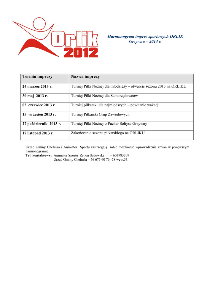 Harmonogram imprez sportowych ORLIK Grzywna – 2013 r. Termin imprezy Nazwa imprezy 24 marzec 2013 r. Turniej Piłki Nożnej dla młodzieży – otwarcie sezonu 2013 na ORLIKU 30 maj 2013 r. Turniej Piłki Nożnej dla Samorządowców 02 czerwiec 2013 r. Turniej piłkarski dla najmłodszych – powitanie wakacji 15 wrzesień 2013 r. Turniej Piłkarski Grup Zawodowych 27 październik 2013 r. Turniej Piłki Nożnej o Puchar Sołtysa Grzywny 17 listopad 2013 r. Zakończenie sezonu piłkarskiego na ORLIKU Urząd Gminy Chełmża i Animator Sportu zastrzegają sobie możliwość wprowadzenia zmian w powyższym harmonogramie. Tel. kontaktowy: Animator Sportu Zenon Sadowski – 603983309 Urząd Gminy Chełmża – 56 675 60 76 -78 wew.53.