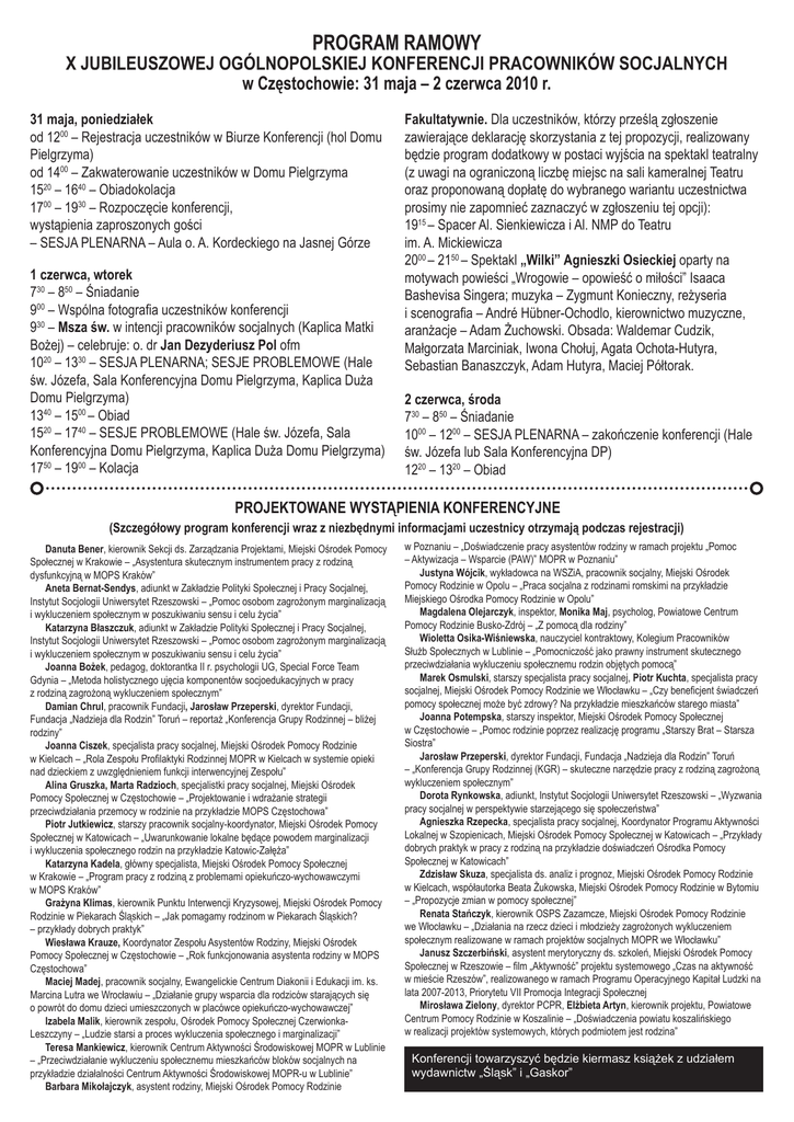 PROGRAM RAMOWY X JUBILEUSZOWEJ OGÓLNOPOLSKIEJ KONFERENCJI PRACOWNIKÓW SOCJALNYCH w Częstochowie: 31 maja – 2 czerwca 2010 r. 31 maja, poniedziałek od 1200 – Rejestracja uczestników w Biurze Konferencji (hol Domu Pielgrzyma) od 1400 – Zakwaterowanie uczestników w Domu Pielgrzyma 1520 – 1640 – Obiadokolacja 1700 – 1930 – Rozpoczęcie konferencji, wystąpienia zaproszonych gości – SESJA PLENARNA – Aula o. A. Kordeckiego na Jasnej Górze 1 czerwca, wtorek 730 – 850 – Śniadanie 900 – Wspólna fotografia uczestników konferencji 930 – Msza św. w intencji pracowników socjalnych (Kaplica Matki Bożej) – celebruje: o. dr Jan Dezyderiusz Pol ofm 1020 – 1330 – SESJA PLENARNA; SESJE PROBLEMOWE (Hale św. Józefa, Sala Konferencyjna Domu Pielgrzyma, Kaplica Duża Domu Pielgrzyma) 1340 – 1500 – Obiad 1520 – 1740 – SESJE PROBLEMOWE (Hale św. Józefa, Sala Konferencyjna Domu Pielgrzyma, Kaplica Duża Domu Pielgrzyma) 1750 – 1900 – Kolacja Fakultatywnie. Dla uczestników, którzy prześlą zgłoszenie zawierające deklarację skorzystania z tej propozycji, realizowany będzie program dodatkowy w postaci wyjścia na spektakl teatralny (z uwagi na ograniczoną liczbę miejsc na sali kameralnej Teatru oraz proponowaną dopłatę do wybranego wariantu uczestnictwa prosimy nie zapomnieć zaznaczyć w zgłoszeniu tej opcji): 1915 – Spacer Al. Sienkiewicza i Al. NMP do Teatru im. A. Mickiewicza 2000 – 2150 – Spektakl „Wilki” Agnieszki Osieckiej oparty na motywach powieści „Wrogowie – opowieść o miłości” Isaaca Bashevisa Singera; muzyka – Zygmunt Konieczny, reżyseria i scenografia – André Hübner-Ochodlo, kierownictwo muzyczne, aranżacje – Adam Żuchowski. Obsada: Waldemar Cudzik, Małgorzata Marciniak, Iwona Chołuj, Agata Ochota-Hutyra, Sebastian Banaszczyk, Adam Hutyra, Maciej Półtorak. 2 czerwca, środa 730 – 850 – Śniadanie 1000 – 1200 – SESJA PLENARNA – zakończenie konferencji (Hale św. Józefa lub Sala Konferencyjna DP) 1220 – 1320 – Obiad PROJEKTOWANE WYSTĄPIENIA KONFERENCYJNE (Szczegółowy program konferencji wraz z niezbędnymi informacjami uczestnicy otrzymają podczas rejestracji) Danuta Bener, kierownik Sekcji ds. Zarządzania Projektami, Miejski Ośrodek Pomocy Społecznej w Krakowie – „Asystentura skutecznym instrumentem pracy z rodziną dysfunkcyjną w MOPS Kraków” Aneta Bernat-Sendys, adiunkt w Zakładzie Polityki Społecznej i Pracy Socjalnej, Instytut Socjologii Uniwersytet Rzeszowski – „Pomoc osobom zagrożonym marginalizacją i wykluczeniem społecznym w poszukiwaniu sensu i celu życia” Katarzyna Błaszczuk, adiunkt w Zakładzie Polityki Społecznej i Pracy Socjalnej, Instytut Socjologii Uniwersytet Rzeszowski – „Pomoc osobom zagrożonym marginalizacją i wykluczeniem społecznym w poszukiwaniu sensu i celu życia” Joanna Bożek, pedagog, doktorantka II r. psychologii UG, Special Force Team Gdynia – „Metoda holistycznego ujęcia komponentów socjoedukacyjnych w pracy z rodziną zagrożoną wykluczeniem społecznym” Damian Chrul, pracownik Fundacji, Jarosław Przeperski, dyrektor Fundacji, Fundacja „Nadzieja dla Rodzin” Toruń – reportaż „Konferencja Grupy Rodzinnej – bliżej rodziny” Joanna Ciszek, specjalista pracy socjalnej, Miejski Ośrodek Pomocy Rodzinie w Kielcach – „Rola Zespołu Profilaktyki Rodzinnej MOPR w Kielcach w systemie opieki nad dzieckiem z uwzględnieniem funkcji interwencyjnej Zespołu” Alina Gruszka, Marta Radzioch, specjalistki pracy socjalnej, Miejski Ośrodek Pomocy Społecznej w Częstochowie – „Projektowanie i wdrażanie strategii przeciwdziałania przemocy w rodzinie na przykładzie MOPS Częstochowa” Piotr Jutkiewicz, starszy pracownik socjalny-koordynator, Miejski Ośrodek Pomocy Społecznej w Katowicach – „Uwarunkowanie lokalne będące powodem marginalizacji i wykluczenia społecznego rodzin na przykładzie Katowic-Załęża” Katarzyna Kadela, główny specjalista, Miejski Ośrodek Pomocy Społecznej w Krakowie – „Program pracy z rodziną z problemami opiekuńczo-wychowawczymi w MOPS Kraków” Grażyna Klimas, kierownik Punktu Interwencji Kryzysowej, Miejski Ośrodek Pomocy Rodzinie w Piekarach Śląskich – „Jak pomagamy rodzinom w Piekarach Śląskich? – przykłady dobrych praktyk” Wiesława Krauze, Koordynator Zespołu Asystentów Rodziny, Miejski Ośrodek Pomocy Społecznej w Częstochowie – „Rok funkcjonowania asystenta rodziny w MOPS Częstochowa” Maciej Madej, pracownik socjalny, Ewangelickie Centrum Diakonii i Edukacji im. ks. Marcina Lutra we Wrocławiu – „Działanie grupy wsparcia dla rodziców starających się o powrót do domu dzieci umieszczonych w placówce opiekuńczo-wychowawczej” Izabela Malik, kierownik zespołu, Ośrodek Pomocy Społecznej CzerwionkaLeszczyny – „Ludzie starsi a proces wykluczenia społecznego i marginalizacji” Teresa Mankiewicz, kierownik Centrum Aktywności Środowiskowej MOPR w Lublinie – „Przeciwdziałanie wykluczeniu społecznemu mieszkańców bloków socjalnych na przykładzie działalności Centrum Aktywności Środowiskowej MOPR-u w Lublinie” Barbara Mikołajczyk, asystent rodziny, Miejski Ośrodek Pomocy Rodzinie w Poznaniu – „Doświadczenie pracy asystentów rodziny w ramach projektu „Pomoc – Aktywizacja – Wsparcie (PAW)” MOPR w Poznaniu” Justyna Wójcik, wykładowca na WSZiA, pracownik socjalny, Miejski Ośrodek Pomocy Rodzinie w Opolu – „Praca socjalna z rodzinami romskimi na przykładzie Miejskiego Ośrodka Pomocy Rodzinie w Opolu” Magdalena Olejarczyk, inspektor, Monika Maj, psycholog, Powiatowe Centrum Pomocy Rodzinie Busko-Zdrój – „Z pomocą dla rodziny” Wioletta Osika-Wiśniewska, nauczyciel kontraktowy, Kolegium Pracowników Służb Społecznych w Lublinie – „Pomocniczość jako prawny instrument skutecznego przeciwdziałania wykluczeniu społecznemu rodzin objętych pomocą” Mare