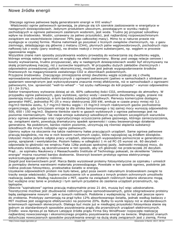 MPGK Zgorzelec Nowe źródła energii Dlaczego ogniwa paliwowe będą generatorami energii w XXI wieku? Właściwości ogniw paliwowych sprawiają, że planuje się ich szerokie zastosowanie w energetyce w następnych dziesięcioleciach. Jedynym produktem ubocznym, powstającym w wyniku reakcji zachodzących w ogniwie paliwowym zasilanym wodorem, jest woda. Trudno jej przypisać szkodliwy wpływ na środowisko. Wodór, uznawany za paliwo przyszłości, jest najbardziej rozpowszechnionym związkiem we wszechświecie (stanowi 79% jego całkowitej masy). Mimo to w naturze prawie nie występuje w czystej formie. Można natomiast go pozyskać z licznych związków chemicznych, np. z gazu ziemnego, składającego się głównie z metanu (CH4), płynnych paliw węglowodorowych, pochodnych ropy naftowej lub z wody (pary wodnej), na drodze reakcji z innymi substancjami, np. węglem w procesie zgazowania węgla. Wszystkie znane nam sposoby pozyskiwania wodoru prowadzą do wytwarzania się dwutlenku węgla, którego emisję należy ograniczać ze względu na efekt cieplarniany. Biorąc pod uwagę relacje cenowe i koszty wytwarzania, trudno przypuszczać, aby w następnych dziesięcioleciach wodór byf otrzymywany na skalę przemysłową inaczej, niż z surowców kopalnych. W przypadku dużych zakładów chemicznych i odpowiednio prowadzonej polityki ekonomicznej, możliwe jest jednak wygospodarowanie środków finansowych na magazynowanie zestalonego CO2 w zbiornikach podziemnych. Przyjazne środowisku Znaczącego zmniejszenia emisji dwutlenku węgla oczekuje się z chwilą wprowadzenia samochodów elektrycznych z ogniwami paliwowymi (paliwo w samochodach z silnikami ze spalaniem wewnętrznym jest wykorzystywane znacznie mniej efektywnie, niż w samochodach z ogniwami paliwowymi, tzw. sprawność "well-to-wheel" - "od szybu naftowego do kół pojazdu" - wynosi odpowiednio 15 i 24-31%). Sektor transportowy wytwarza dzisiaj aż ok. 60% całkowitej ilości CO2, emitowanego do atmosfery. W przypadku ogniw paliwowych, gazy wylotowe, oprócz wody i ewentualnie dwutlenku węgla, prawie nie zawierają innych substancji, a tym bardziej substancji szkodliwych. Pierwszy komercyjnie dostępny generator PAFC, jednostka PC-25 o mocy elektrycznej 200 kW, emituje w czasie pracy mniej niż 3,1 mg/m3 tlenków azotu, 5,7 mg/m3 tlenku węgla i 15 mg/m3 innych reaktywnych gazów pochodzenia organicznego, gdy tymczasem emisje te dla silnika benzynowego o tej samej mocy wynoszą odpowiednio 500, 650 i 150 mg/m3. Stężenie tlenków siarki w gazach wylotowych z ogniwa paliwowego jest na poziomie niemierzalnym. Tak niskie emisje substancji szkodliwych są wynikiem szczególnych warunków pracy ogniwa paliwowego oraz rygorystycznego oczyszczania paliwa gazowego, którego zanieczyszczenia, np. związkami siarki, powodują dramatyczny spadek sprawności i czasu bezawaryjnego działania generatora. Na podobnym, bardzo niskim poziomie, utrzymują się również stężenia substancji szkodliwych dla innych rodzajów ogniw paliwowych. Ujemny wpływ na otoczenie ma także nadmierny hałas pracujących urządzeń. Same ogniwa paliwowe pracują bezgłośnie, nie ma w nich bowiem ruchomych części, które najczęściej są źródłem dźwięków. Usłyszeć można jedynie odgłos pracy urządzeń, stanowiących wyposażenie pomocnicze w generatorze: pomp, sprężarek i wentylatorów. Poziom hałasu w odległości 1 m od PC-25 wynosi ok. 60 decybeli odpowiada to głośności we wnętrzu Fiata 126p podczas spokojnej jazdy. Jednostki mniejszej mocy, do kilkunastu kilowatów, są skonstruowane w ten sposób, aby ich głośność nie przekraczała 20 decybeli. Prąd... ze szpinaku Naukowcy z Massachusetts Institute of Technology pokazali, że określenie "zielona energia" można rozumieć bardzo dosłownie. Stworzyli bowiem prototyp ogniwa elektrycznego wykorzystującego proteiny roślinne. Zespół pod kierownictwem prof. Marca Baldo wyizolował proteiny fotosyntetyczne ze szpinaku i umieścił je pomiędzy dwiema warstwami materiału przewodzącego. Powstałe w ten sposób ogniwo, podobnie jak roślina podczas fotosyntezy, przekształca światło w energię. Uzyskanie odpowiednich protein nie było łatwe, gdyż poza swoim naturalnym środowiskiem związki te traciły swoje właściwości. Dopiero umieszczenie ich w powłoce z innych protein ochronnych umożliwiło realizację zadania. Według naukowców z MIT, oparte na związkach roślinnych baterie słoneczne mogą być wydajne oraz tanie w produkcji i tym samym przydatne do zasilania urządzeń przenośnych, np. laptopów. Obecnie "szpinakowe" ogniwa pracują maksymalnie przez 21 dni, muszą być więc udoskonalone. Teoretycznie możliwe jest zbudowanie roślinnych ogniw samoodnawialnych, gdzie zdegradowane proteiny będą zastępowane nowymi - jak w żywych roślinach. Podobnie z wydajnością: tu też jest jeszcze sporo do zrobienia. Prototypy zamieniają na prąd tylko 12% absorbowanego światła, jednak według badaczy z MIT możliwe jest osiągnięcie efektywności na poziomie 20%. Byłby to wynik lepszy niż w standardowych krzemowych ogniwach słonecznych. Dlatego być może już w niedługiej przyszłości fotosynteza stanie się jednym ze standardowych sposobów pozyskiwania prądu dla przenośnych urządzeń elektronicznych. Źródło: www.4press.pl za Nature Latające źródła prądu Firma Sky WindPower rozpoczęła realizację najbardziej nowoczesnego i ekonomicznego projektu pozyskiwania energii na świecie. Większość znanych dotychczas nowoczesnych sposobów pozyskiwania energii na dużą skalę związanych jest z ziemią. Firma http://www.mpgk.zgorzelec.pl Kreator PDF Utworzono 4 March, 2017, 09:54 MPGK Zgorzelec wpadła na pomysł, żeby poszukać jej na dużych wysokościach. Nie jest tajemnicą, że na dużych wysokościach, wiele kilometrów nad powierzchnią naszej planety występują wiatry, których energia bez najmniejszego problemu starczyłaby na zaspok