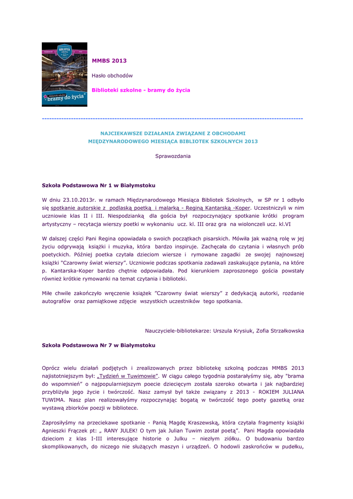 MMBS 2013 Hasło obchodów Biblioteki szkolne - bramy do życia -----------------------------------------------------------------------------------------------------------NAJCIEKAWSZE DZIAŁANIA ZWIĄZANE Z OBCHODAMI MIĘDZYNARODOWEGO MIESIĄCA BIBLIOTEK SZKOLNYCH 2013 Sprawozdania Szkoła Podstawowa Nr 1 w Białymstoku W dniu 23.10.2013r. w ramach Międzynarodowego Miesiąca Bibliotek Szkolnych, w SP nr 1 odbyło się spotkanie autorskie z podlaską poetką i malarką - Reginą Kantarską -Koper. Uczestniczyli w nim uczniowie klas II i III. Niespodzianką dla gościa był rozpoczynający spotkanie krótki program artystyczny – recytacja wierszy poetki w wykonaniu ucz. kl. III oraz gra na wiolonczeli ucz. kl.VI W dalszej części Pani Regina opowiadała o swoich początkach pisarskich. Mówiła jak ważną rolę w jej życiu odgrywają książki i muzyka, która bardzo inspiruje. Zachęcała do czytania i własnych prób poetyckich. Później poetka czytała dzieciom wiersze i rymowane zagadki ze swojej najnowszej książki "Czarowny świat wierszy”. Uczniowie podczas spotkania zadawali zaskakujące pytania, na które p. Kantarska-Koper bardzo chętnie odpowiadała. Pod kierunkiem zaproszonego gościa powstały również krótkie rymowanki na temat czytania i biblioteki. Miłe chwile zakończyło wręczenie książek ”Czarowny świat wierszy” z dedykacją autorki, rozdanie autografów oraz pamiątkowe zdjęcie wszystkich uczestników tego spotkania. Nauczyciele-bibliotekarze: Urszula Krysiuk, Zofia Strzałkowska Szkoła Podstawowa Nr 7 w Białymstoku Oprócz wielu działań podjętych i zrealizowanych przez bibliotekę szkolną podczas MMBS 2013 najistotniejszym był: „Tydzień w Tuwimowie”. W ciągu całego tygodnia postarałyśmy się, aby "brama do wspomnień” o najpopularniejszym poecie dziecięcym została szeroko otwarta i jak najbardziej przybliżyła jego życie i twórczość. Nasz zamysł był także związany z 2013 - ROKIEM JULIANA TUWIMA. Nasz plan realizowałyśmy rozpoczynając bogatą w twórczość tego poety gazetką oraz wystawą zbiorków poezji w bibliotece. Zaprosiłyśmy na przeciekawe spotkanie - Panią Magdę Kraszewską, która czytała fragmenty książki Agnieszki Frączek pt: „ RANY JULEK! O tym jak Julian Tuwim został poetą”. Pani Magda opowiadała dzieciom z klas I-III interesujące historie o Julku – niezłym ziółku. O budowaniu bardzo skomplikowanych, do niczego nie służących maszyn i urządzeń. O hodowli zaskrońców w pudełku, zaklinaniu kamieni i… nieudanym wysadzeniu w powietrze pewnej łódzkiej kamienicy. Dzieci dowiedziały się, że właśnie dzięki tym licznym pasjom Julek został poetą. Dzieci również bawiły się wesoło na tym spotkaniu: wycinały węże i odgadywały tytuły znanych i mniej znanych wierszy Tuwima. Najważniejszym przedsięwzięciem, do którego dzieci z Koła Bibliotecznego przygotowywały się od dłuższego czasu było przedstawienie pt: „Ptasie radio”. Natomiast bibliotekarki (Joanna Sopek i Ałła Bojarczyk) przygotowały prezentację multimedialną pt: „ Wspomnienie o Julianie Tuwimie” i w połączeniu z piosenkami z tekstami poety w różnych aranżacjach, wykonanych przez znanych i nieznanych piosenkarzy – wszystko pokazały na spotkaniu z klasami czwartymi i Panią Dyrektor naszej szkoły. Przy tej okazji nauczycielki bibliotekarki napisały własne wiersze inspirowane twórczością J. Tuwima. O to one: Tuwimowe tralalotki DYZIO MARZYCIEL marzy w AEROPLANIE I pisze LIST DO WSZYSTKICH DZIECI W PEWNEJ BARDZO WAŻNEJ SPRAWIE Gdyby z Afryki do WARSZAWY Przyjechał murzynek BAMBO RAZ, DWA TRZY.. i poznałby Polskie ABECADŁO. A na dworcu stałaby LOKOMOTYWA A w niej CUDA I DZIWY i świeże WARZYWA GRZEŚ , który chodził przez wieś Głośno śpiewa znaną pieśń W tańcu krążą DWA MICHAŁY ZOSIA SAMOSIA ma różowe OKULARY Głupi GABRYŚ fruwa jak SPÓŹNIONY SŁOWIK Piesek DŻOŃCIO miauczy niby chory KOTEK RZEPKĘ ciągnie SŁOŃ TRĄBALSKI, A za nim stoi RYCERZ KRZYKALSKI Babka z kurką siedzą na stole I liczą oka w rosole. PAN MALUŚKIEWICZ śpiewa - tralaloryb !!! PAN TRALALINSKI wtóruje mu - WIELORYB!!! PTASIE RADIO nadaje audycję: Śpiewy w brzozowym gaju rozpędza policja A jak głoszą PTASIE PLOTKI To są Tuwimowe tralalotki. Ałła Bojarczyk Tuwimowy sen… Raz była sobie ZOSIA mała Co mama ją SAMOSIA nazywała Kiedyś Zosia AEROPLANEM podróżowała A przy tym CUDA I DZIWY opowiadała Pewnego razu w podróży do WARSZAWY DWA WIATRY Zosię porwały Wiały, szalały aż do Afryki ja zabrały, Tam murzynka BAMBO spotkała I na plaży z nim Mambo pląsała. SŁOŃ TRĄBALSKI swą pamięć wytęża Aż go Zosia szykuje na męża. Ważne były SŁOWA, SŁUFKA jak mówiła mądra mrówka „Droga Zosiu czas do domu Nie mąć w głowie już nikomu” Zosia więc w podróż powrotną wyrusza Nawet wielka woda jej nie wzrusza PAN MALUŚKIEWICZ na pomoc zmierza W oceanie już widzą wielory-zwierza. Do kraju powraca LOKOMOTYWĄ Przez góry, przez tunel, przez pola i las I spieszy się, spieszy, by zdążyć na czas Minęła już RZECZKĘ – błyszczącą wstążeczkę.. I małą wioseczkę gdzie piasek w woreczku GRZEŚ niesie.. Widziała z daleka DYZIA co marzył I DZIECI W POLU z ogromną RZEPKĄ - Jędrną i krzepką Co dziaduniowi wyciągnąć się zdarzy. Nagle świst, nagle gwizd już nasza Zosia do domu przybywa A PTASIE RADIO audycję nagrywa: Kogut dzielnie nadał wiadomość, Że skończył się Zosi sen jegomość… Joanna Sopek Twórczość własna nauczycielek została wykorzystana do przeprowadzenia quizu wśród uczestników spotkania. Dzieci miały za zadanie w tych wierszykach odnaleźć jak najwięcej tytułów wierszy Tuwima. Była przy tym przednia zabawa. Nie obyło się też bez drobnych upominków dla zwycięzców. Twórczynie otrzymały gromkie brawa od dzieci, a od Pani Dyrektor słowa uznania za ciekawą prezentację. ( prezentacja i zd
