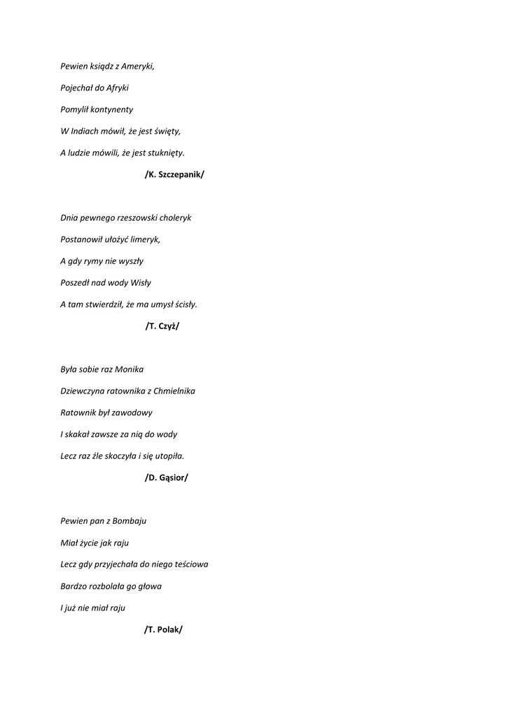 Pewien ksiądz z Ameryki, Pojechał do Afryki Pomylił kontynenty W Indiach mówił, że jest święty, A ludzie mówili, że jest stuknięty. /K. Szczepanik/ Dnia pewnego rzeszowski choleryk Postanowił ułożyć limeryk, A gdy rymy nie wyszły Poszedł nad wody Wisły A tam stwierdził, że ma umysł ścisły. /T. Czyż/ Była sobie raz Monika Dziewczyna ratownika z Chmielnika Ratownik był zawodowy I skakał zawsze za nią do wody Lecz raz źle skoczyła i się utopiła. /D. Gąsior/ Pewien pan z Bombaju Miał życie jak raju Lecz gdy przyjechała do niego teściowa Bardzo rozbolała go głowa I już nie miał raju /T. Polak/ Jedna pani z dachu Zobaczyła cień wielkiego gmachu Przestraszyła się niemiłosiernie I spadła na kłujące ciernie A cień gmachu był cieniem jej dachu. /P. Urbanik/ Pewnego razu pan zza Odry Starał się być bardzo szczodry Tak go ludzie namawiali, Że wszystko od niego zabrali Został mu tylko grosz, którym rzucił w kosz. /K. Grużewska/ Pewien pies ze schroniska Oglądał ludzi z bliska A jedna pani mu dała jeść, Więc się zakochał w niej na śmierć Morał z tego taki, nie dokarmiaj psiarni. /K. Dec/ Pewien chłopiec z Bejgoły Codziennie wpadał w doły Pomimo że były płytkie Wyjście nie było szybkie I tak żył chłop w Bejgole. /M. Łagowski/ Pewna pani z Francji Przeciwna była elegancji Ludzie jej nie lubili I z Francji ją wygonili A ona chciała być modna. /A. Lekowska/ Pewna kobieta z Poznania Zmieniła się nie do poznania Po farbie, którą do włosów miała Całkiem, biedaczka, wyłysiała Teraz w peruce chodzić musi. /N. Szeligowska/