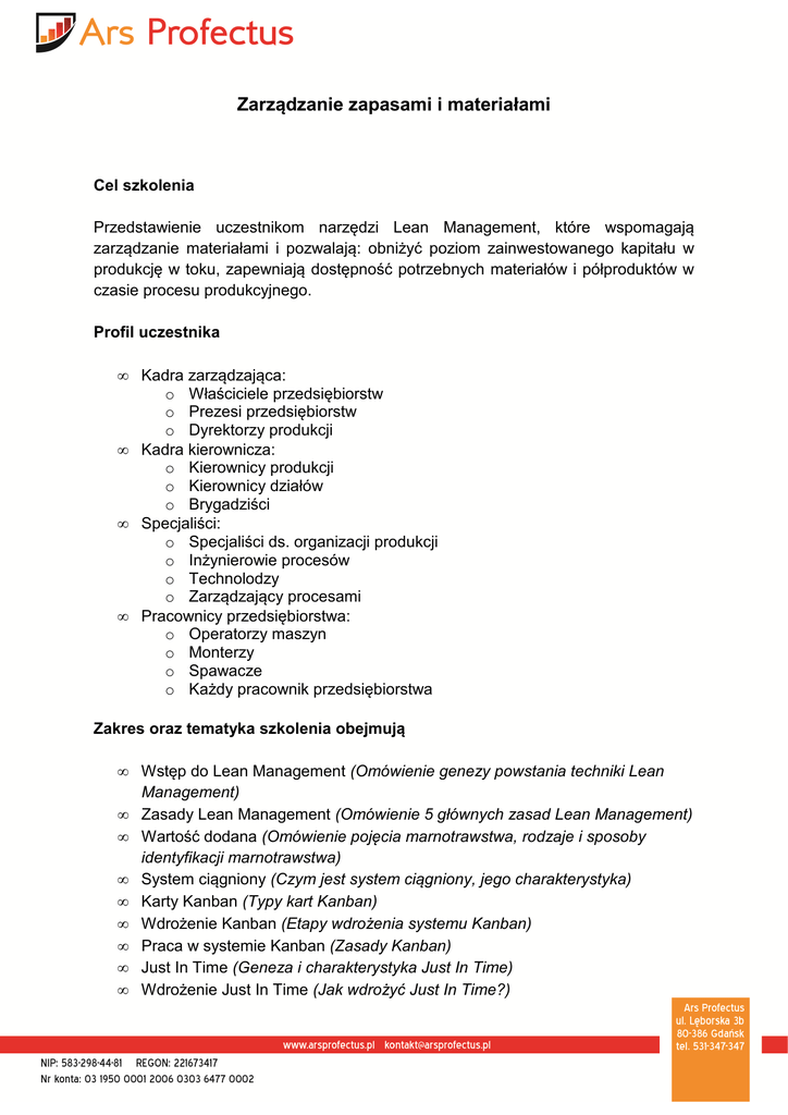 Zarządzanie zapasami i materiałami Cel szkolenia Przedstawienie uczestnikom narzędzi Lean Management, które wspomagają zarządzanie materiałami i pozwalają: obniżyć poziom zainwestowanego kapitału w produkcję w toku, zapewniają dostępność potrzebnych materiałów i półproduktów w czasie procesu produkcyjnego. Profil uczestnika • • • • Kadra zarządzająca: o Właściciele przedsiębiorstw o Prezesi przedsiębiorstw o Dyrektorzy produkcji Kadra kierownicza: o Kierownicy produkcji o Kierownicy działów o Brygadziści Specjaliści: o Specjaliści ds. organizacji produkcji o Inżynierowie procesów o Technolodzy o Zarządzający procesami Pracownicy przedsiębiorstwa: o Operatorzy maszyn o Monterzy o Spawacze o Każdy pracownik przedsiębiorstwa Zakres oraz tematyka szkolenia obejmują • • • • • • • • • Wstęp do Lean Management (Omówienie genezy powstania techniki Lean Management) Zasady Lean Management (Omówienie 5 głównych zasad Lean Management) Wartość dodana (Omówienie pojęcia marnotrawstwa, rodzaje i sposoby identyfikacji marnotrawstwa) System ciągniony (Czym jest system ciągniony, jego charakterystyka) Karty Kanban (Typy kart Kanban) Wdrożenie Kanban (Etapy wdrożenia systemu Kanban) Praca w systemie Kanban (Zasady Kanban) Just In Time (Geneza i charakterystyka Just In Time) Wdrożenie Just In Time (Jak wdrożyć Just In Time?) Czas szkolenia: 8 godzin Każdy uczestnik otrzyma zaświadczenie o szkoleniu Opis koncepcji Dużą częścią kosztów ponoszonych w przedsiębiorstwach są wysokie stany magazynowe. Zarówno wyrobów gotowych, jak i materiałów do produkcji czy też materiałów, które są obecnie w produkcji. Narzędzia Kanban i Just In Time pozwalają usprawnić te procesy. Kanban to sygnał, który przekazuje informacje o potrzebie oraz instrukcje produkcji lub pobrania części w systemie ssącym. Just In Time to system produkcji, w którym produkowane i dostarczane jest tylko i wyłącznie to co jest potrzebne, kiedy jest potrzebne i jedynie w potrzebnej ilości. Wprowadzenie tych narzędzi pozwala zmniejszyć wysokość kapitału zaangażowanego w produkcję (w materiały, w wyroby gotowe).